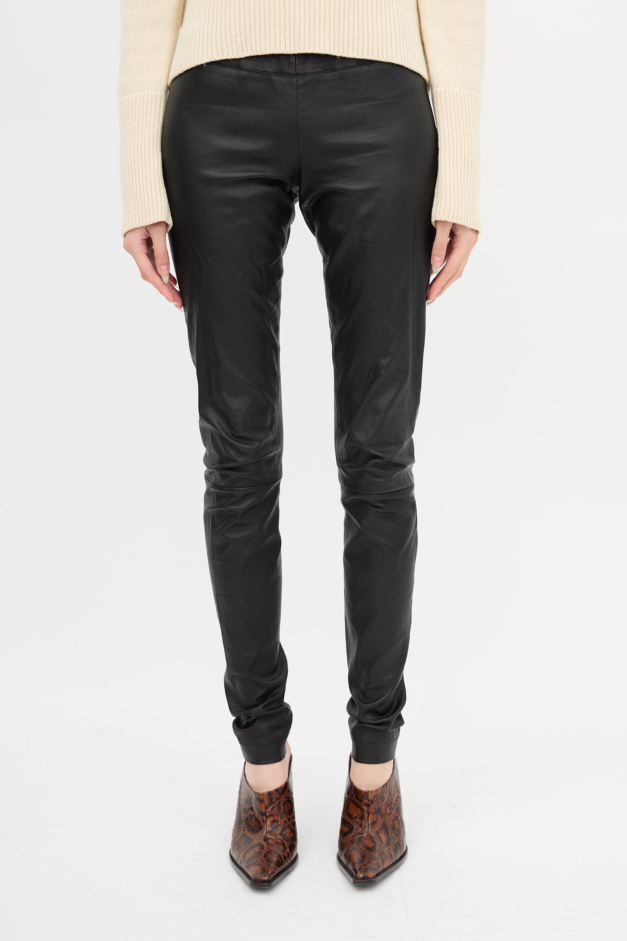 Pre-owned The Row black stretch leather leggings featuring elasticized waist and skinny leg.