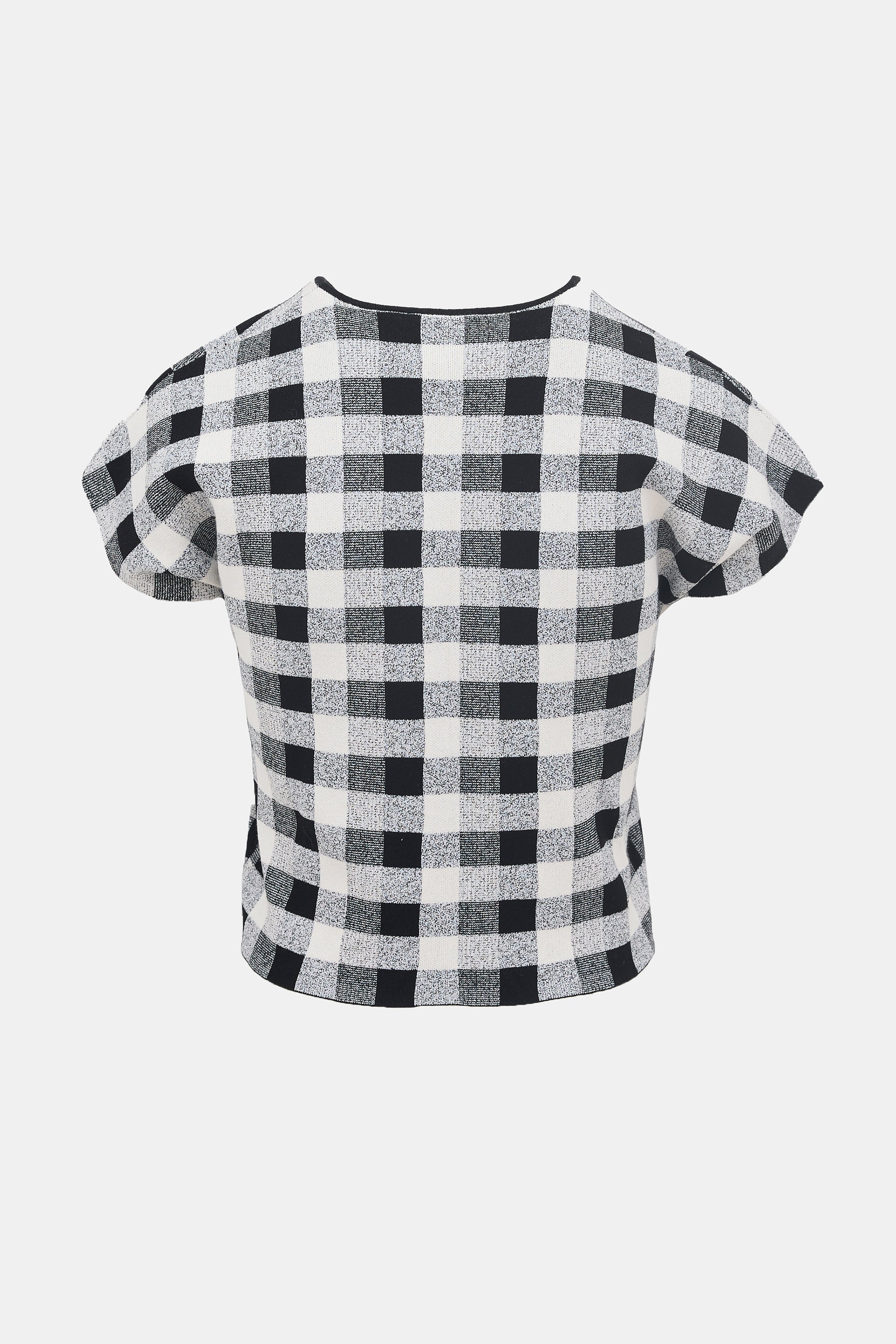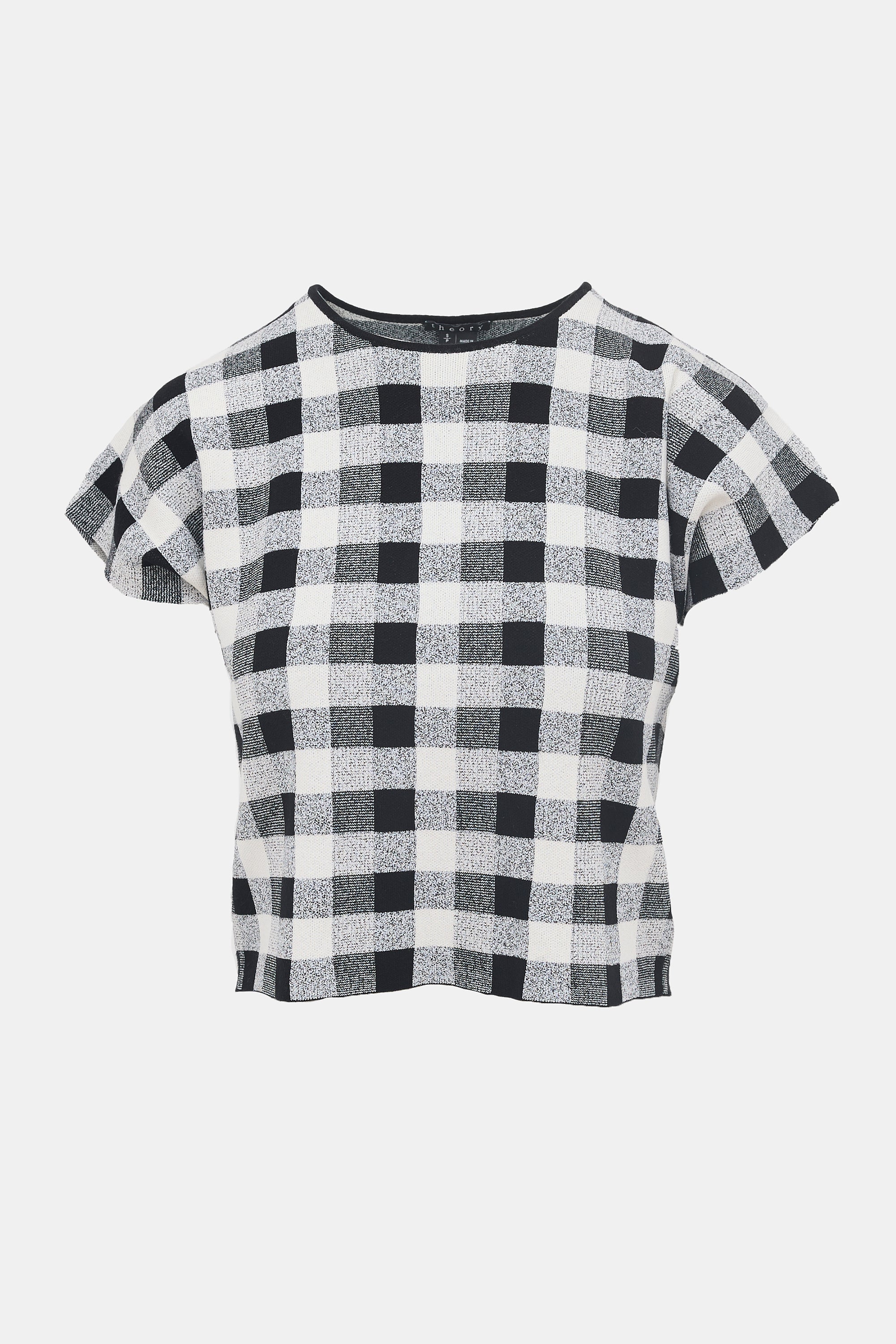 Pre-owned Theory knit T-shirt featuring a white and black check pattern, round neckline, and cropped fit.
