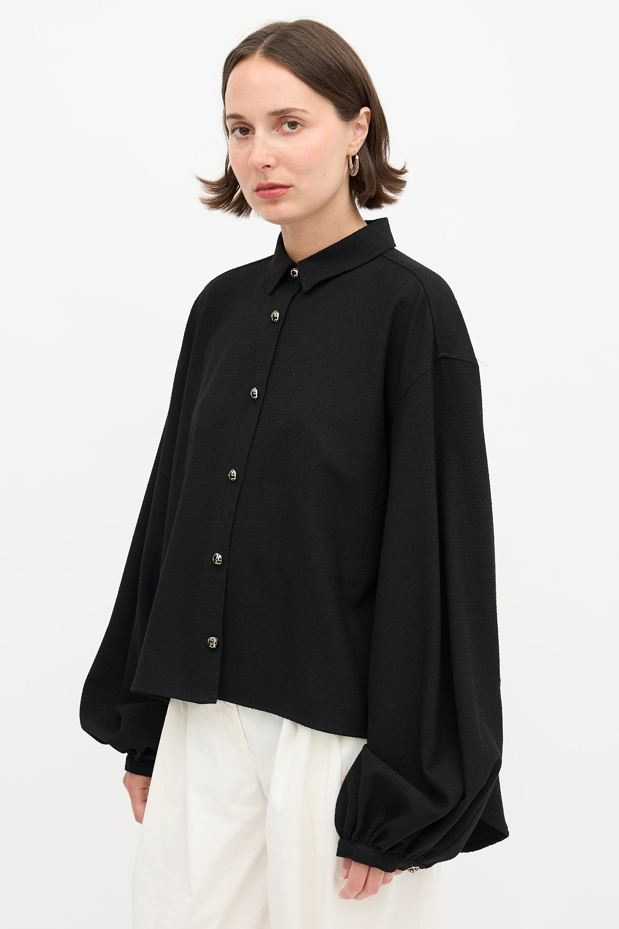 Pre-owned Toteme black Novale blouse featuring straight collar, black enamel and gold tone logo buttons, button front, pleated back yoke, high low hem, lantern sleeves, and buttoned cuffs.