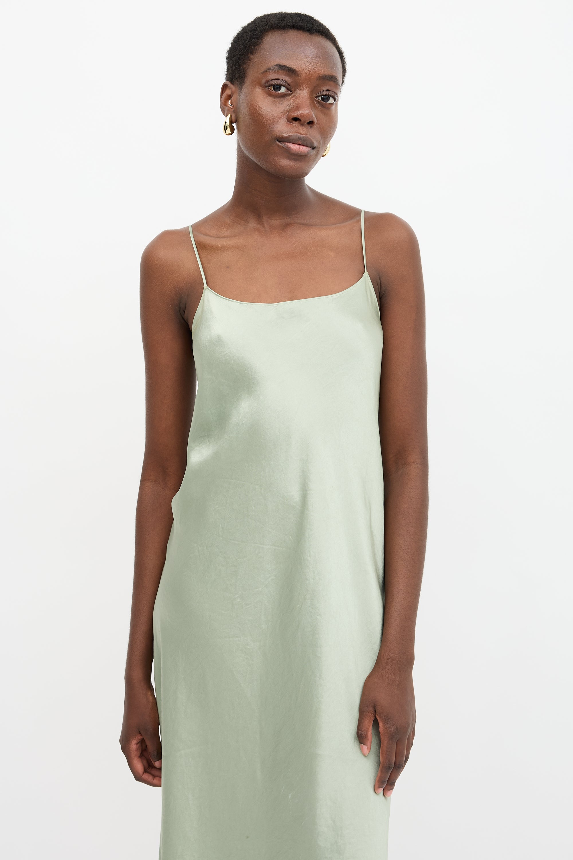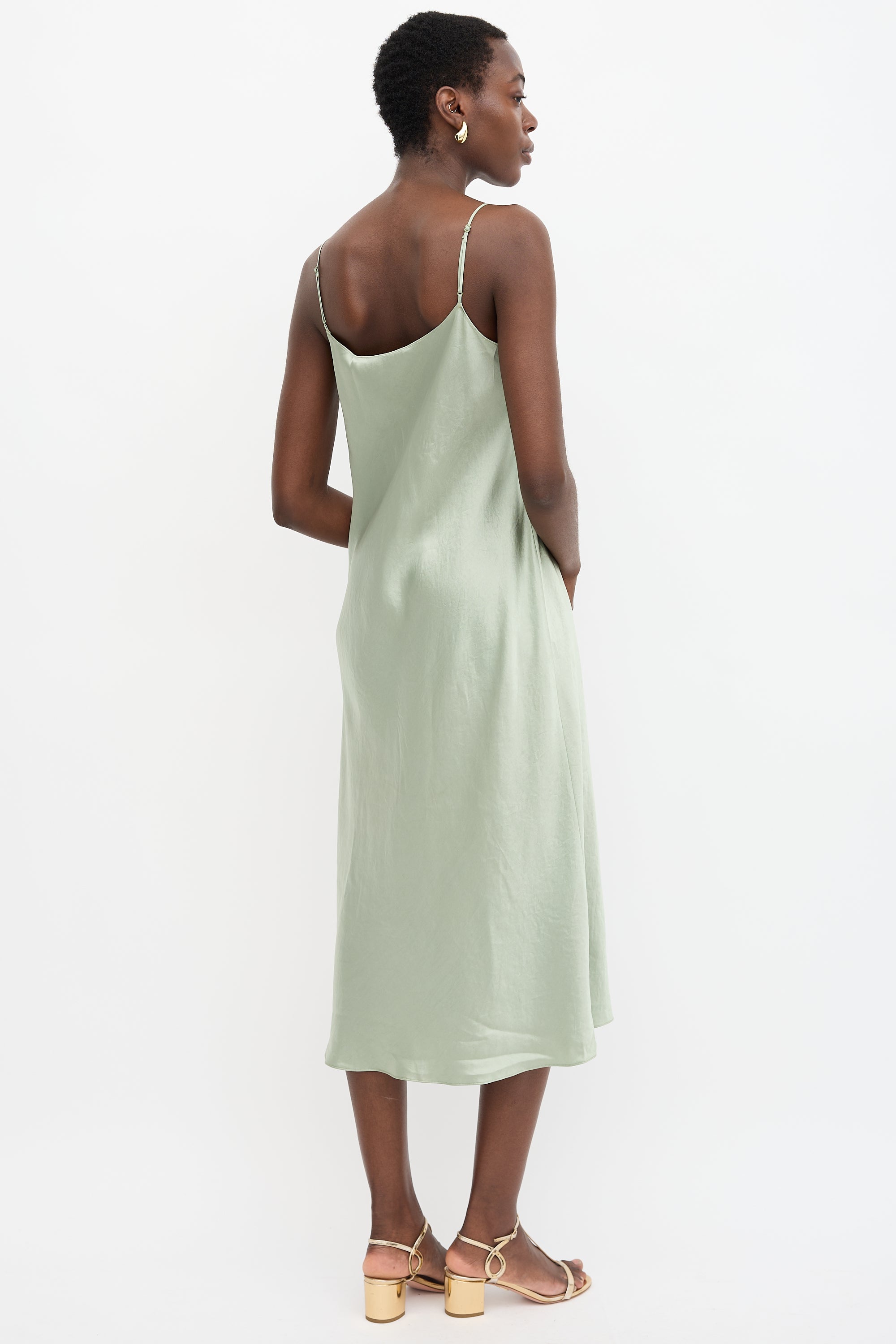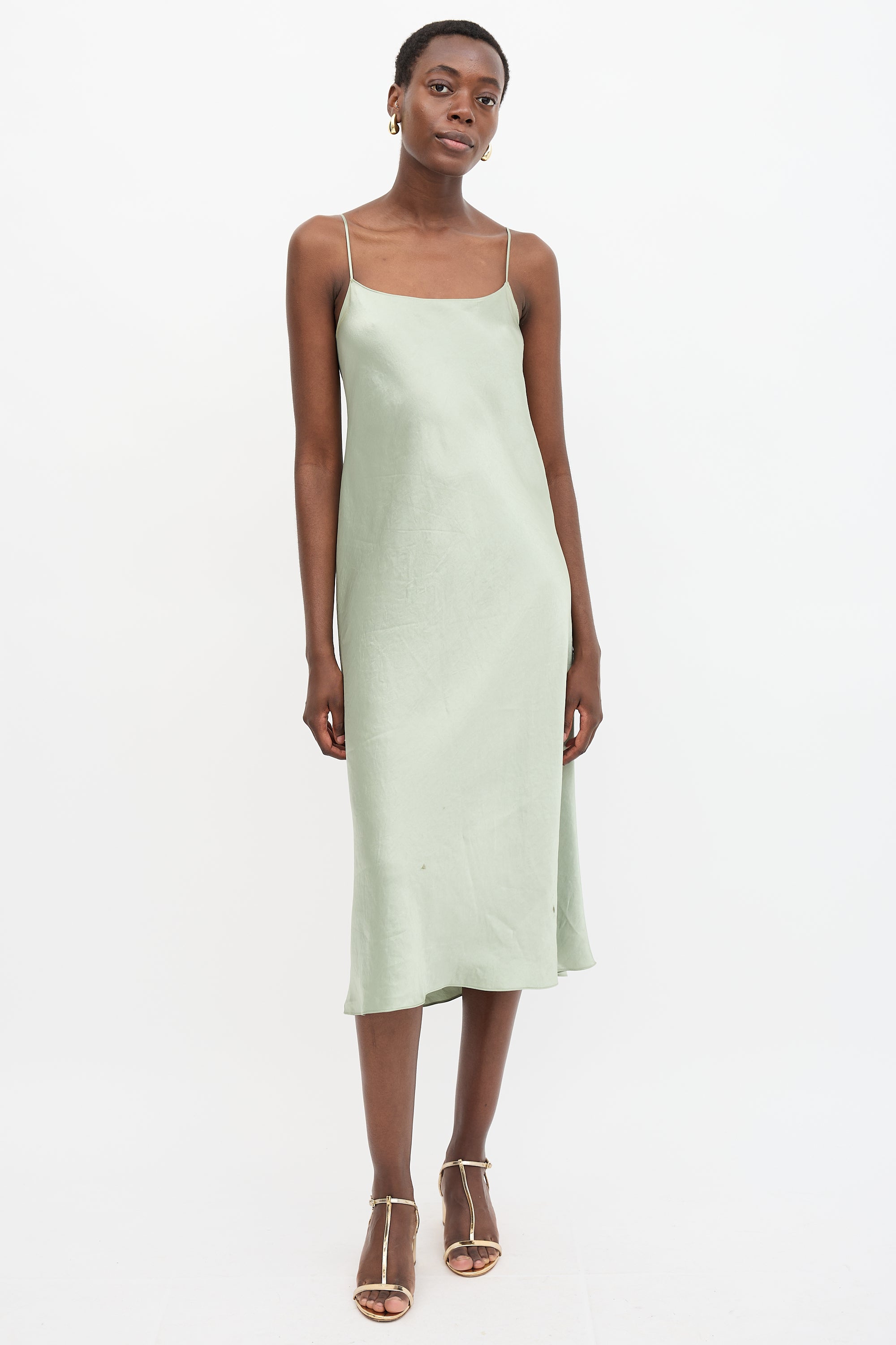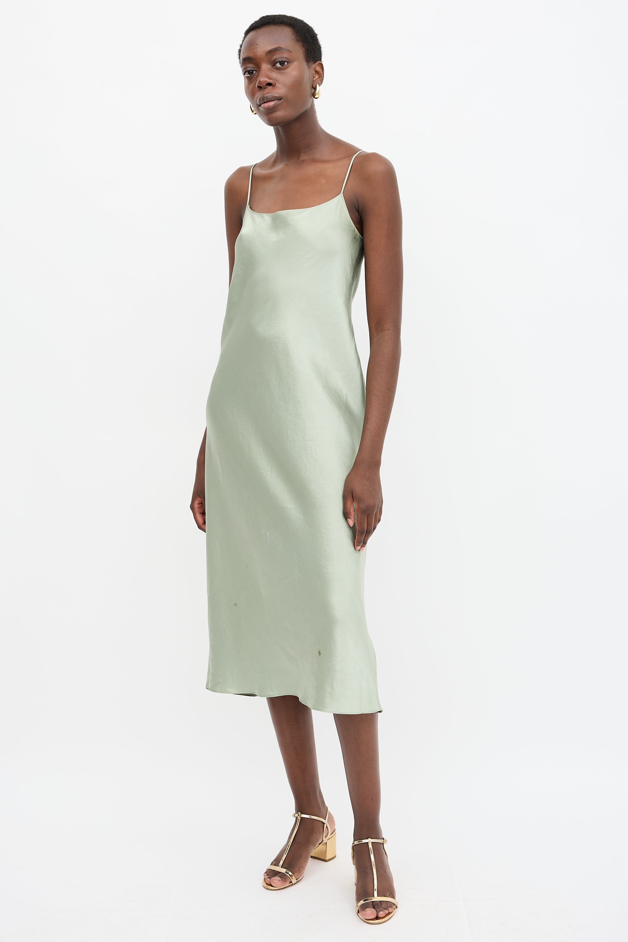 Pre-owned Vince green satin midi slip dress featuring adjustable straps and rounded neckline.