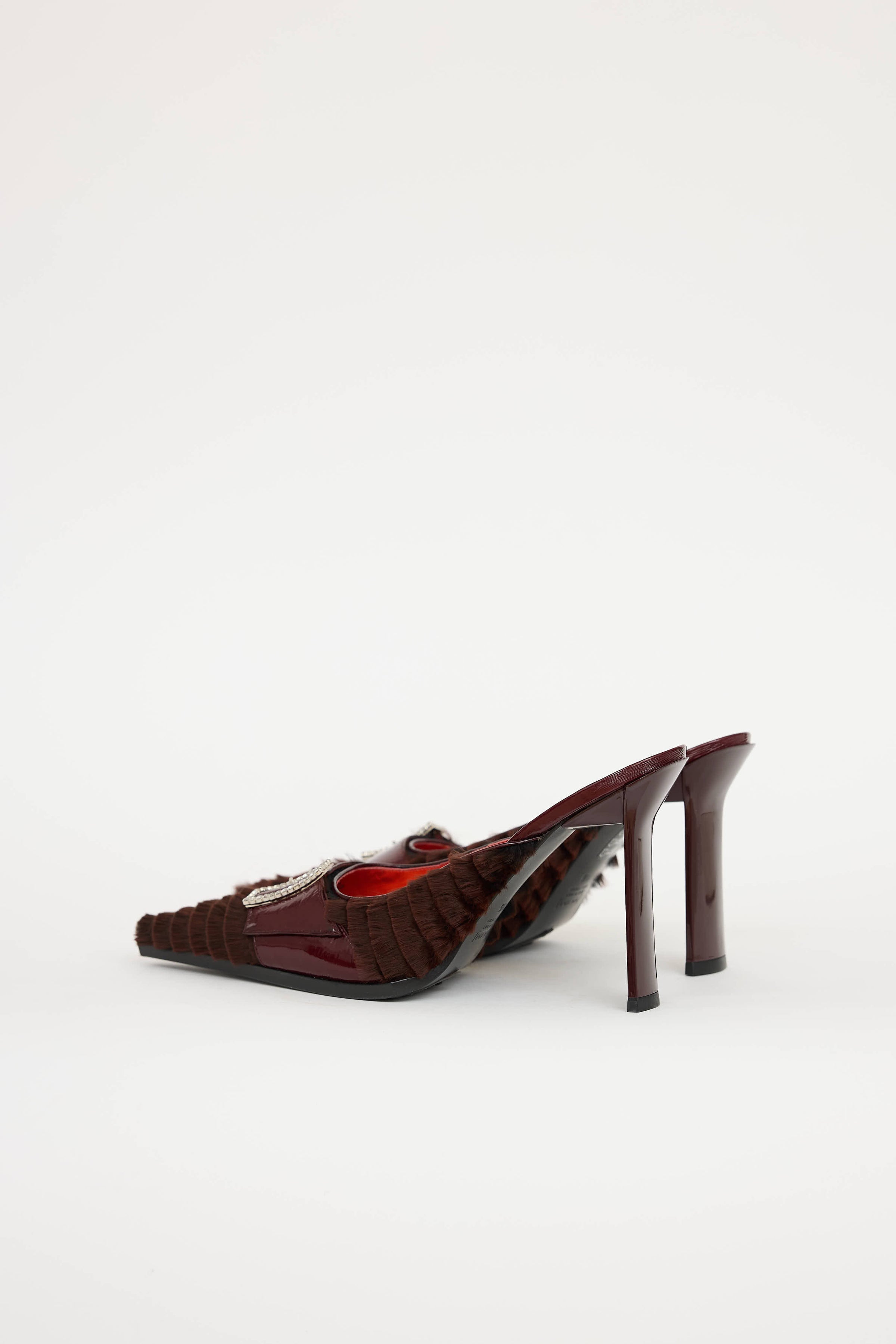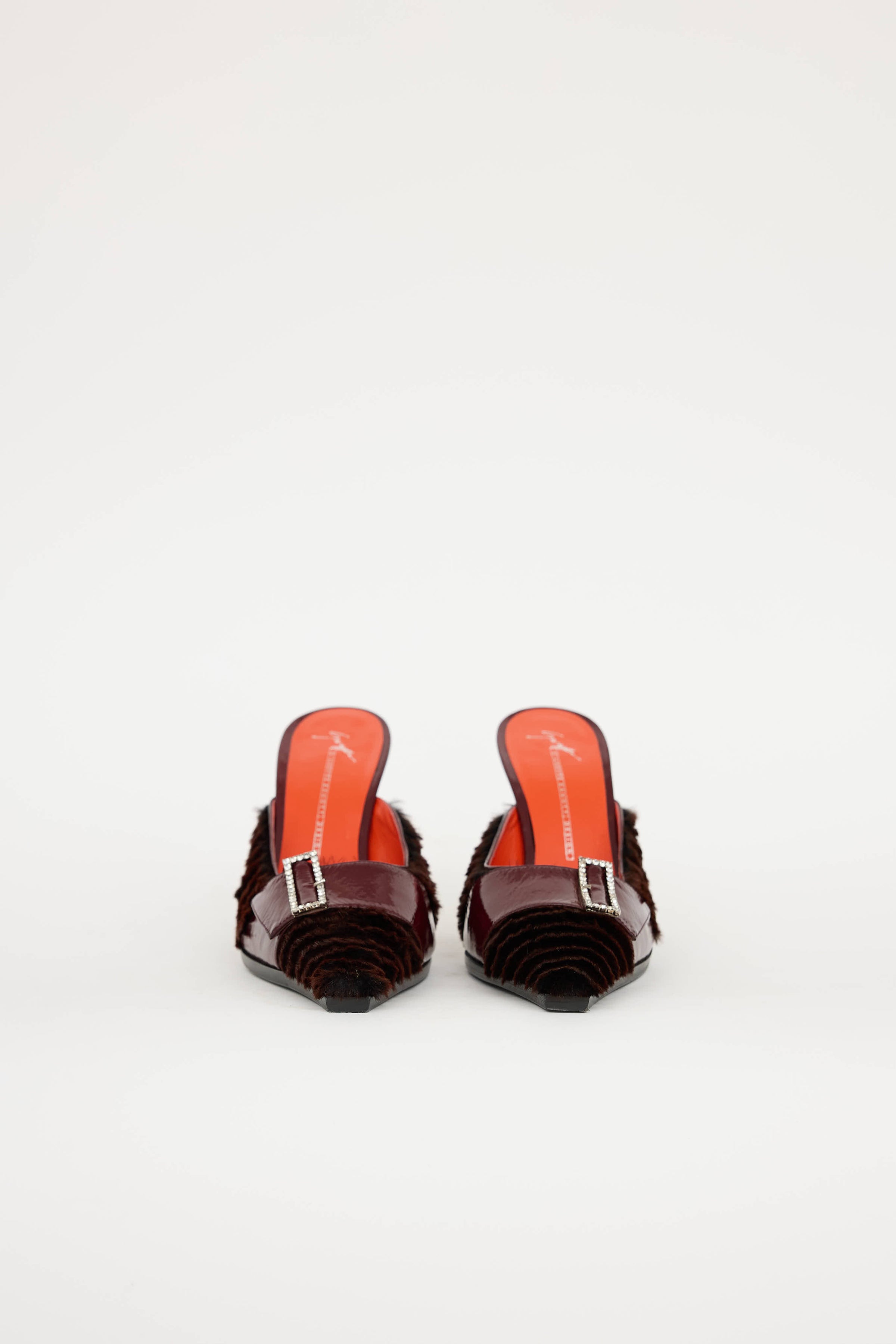 Pre-owned Giuseppe Zanotti burgundy fur mules featuring a pointed square toe, notched cutout fur upper, leather strap across vamp with crystal embellished buckle, and square thin heel.