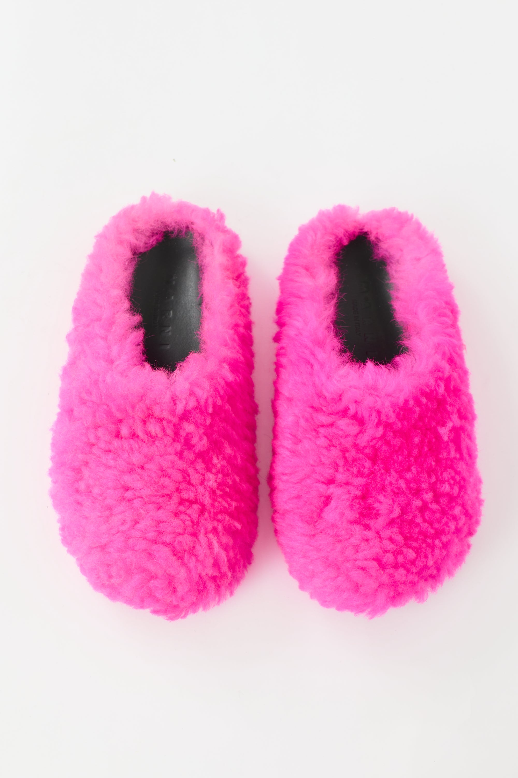 Pre-owned Marni neon pink shearling Fussbett Sabot mules featuring rounded toe, slip on entry, rubber outsole. Includes original dust bag.