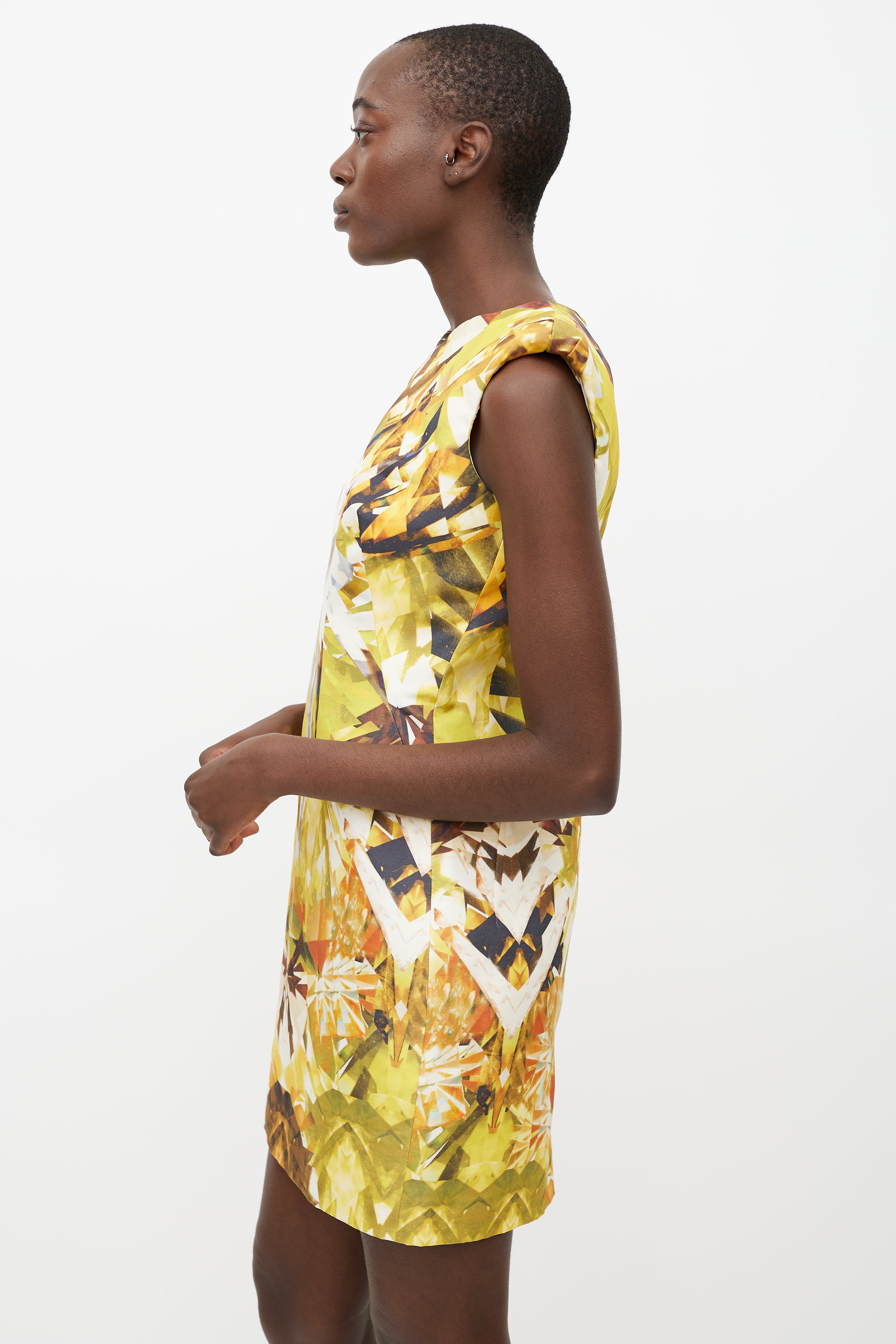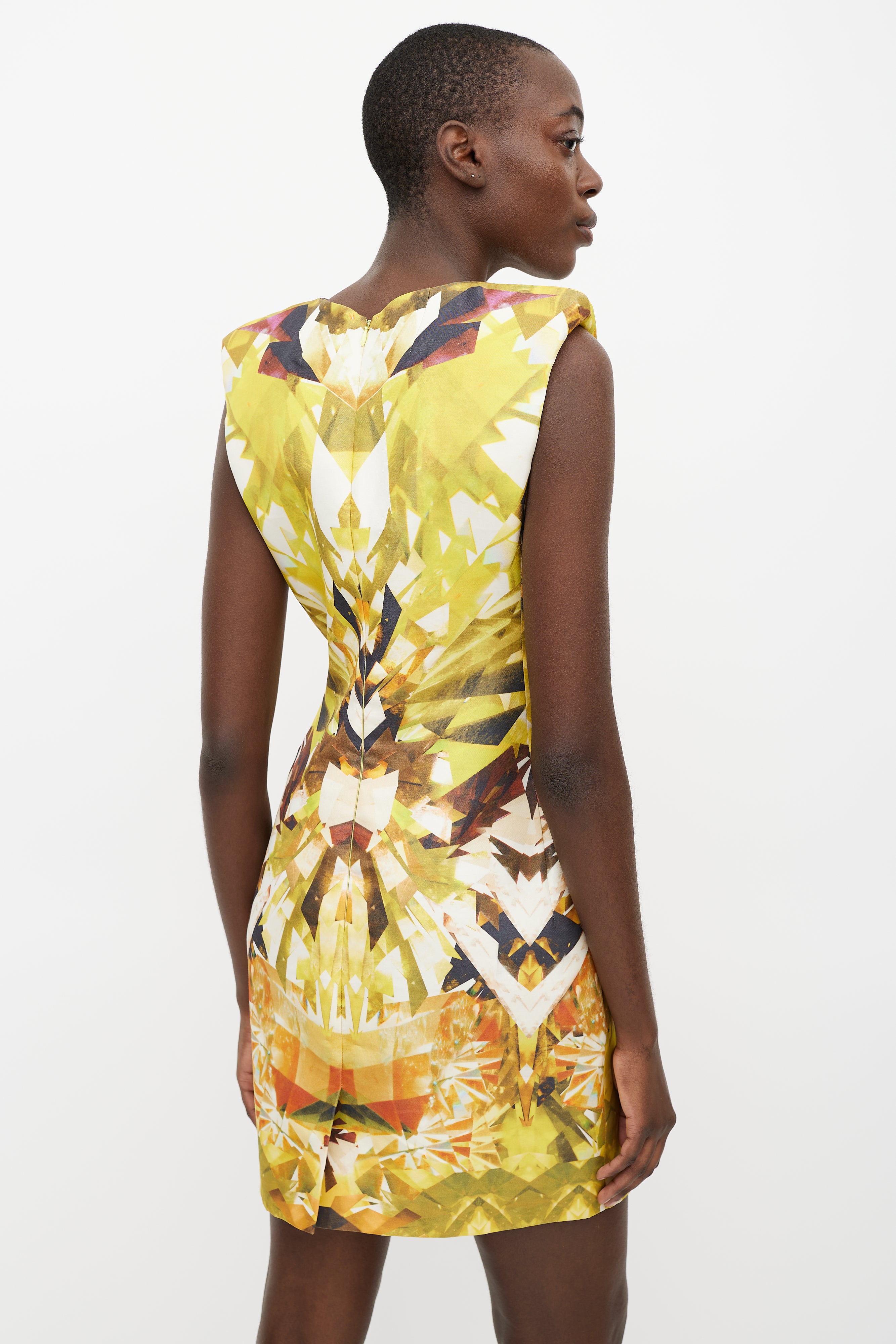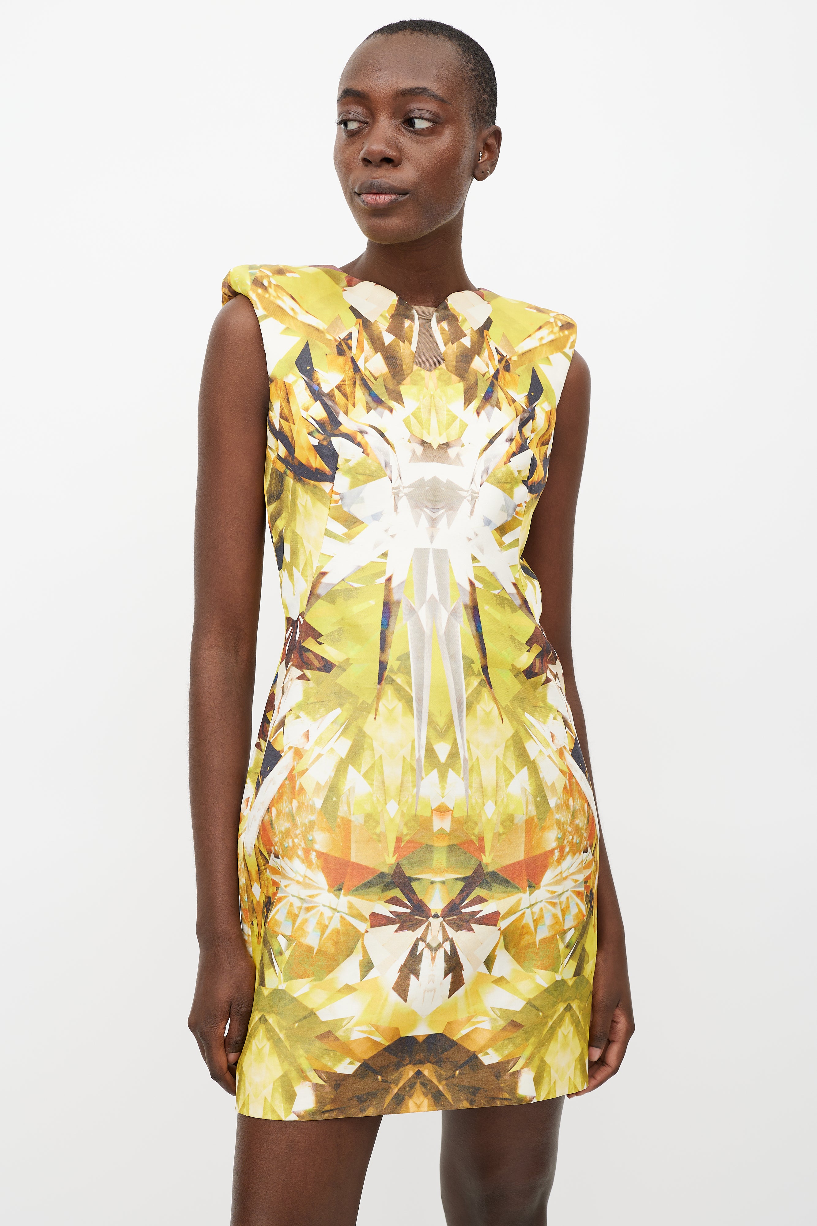 Pre-owned Spring/Summer 2009 Alexander McQueen yellow wool dress featuring a multicolour gem reflection digital print throughout, V-neckline with mesh detailing, structured shoulders, sleeveless styling, darted bust, and zip at back with hook and eye closure. Lined. Look 24 from “Natural Dis-Tinction, Un-Natural Selection” runway collection.
