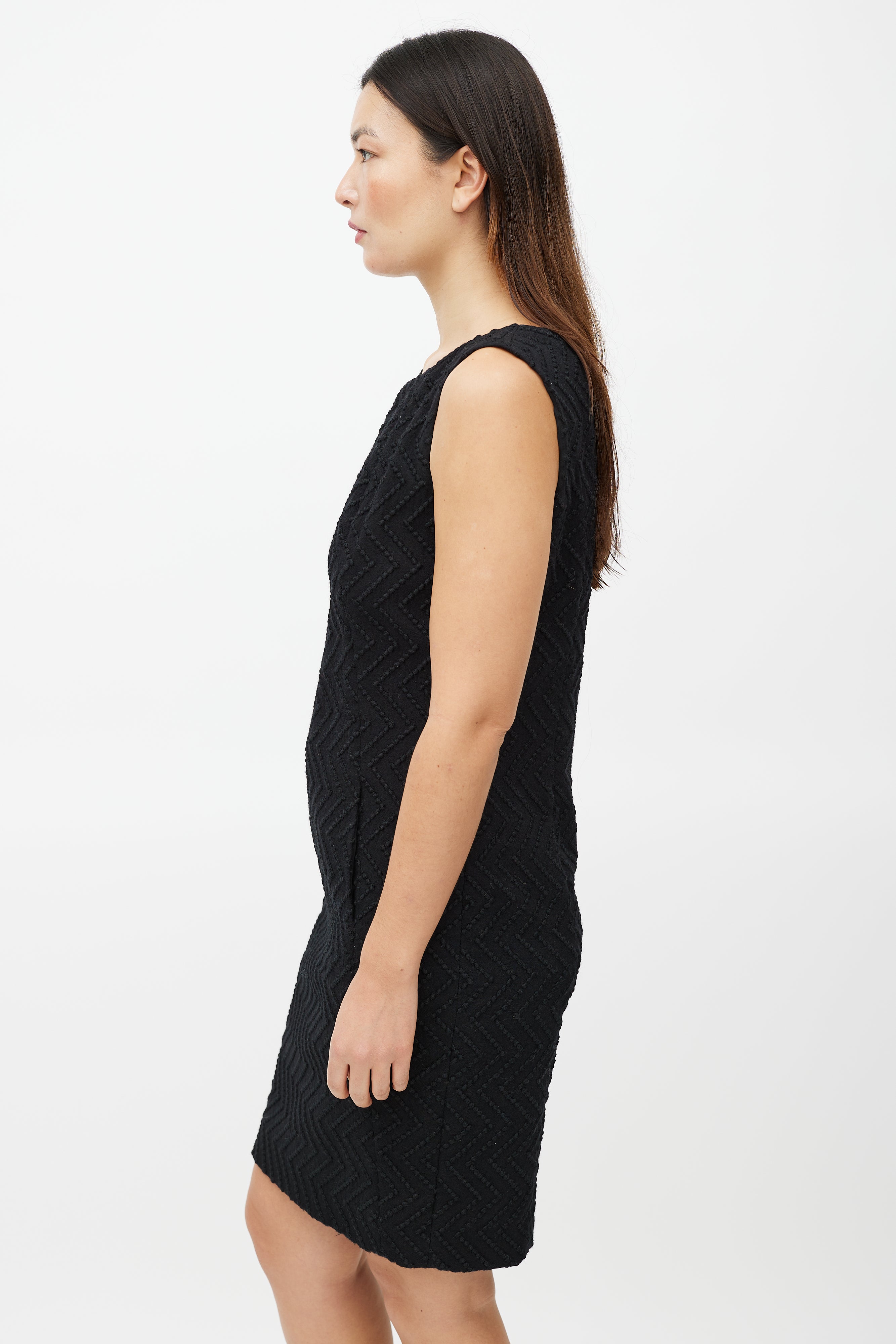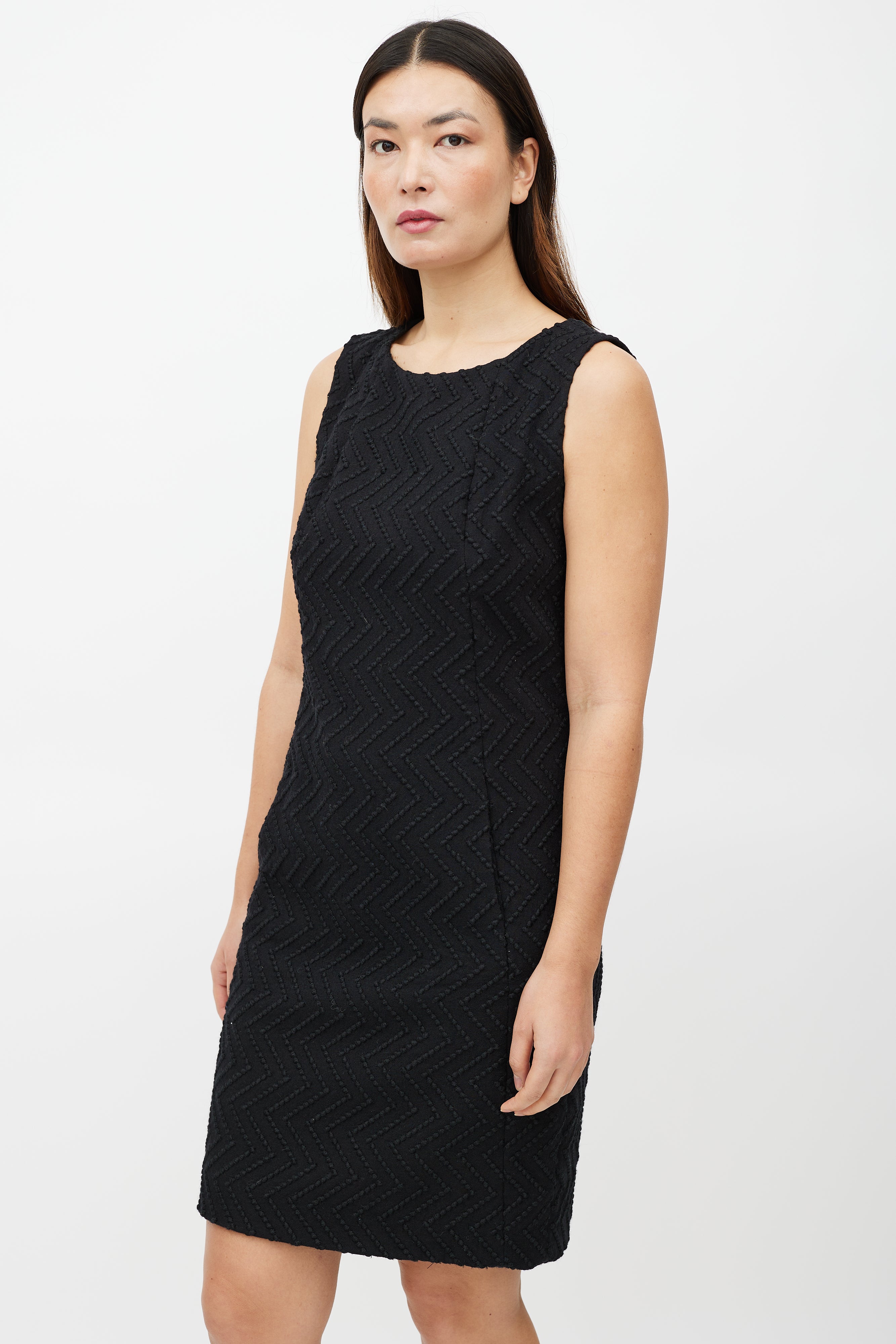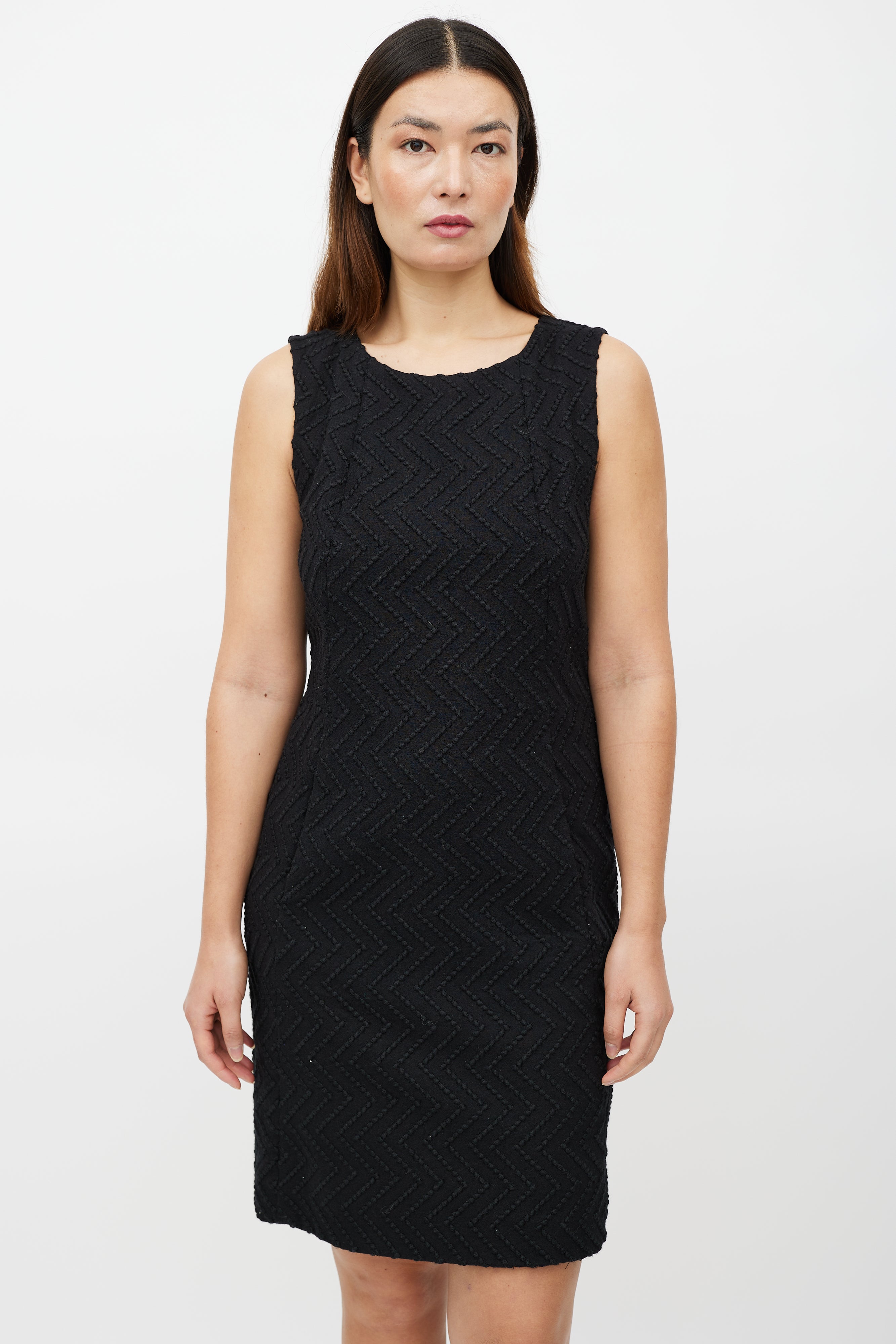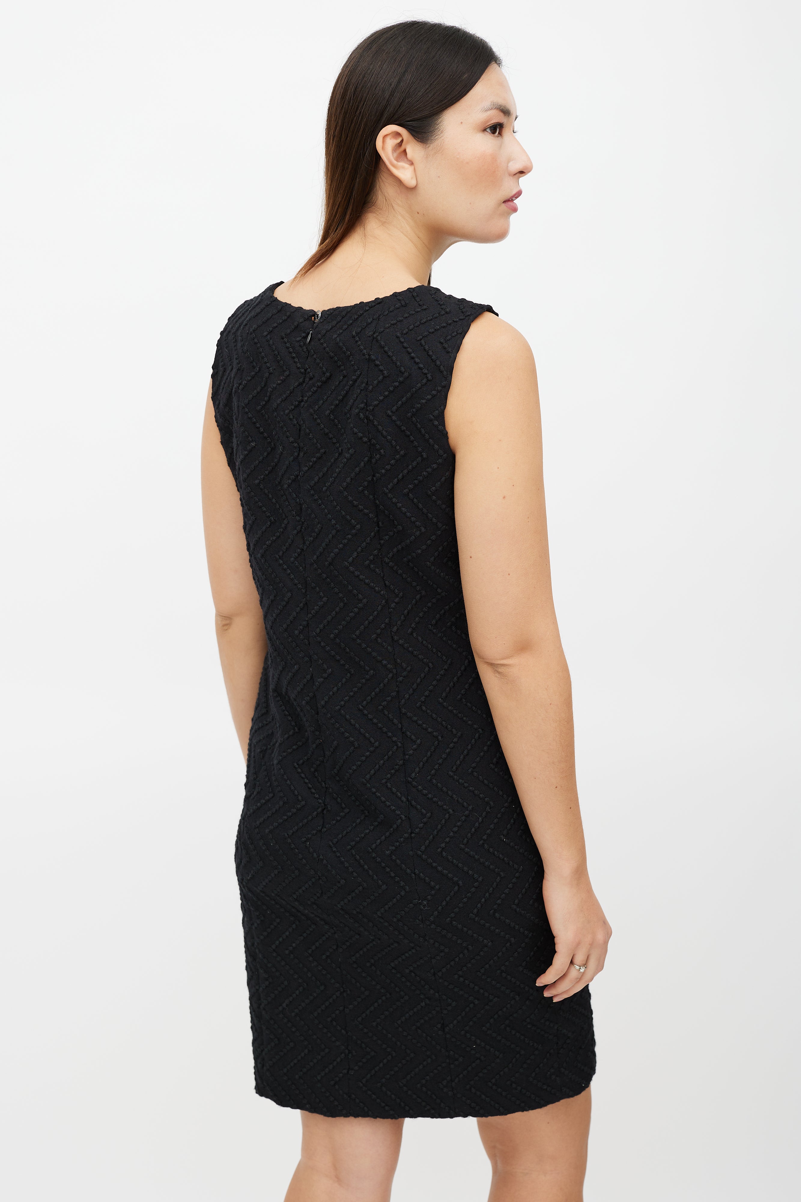 Pre-owned Fall/Winter 2009 Chanel black wool dress featuring a tonal zig zag jacquard pattern throughout, round neckline, sleeveless styling and zip at back with button closure. Lined.