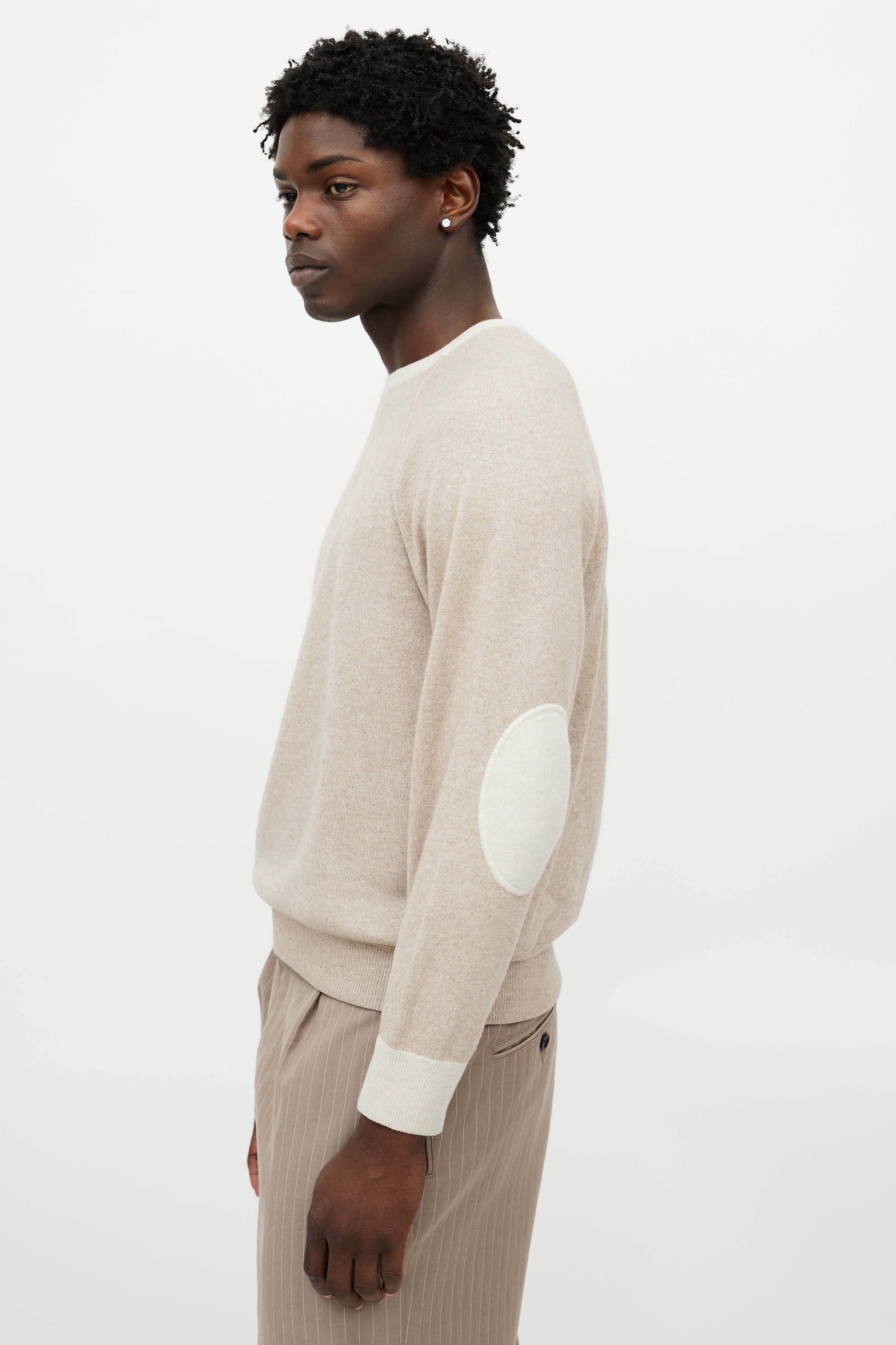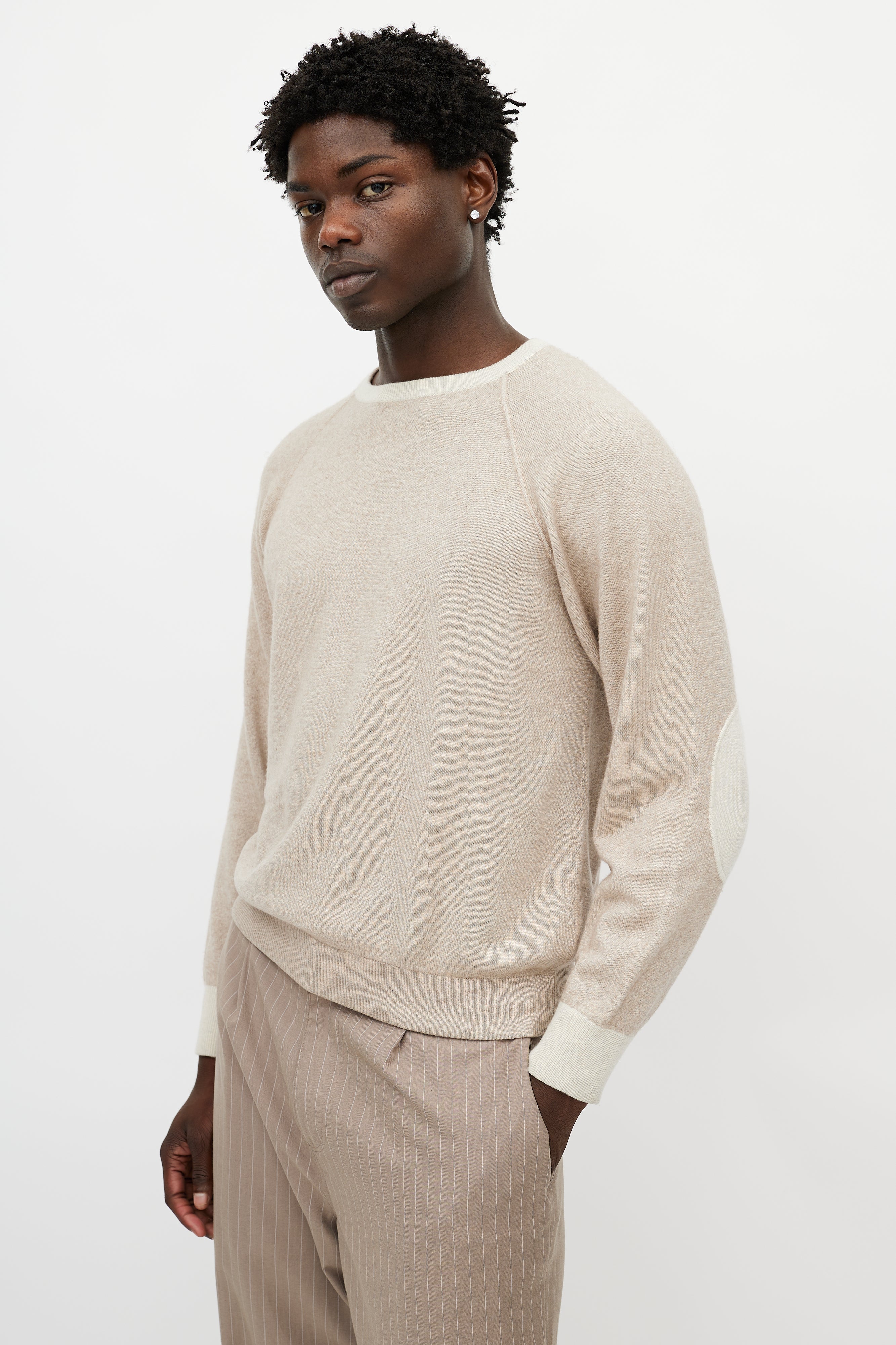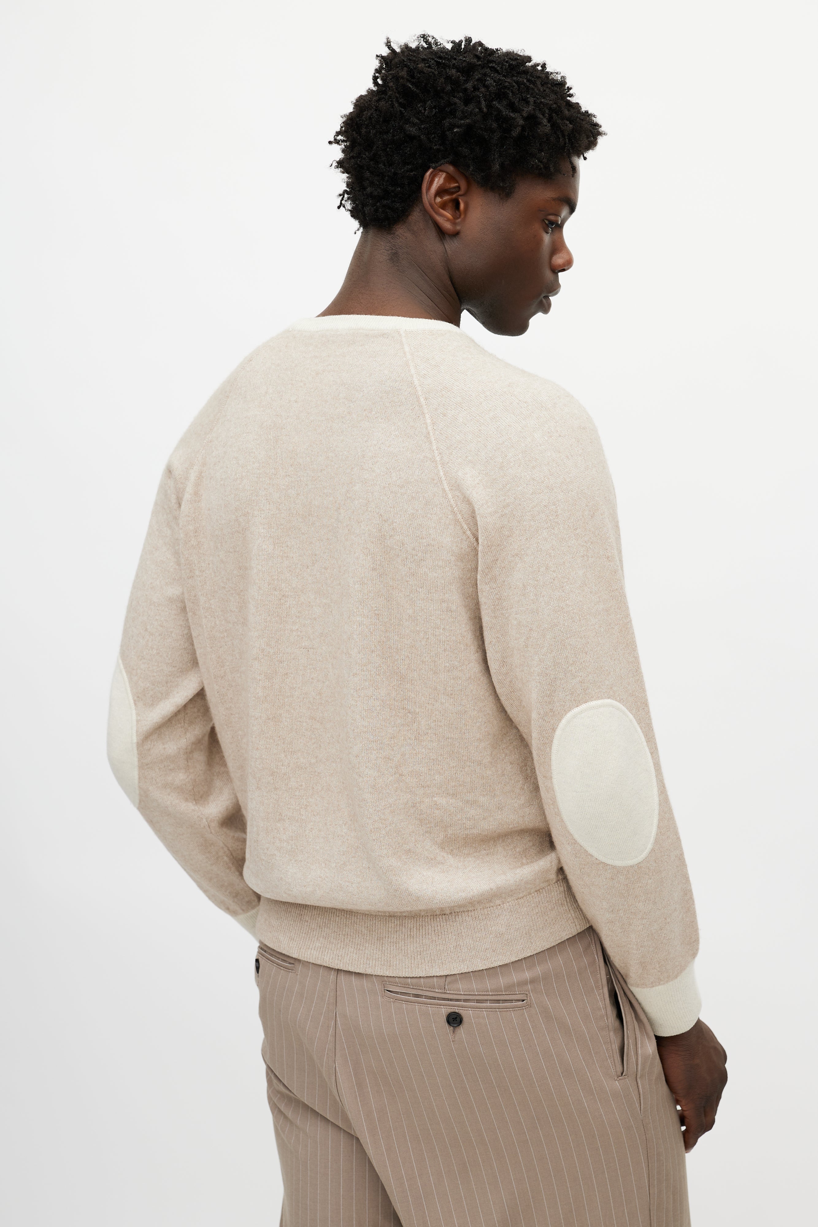 Pre-owned Loro Piana beige cashmere knit sweater featuring a round neckline, long sleeves with tonal elbow pads, and ribbed hem.