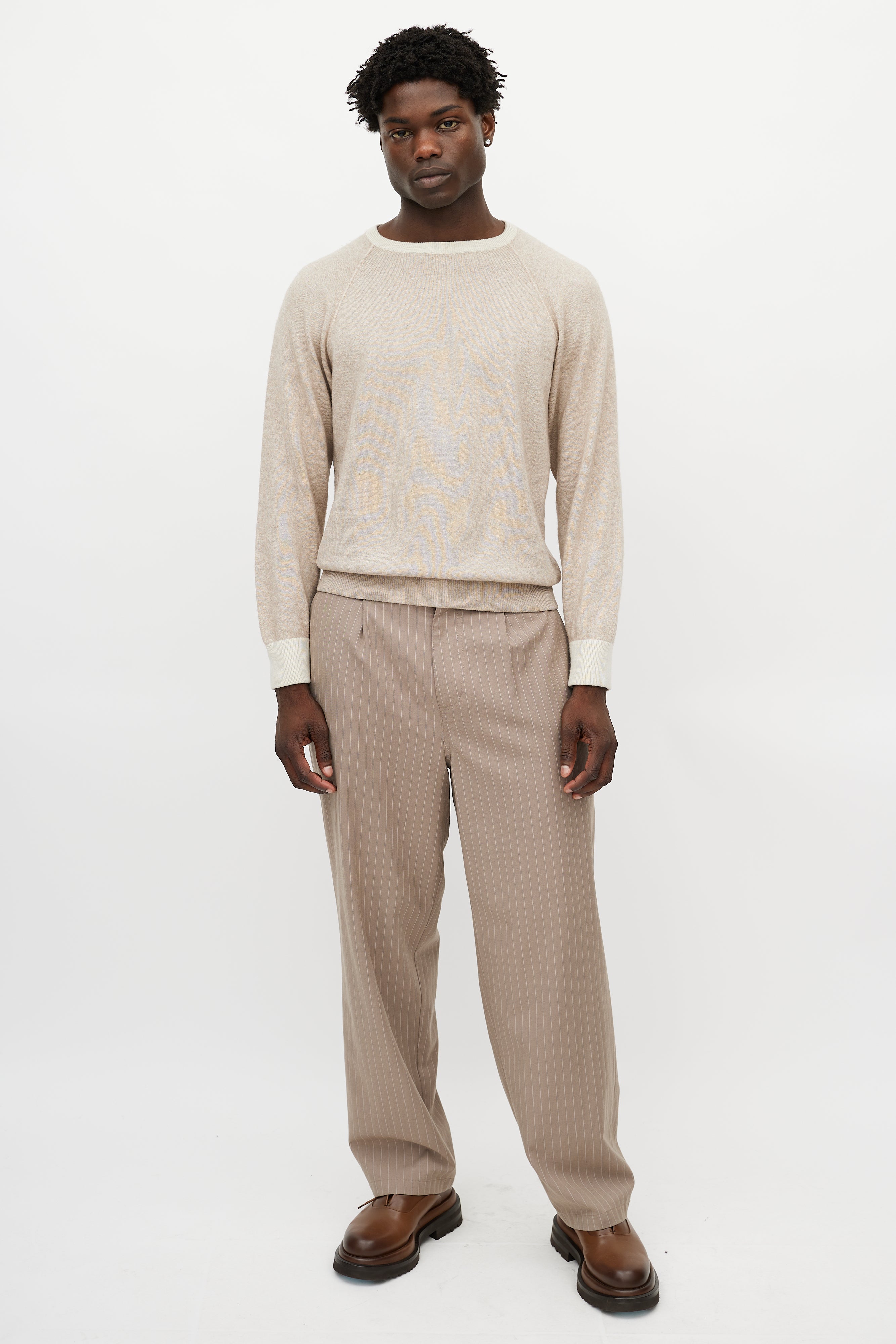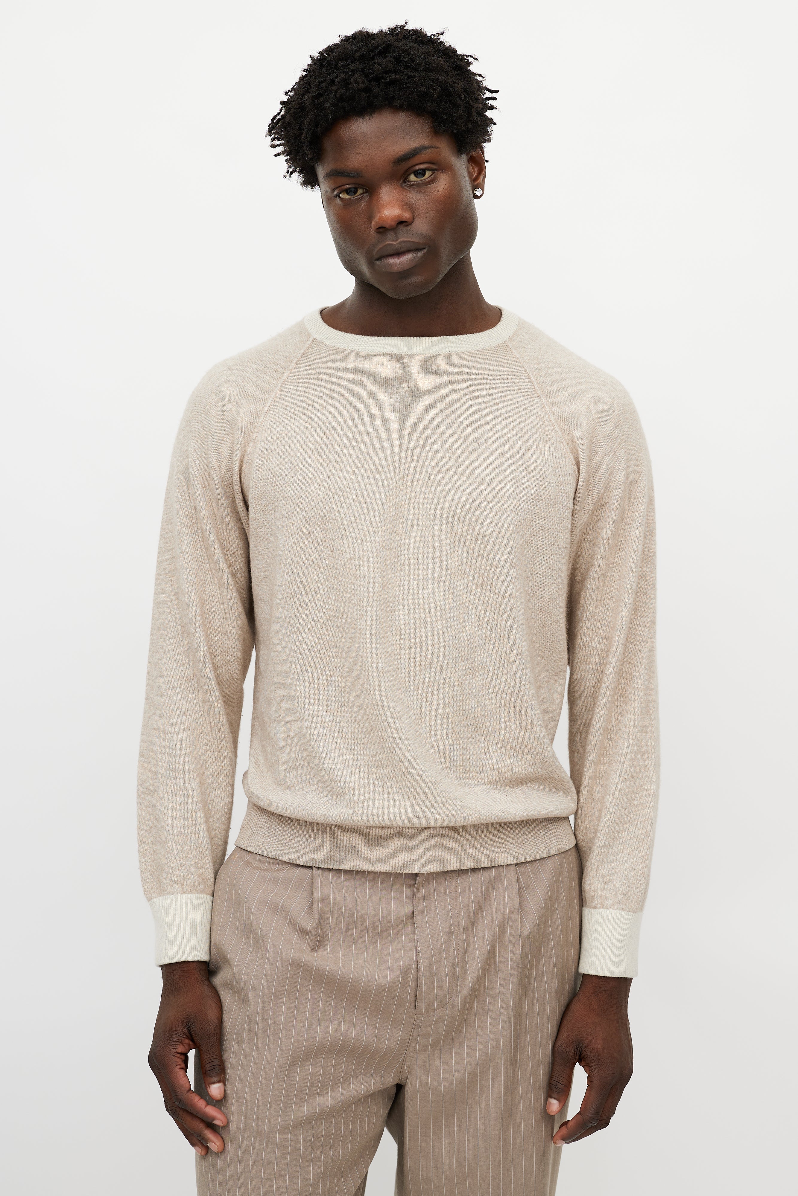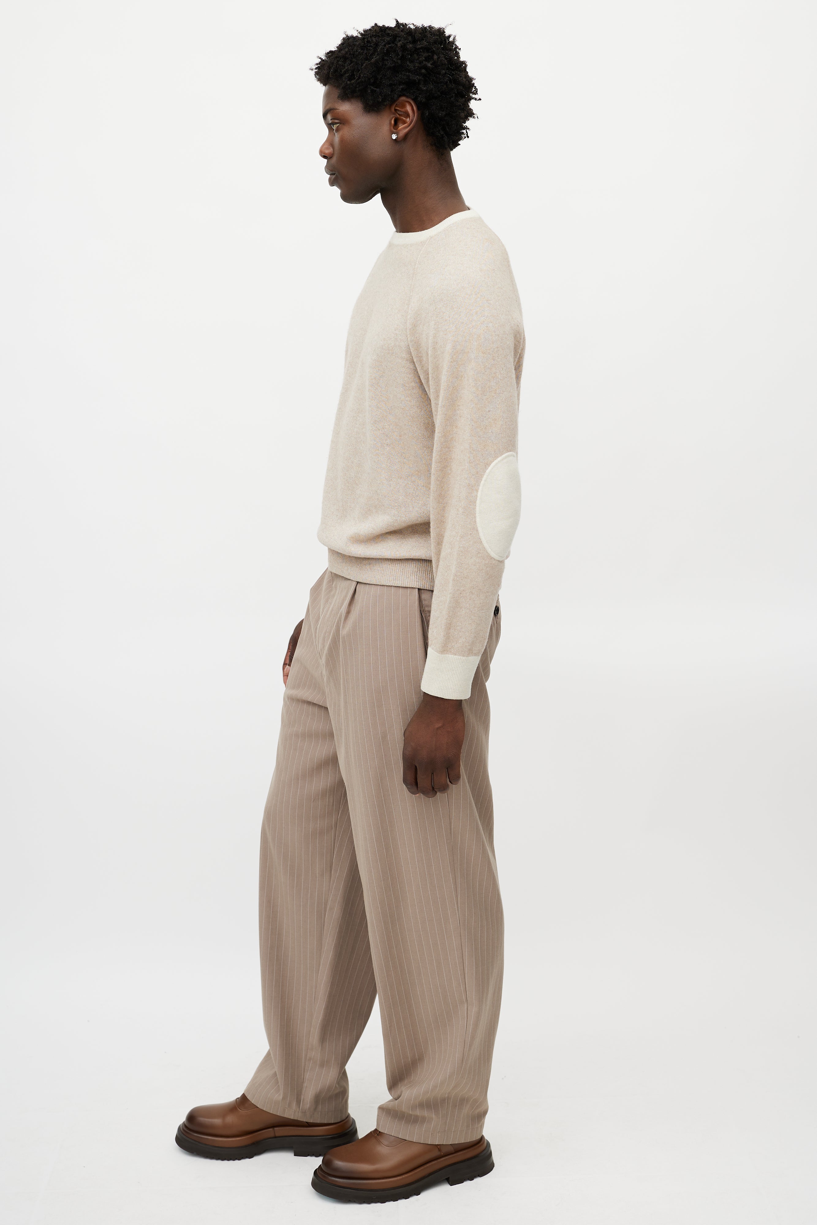Pre-owned Loro Piana beige cashmere knit sweater featuring a round neckline, long sleeves with tonal elbow pads, and ribbed hem.
