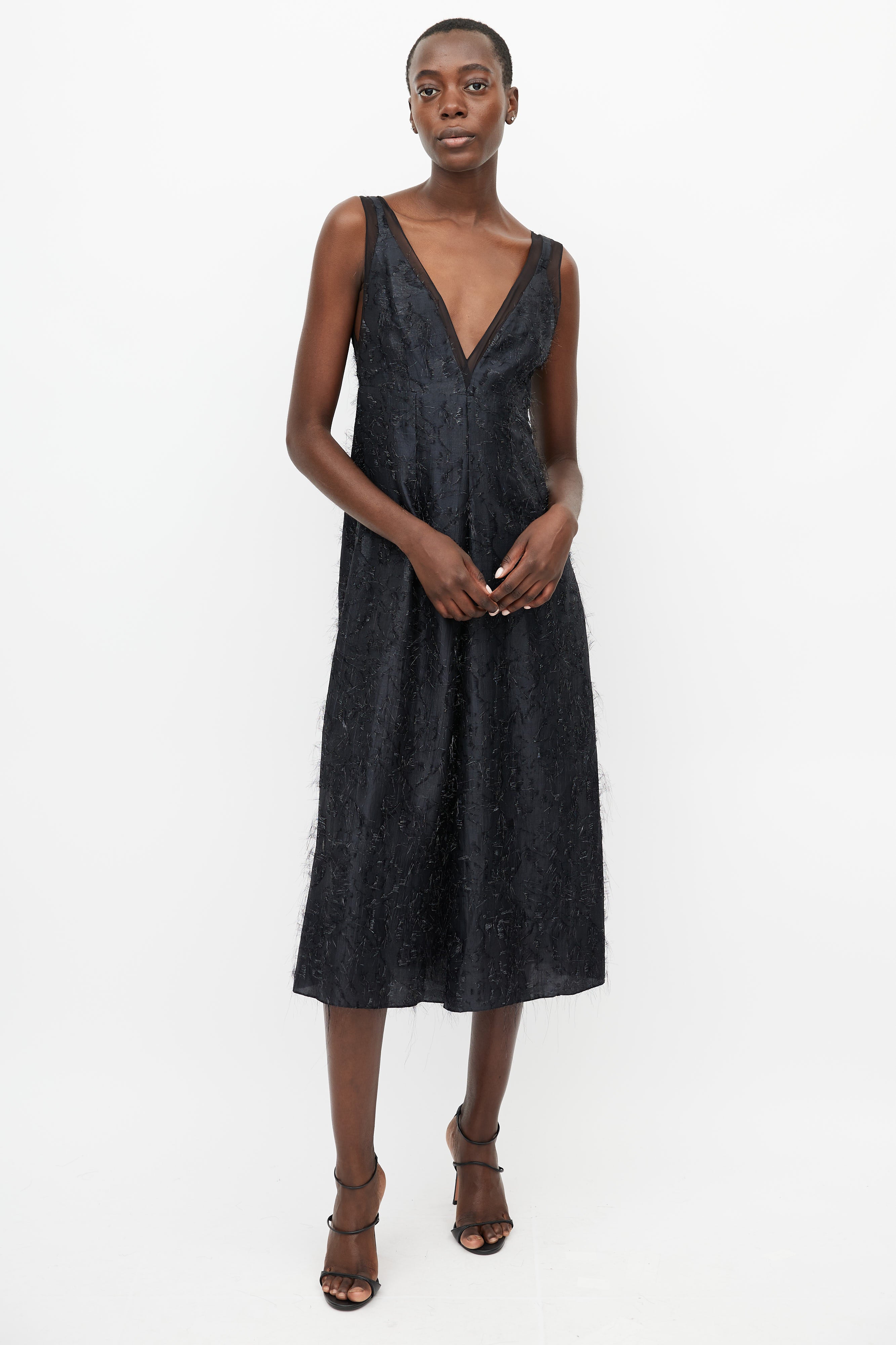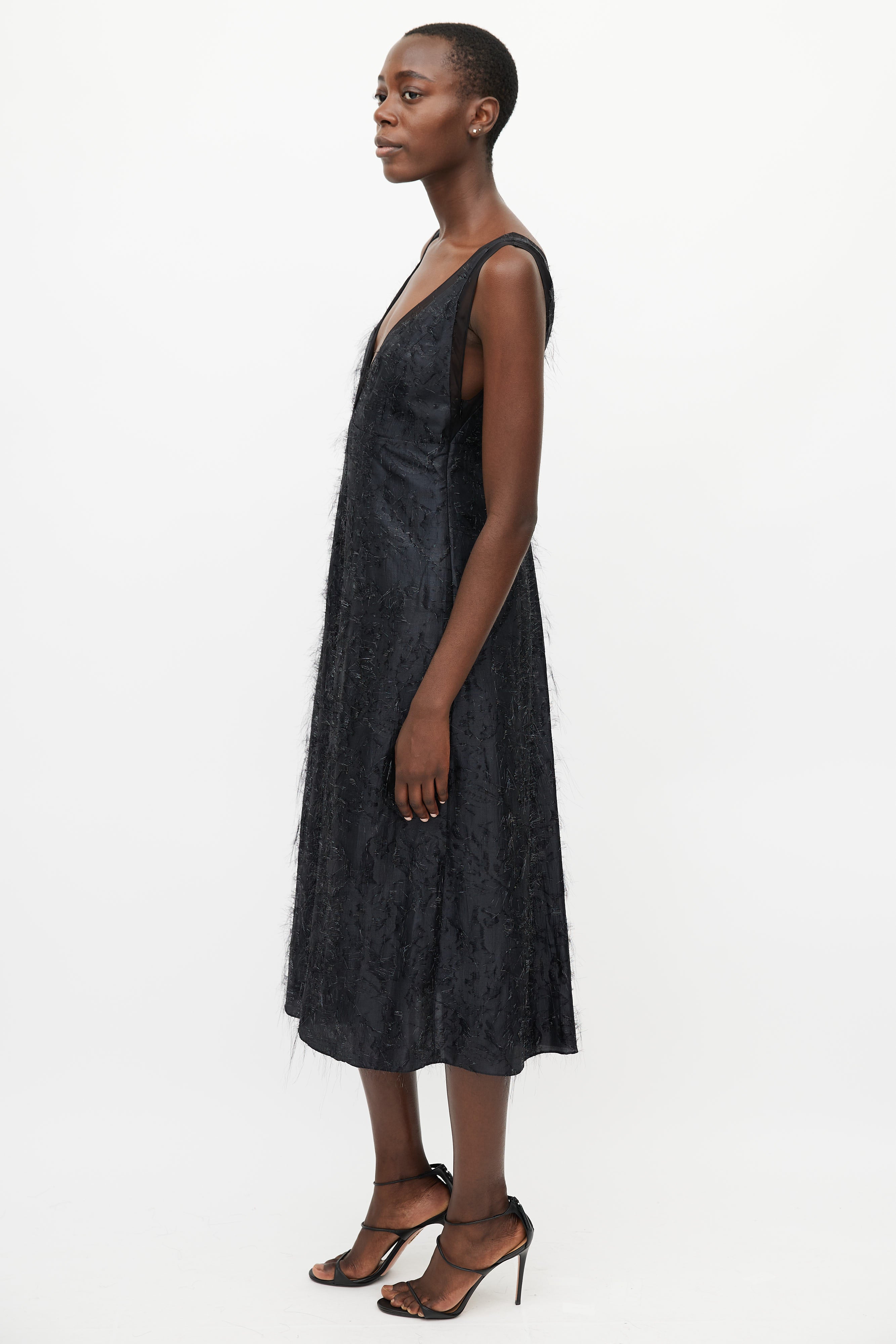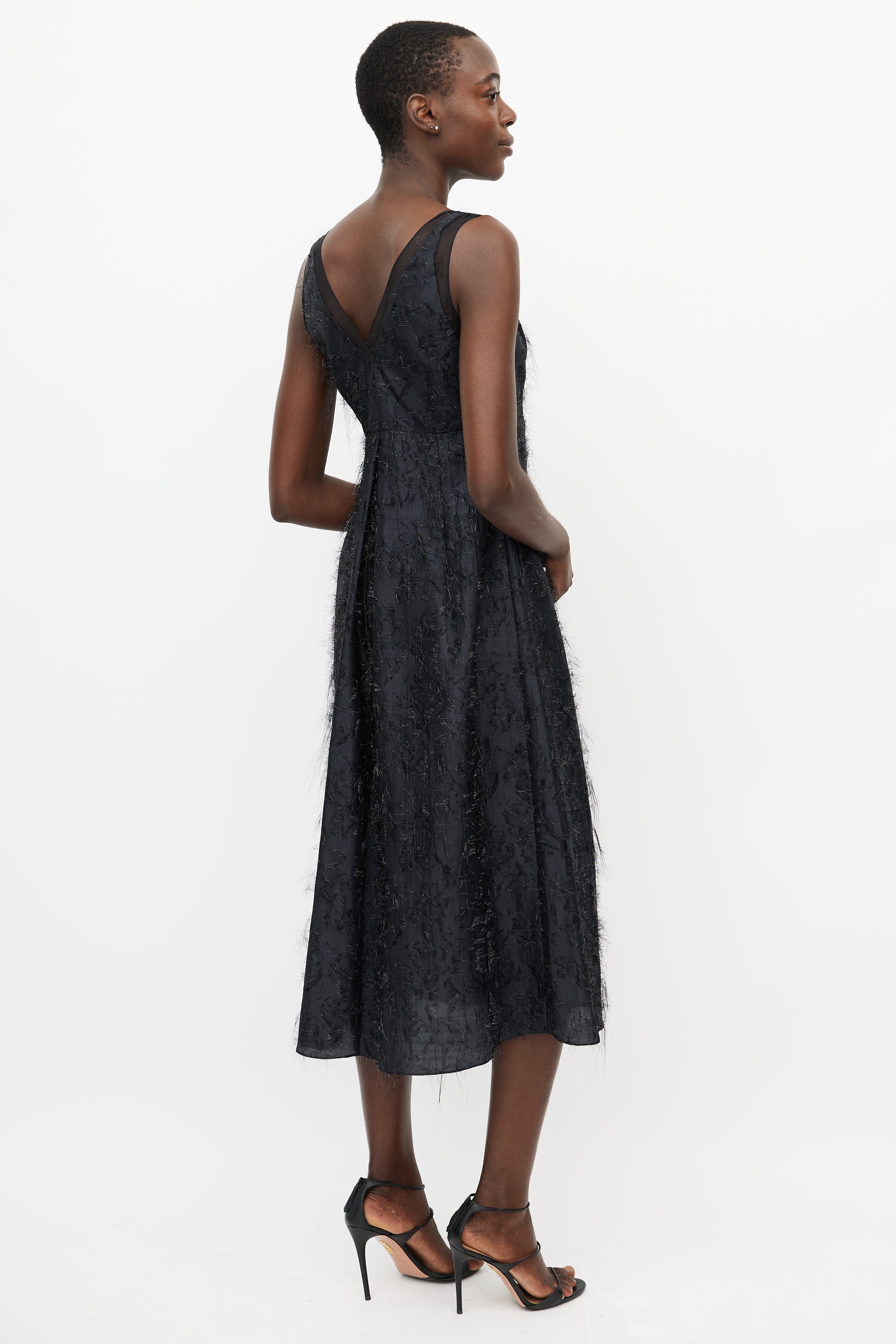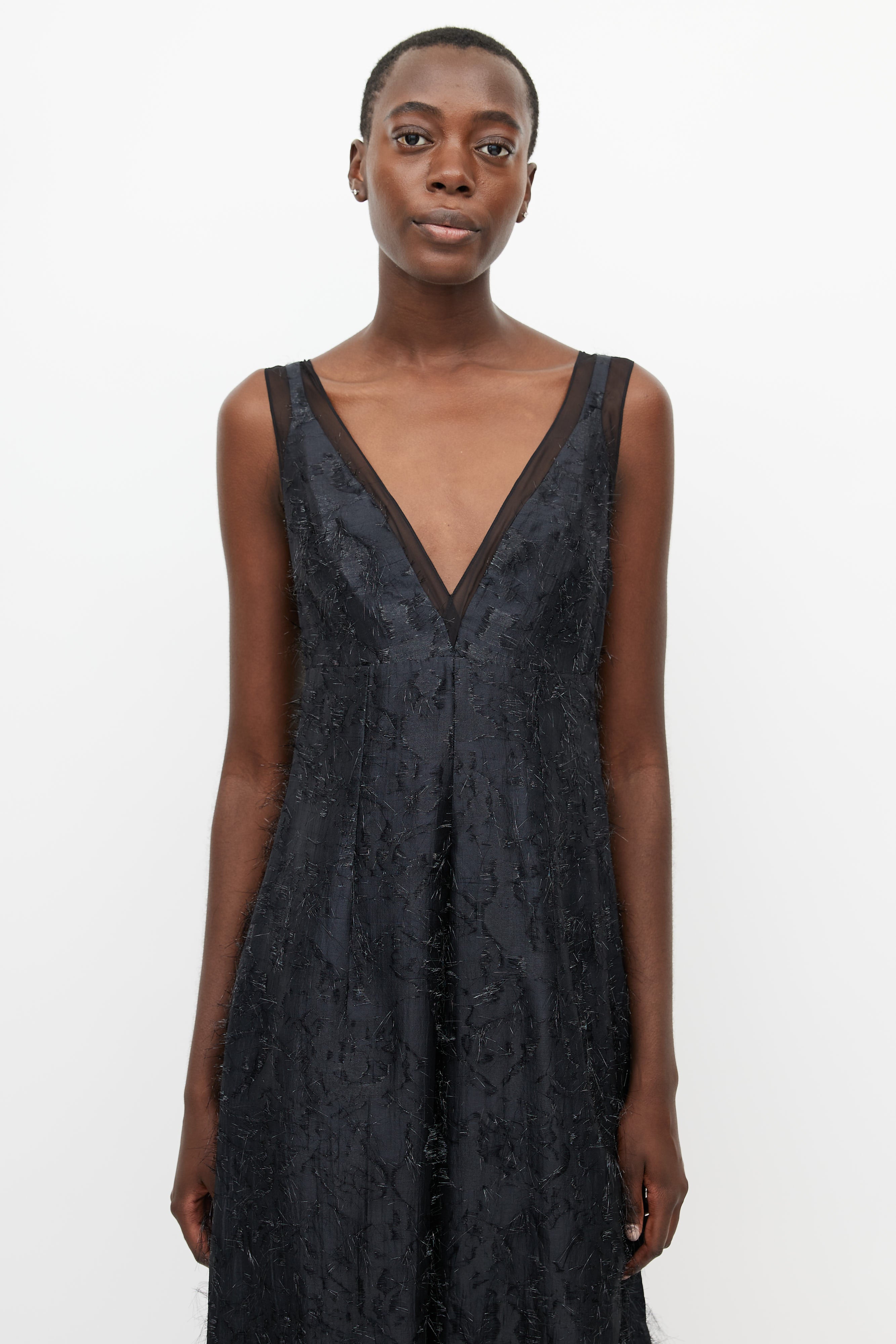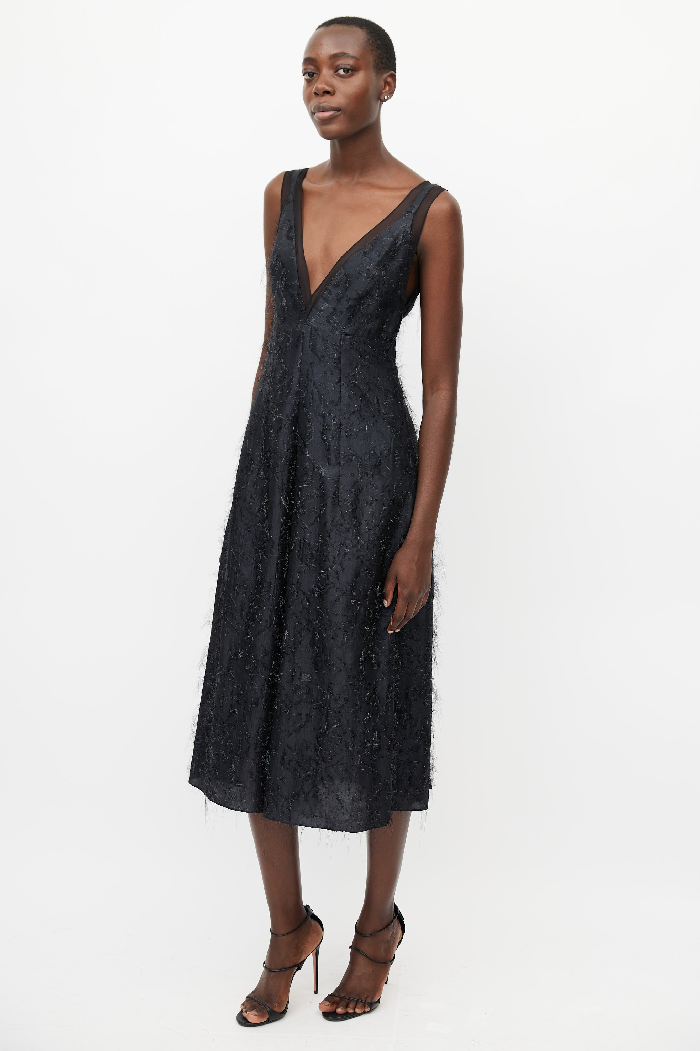 Pre-owned Sonia Rykiel black dress featuring V-neckline, concealed zip closure at left side, tonal sheer panel at shoulders, and silver tinsel embellishment throughout.