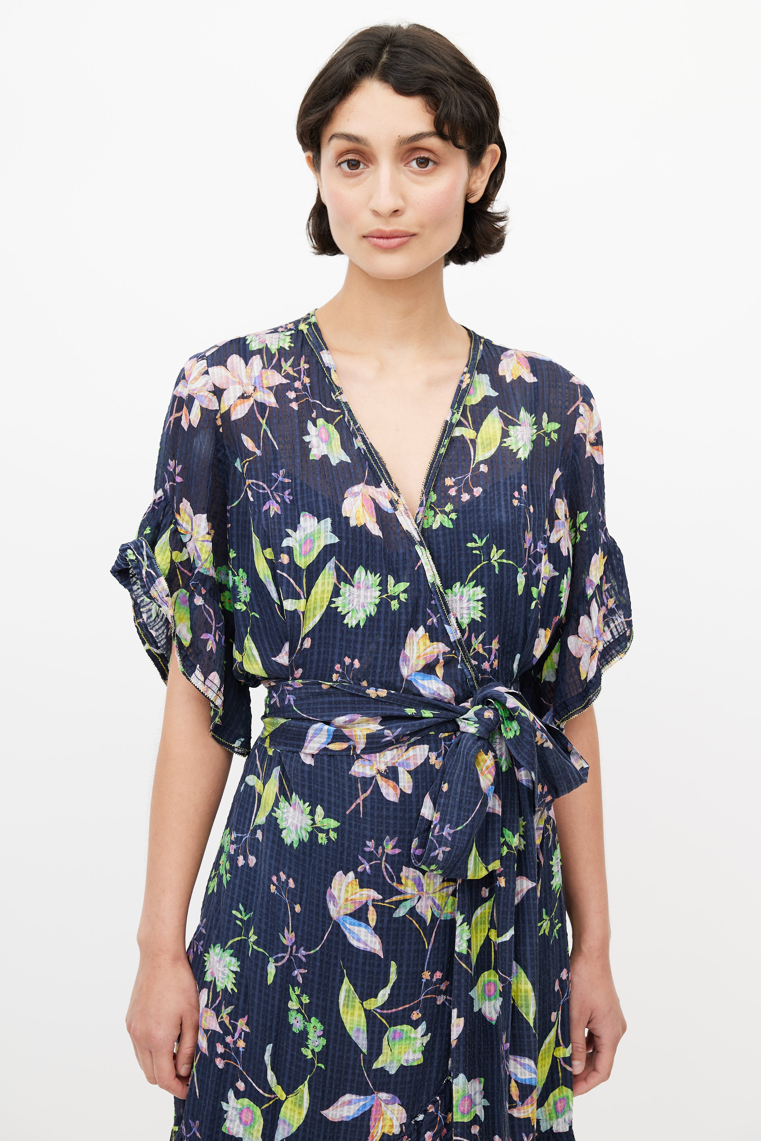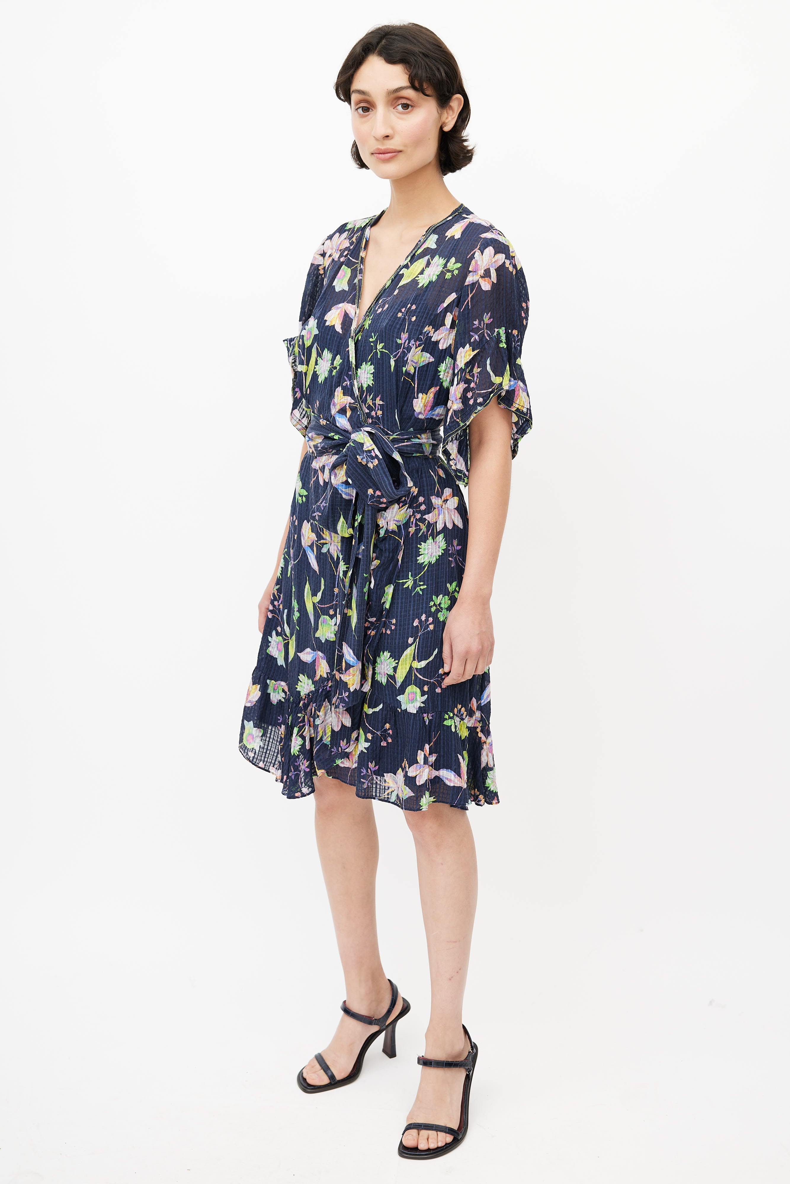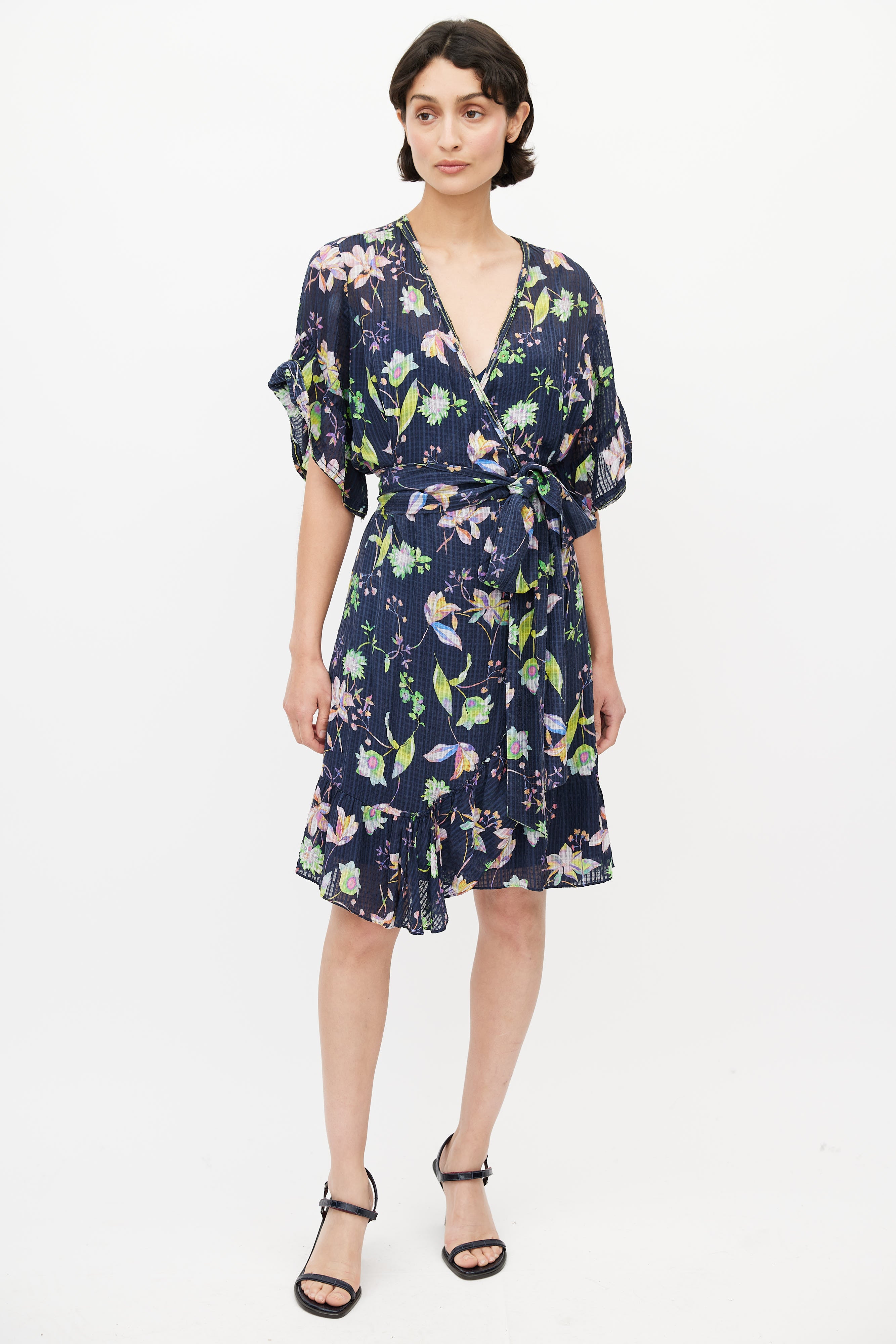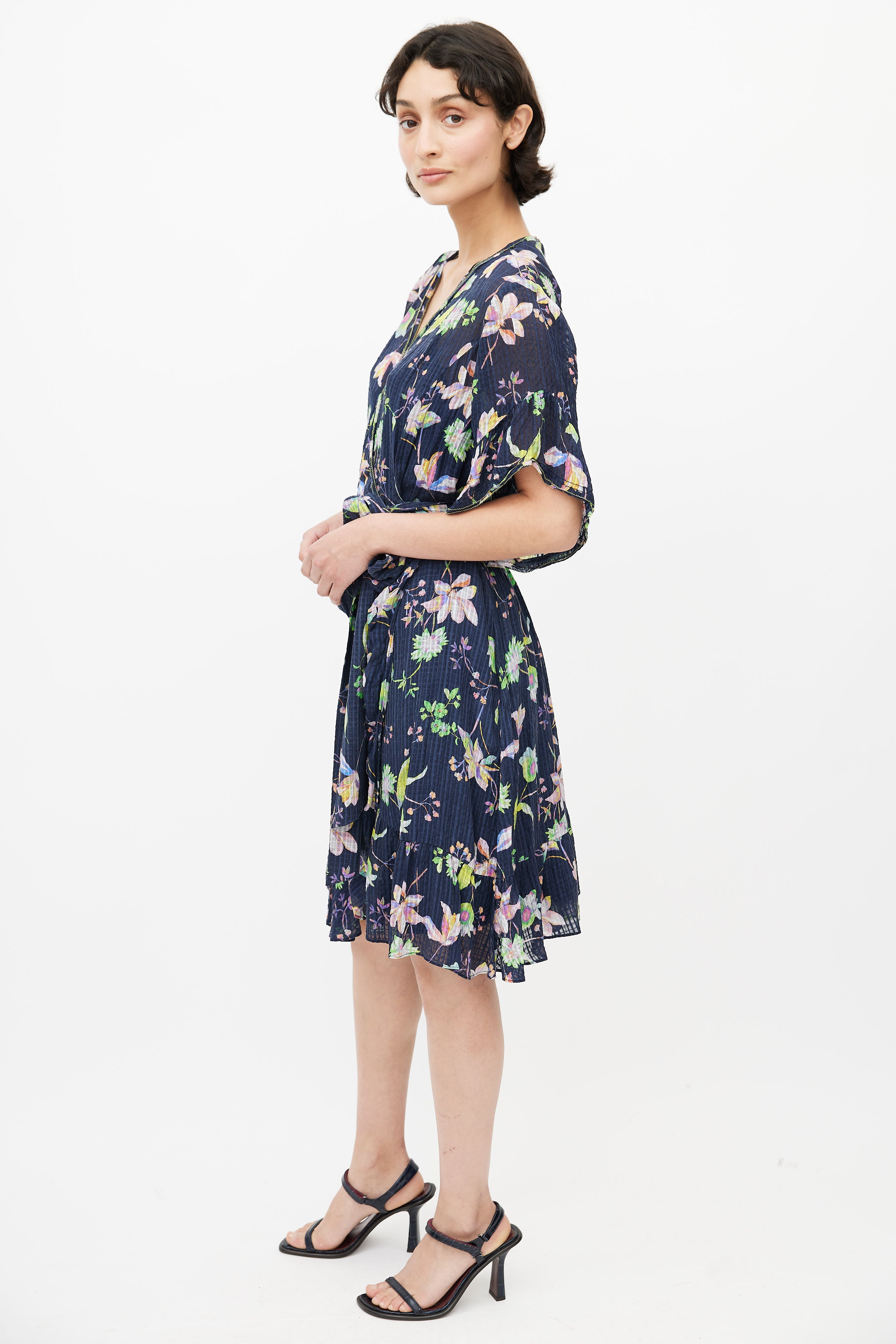 Pre-owned Tanya Taylor navy and multicolour silk floral wrap dress featuring a V-neck, short sleeves with flounce hem, faux wrap at chest and skirt, self tie wrap around belt, concealed inseam zip at left side and an interior slip dress.