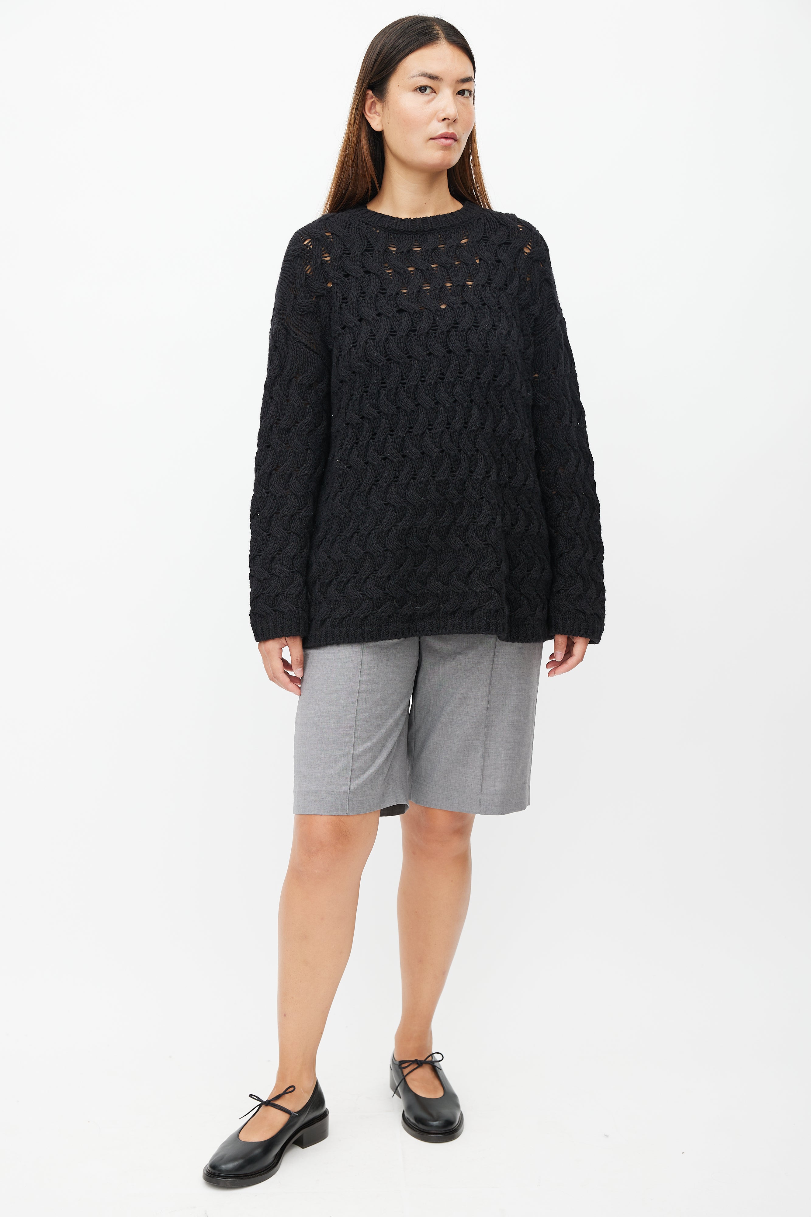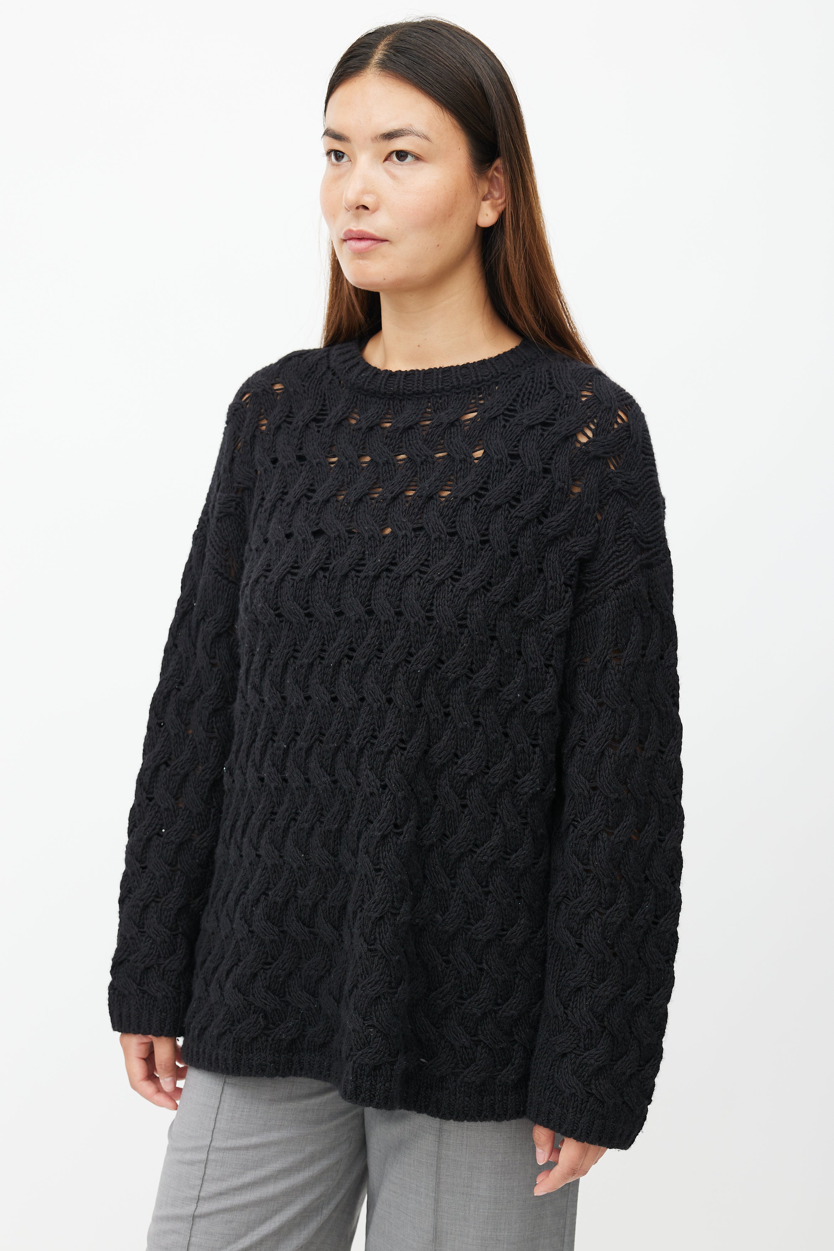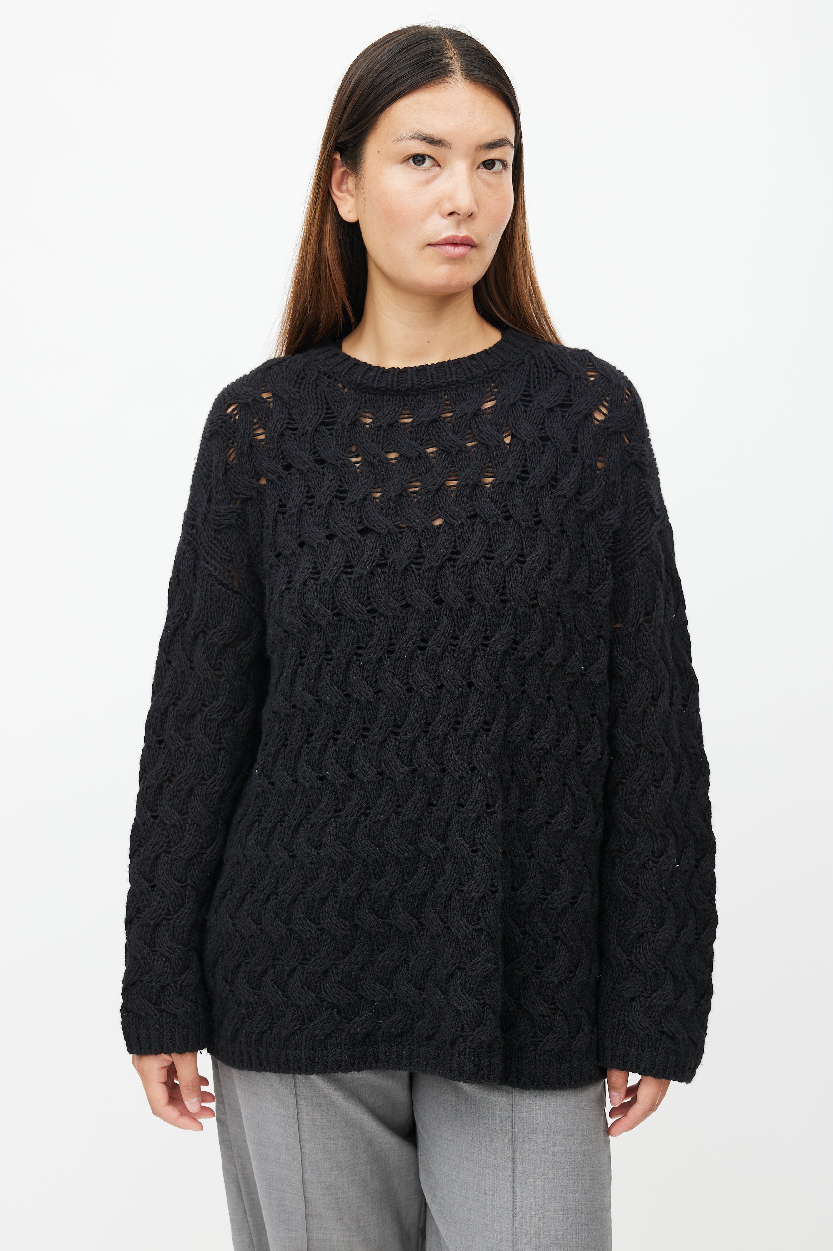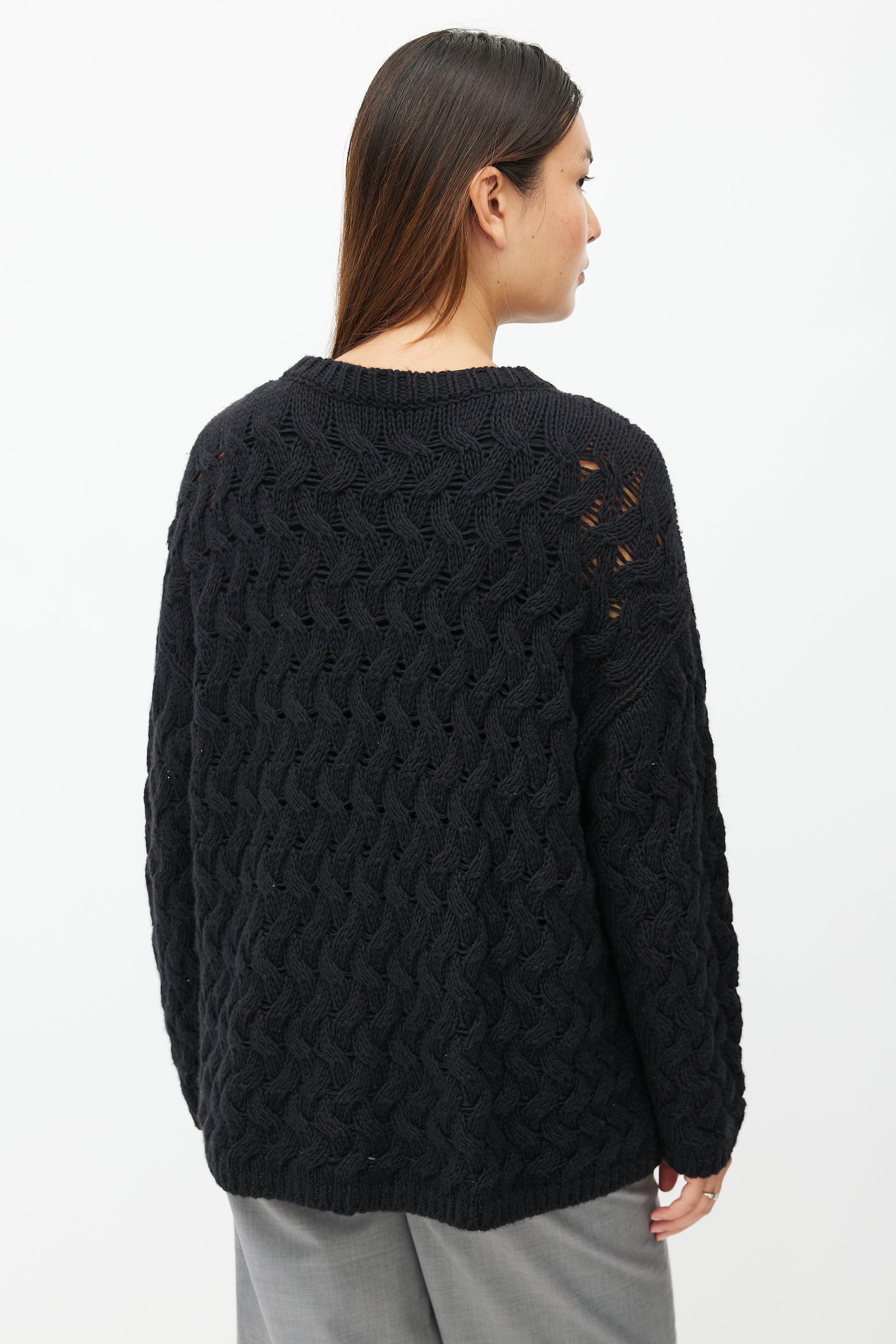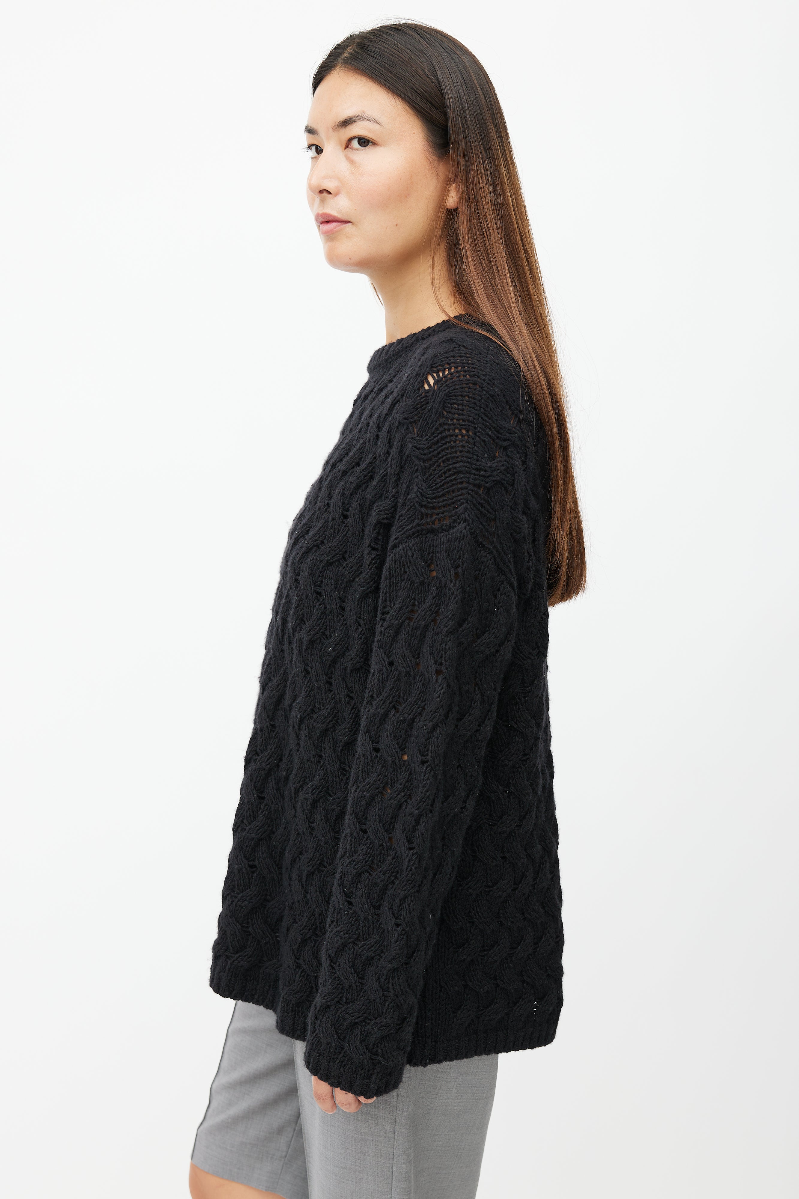 Pre-owned The Row black cashmere knit sweater featuring cableknit weave, crew neckline, drop shoulders, and ribbed hem.