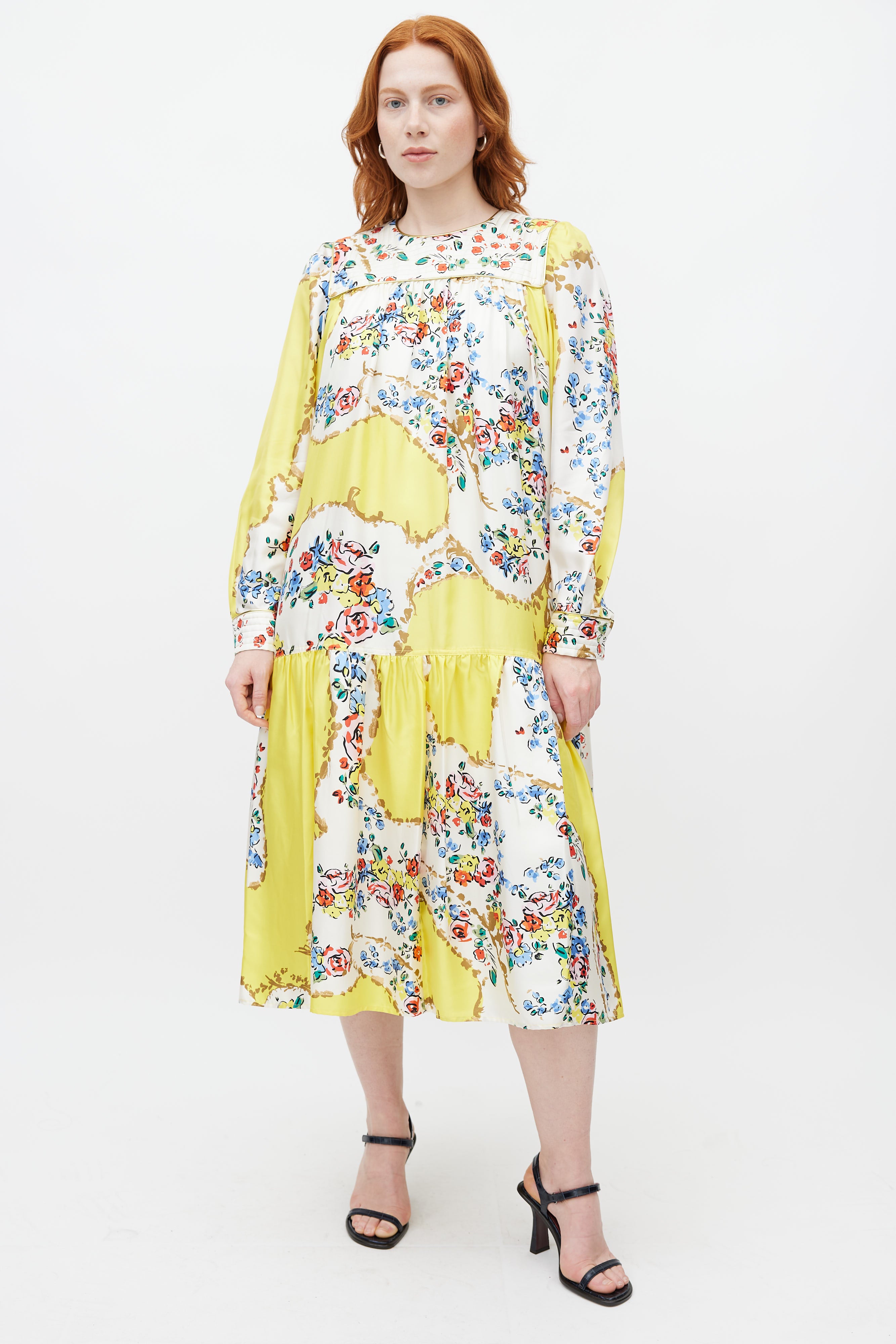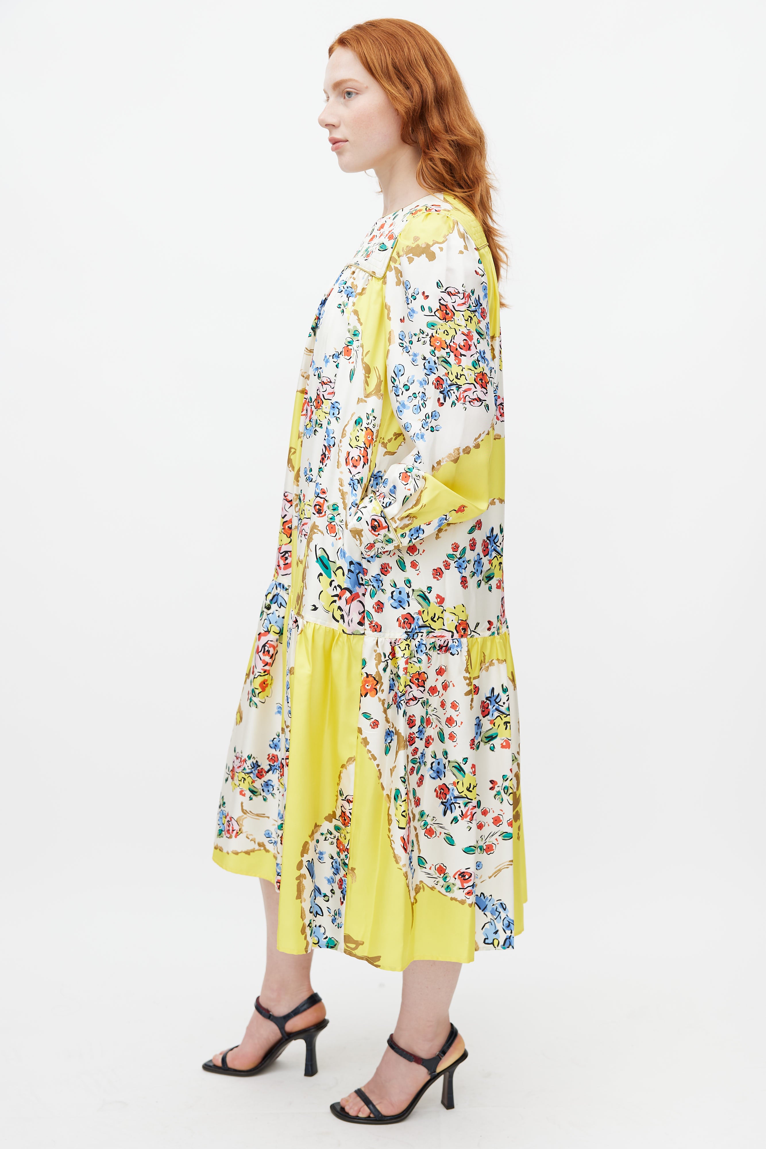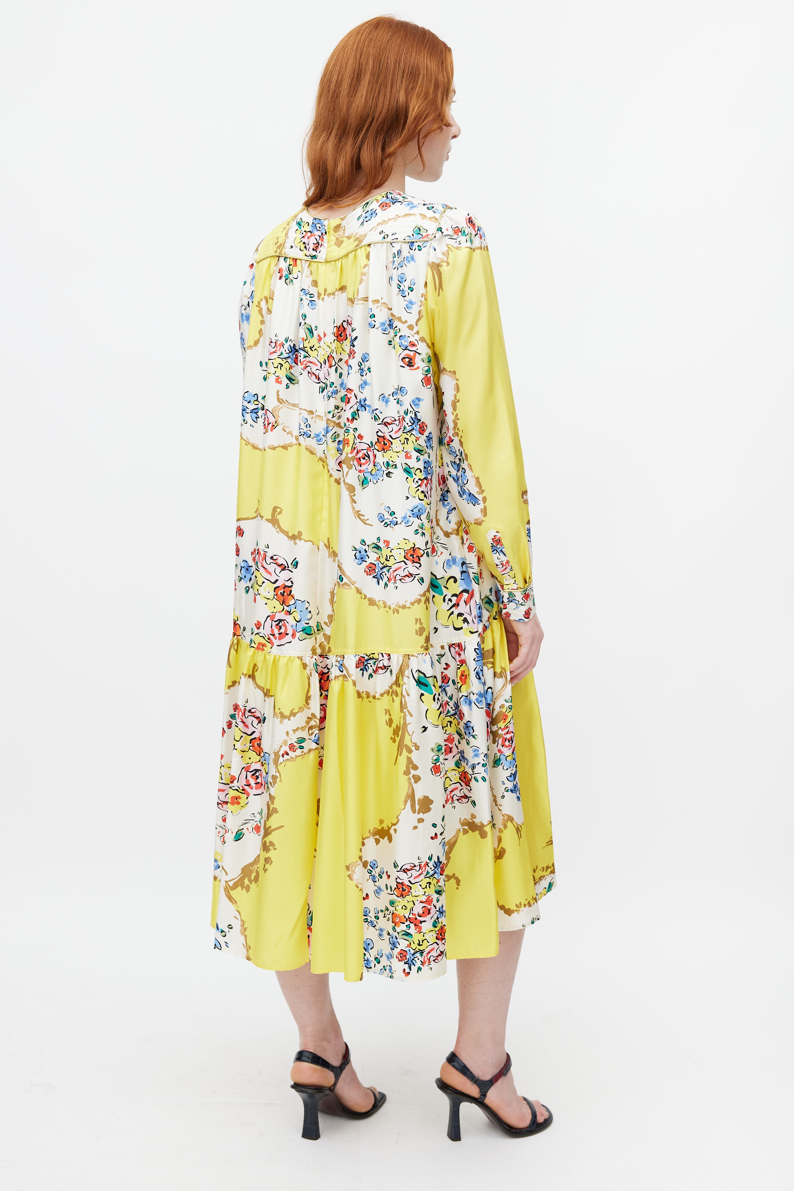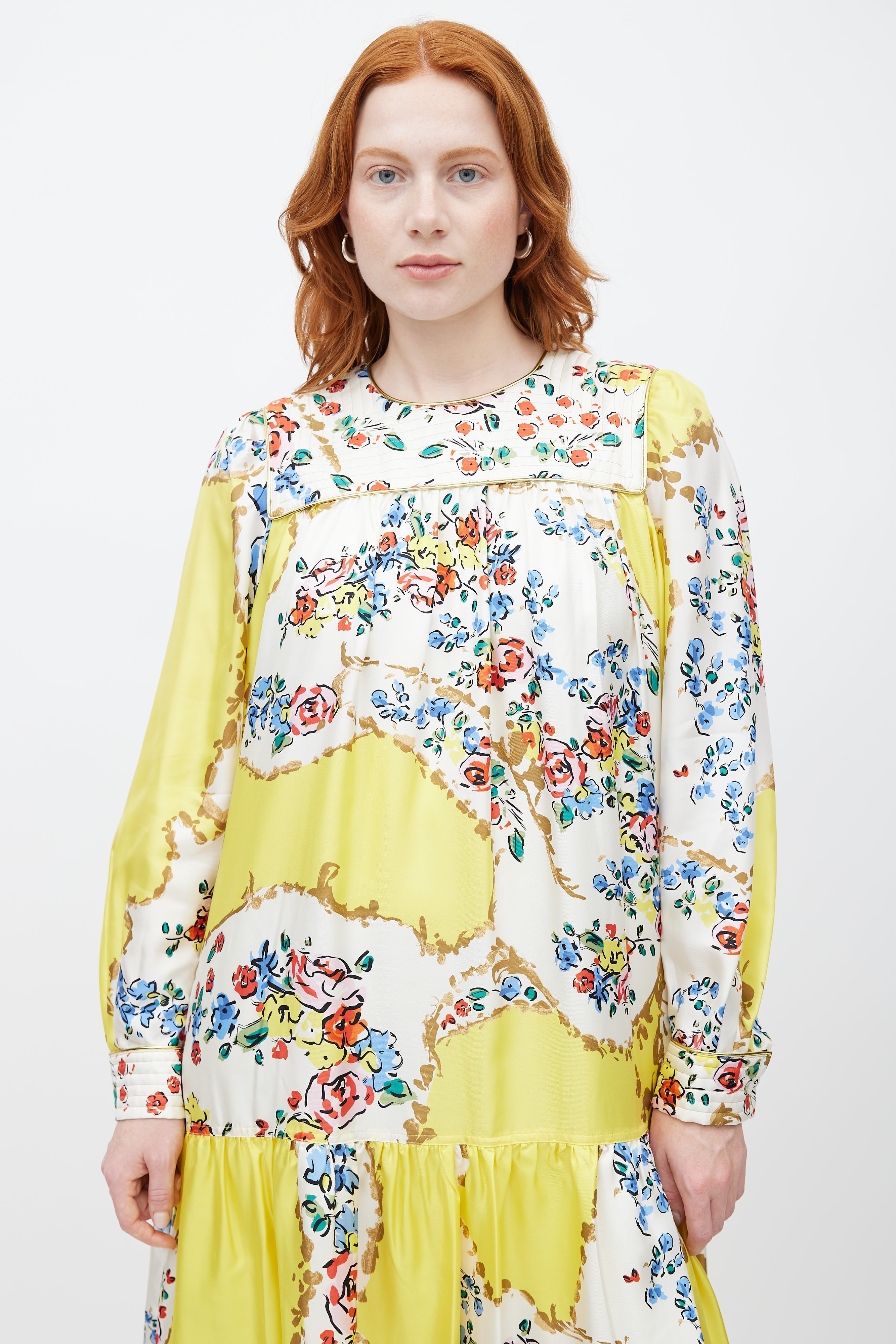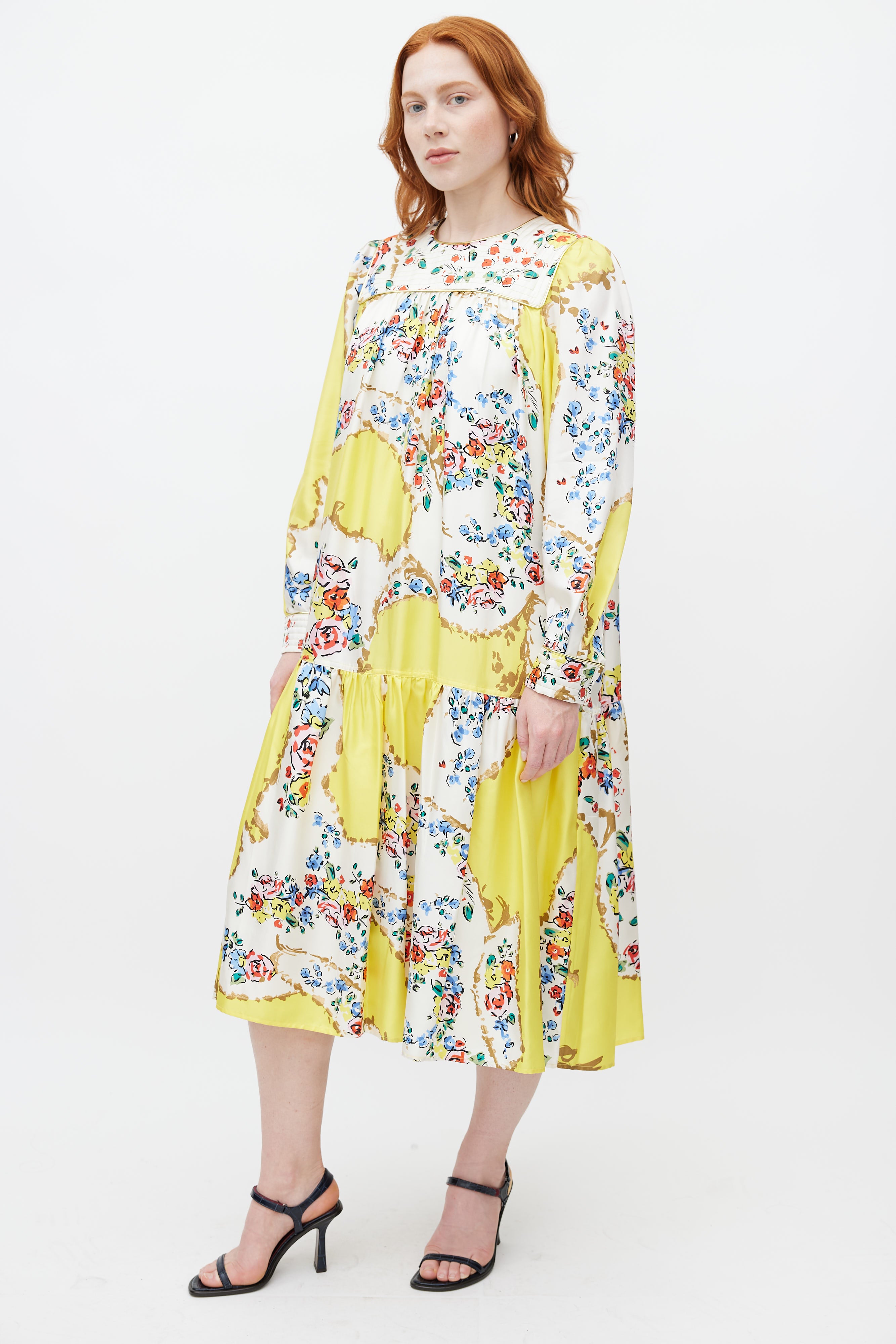 Tory Burch yellow silk dress featuring a multicolour floral print throughout, crew neckline with quilted detail, long sleeves with buttoned cuffs, tie belt at waist, and zip at back with hook and eye closure. Lined.