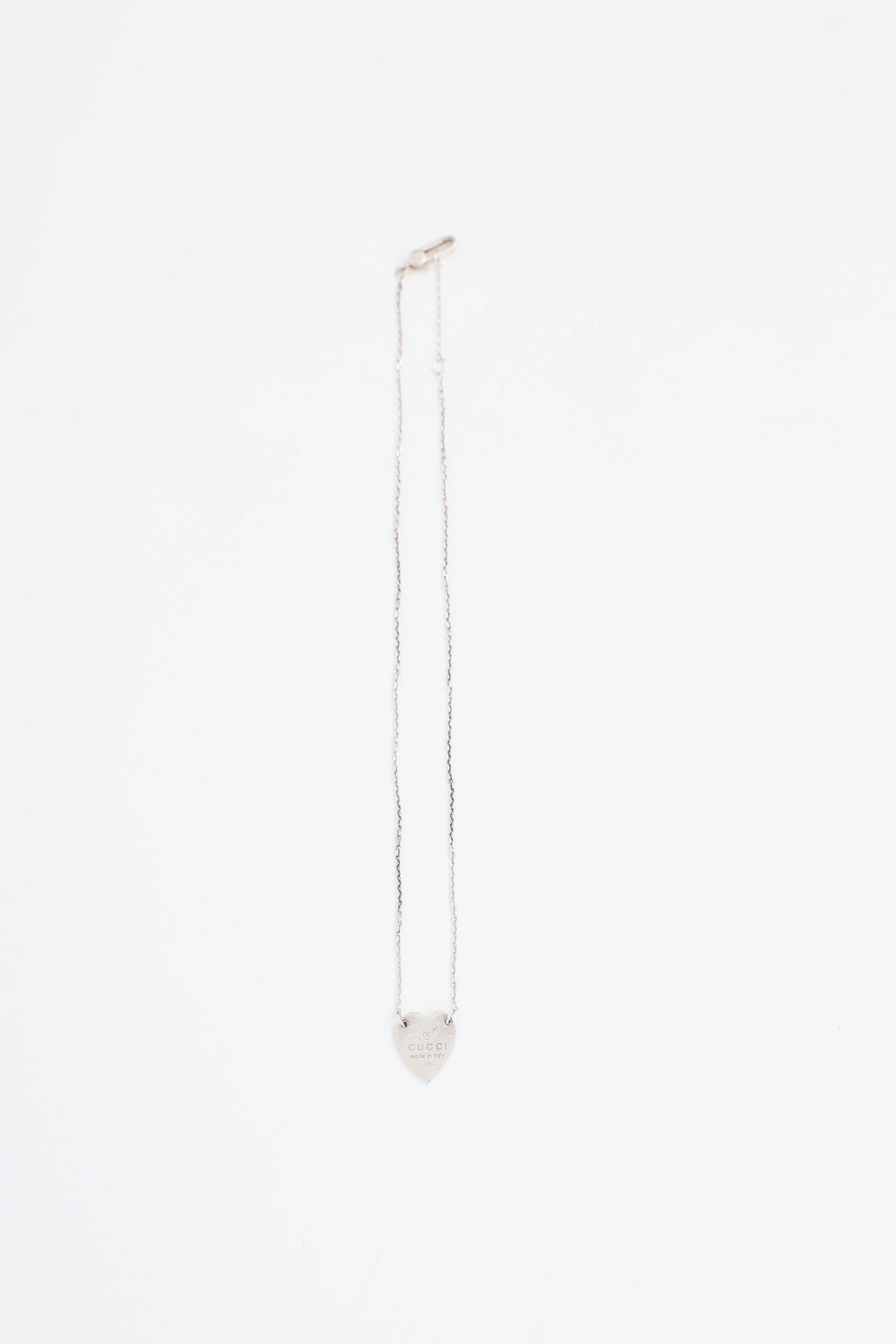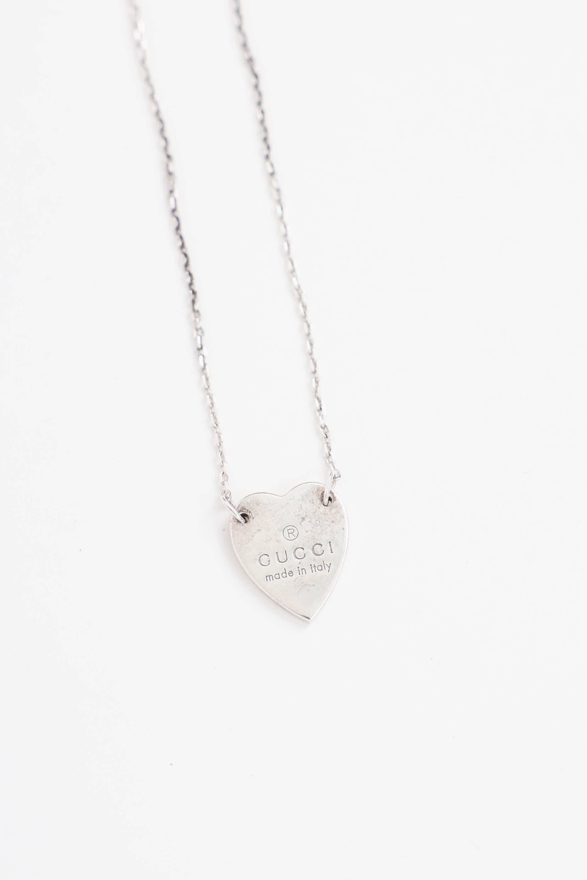 Pre-owned Gucci sterling silver necklace featuring a heart pendant with logo engraving, chain link, and lobster clasp closure. Includes original dust bag and box.