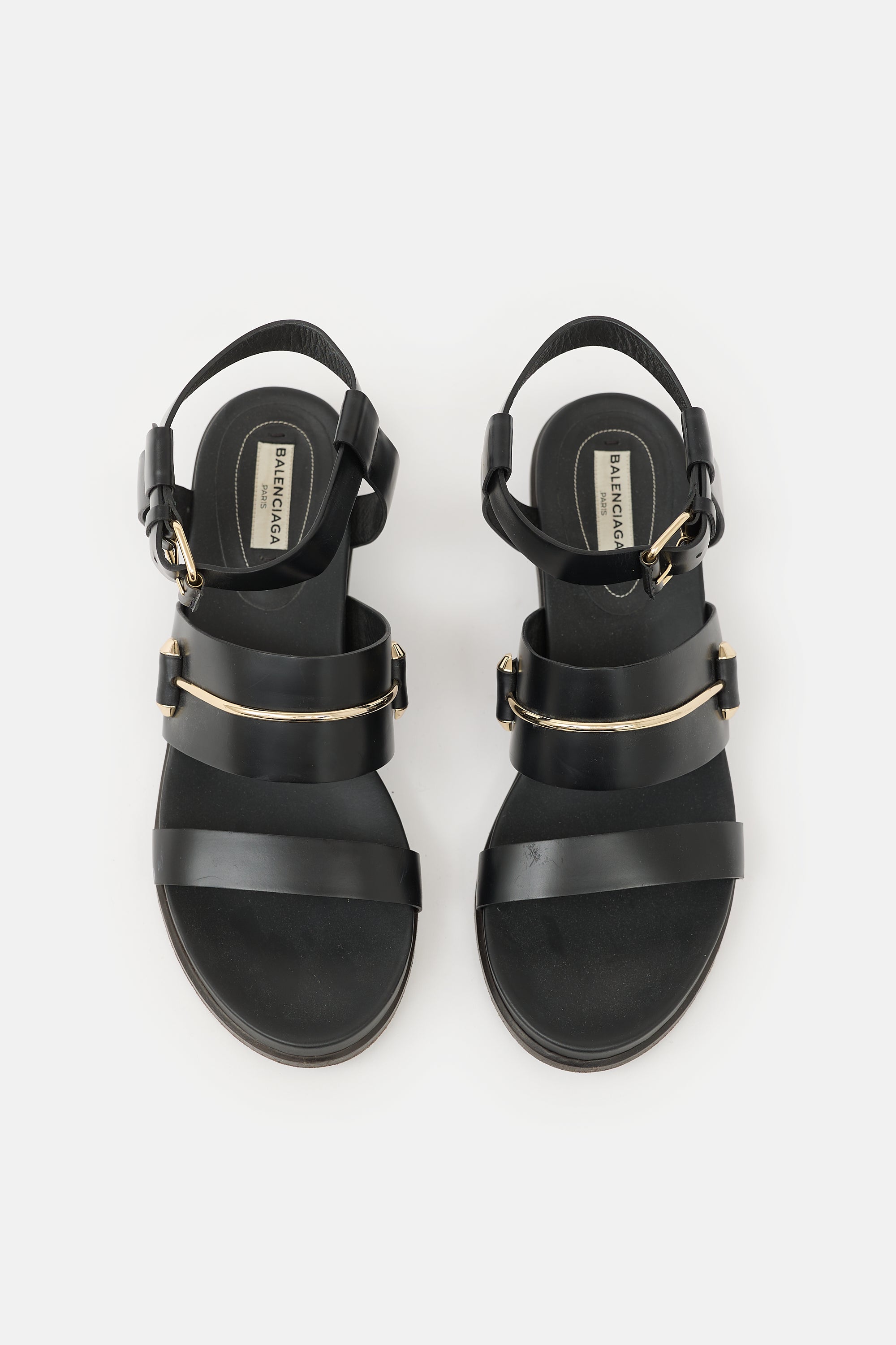 Pre-owned Balenciaga black leather Gladiator sandals featuring an open rounded toe, gold tone bar hardware at vamp, adjustable ankle strap, and short stacked heel.