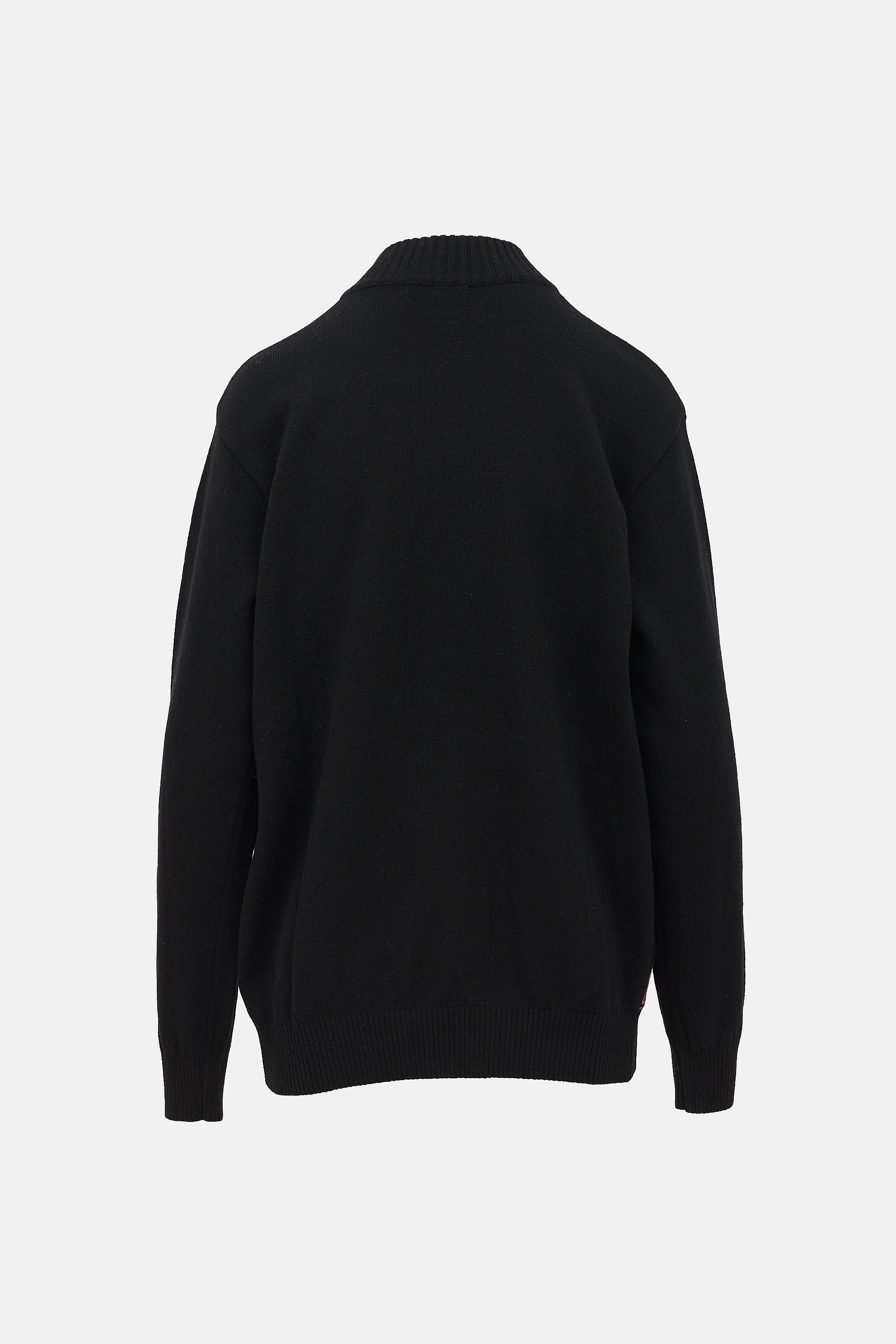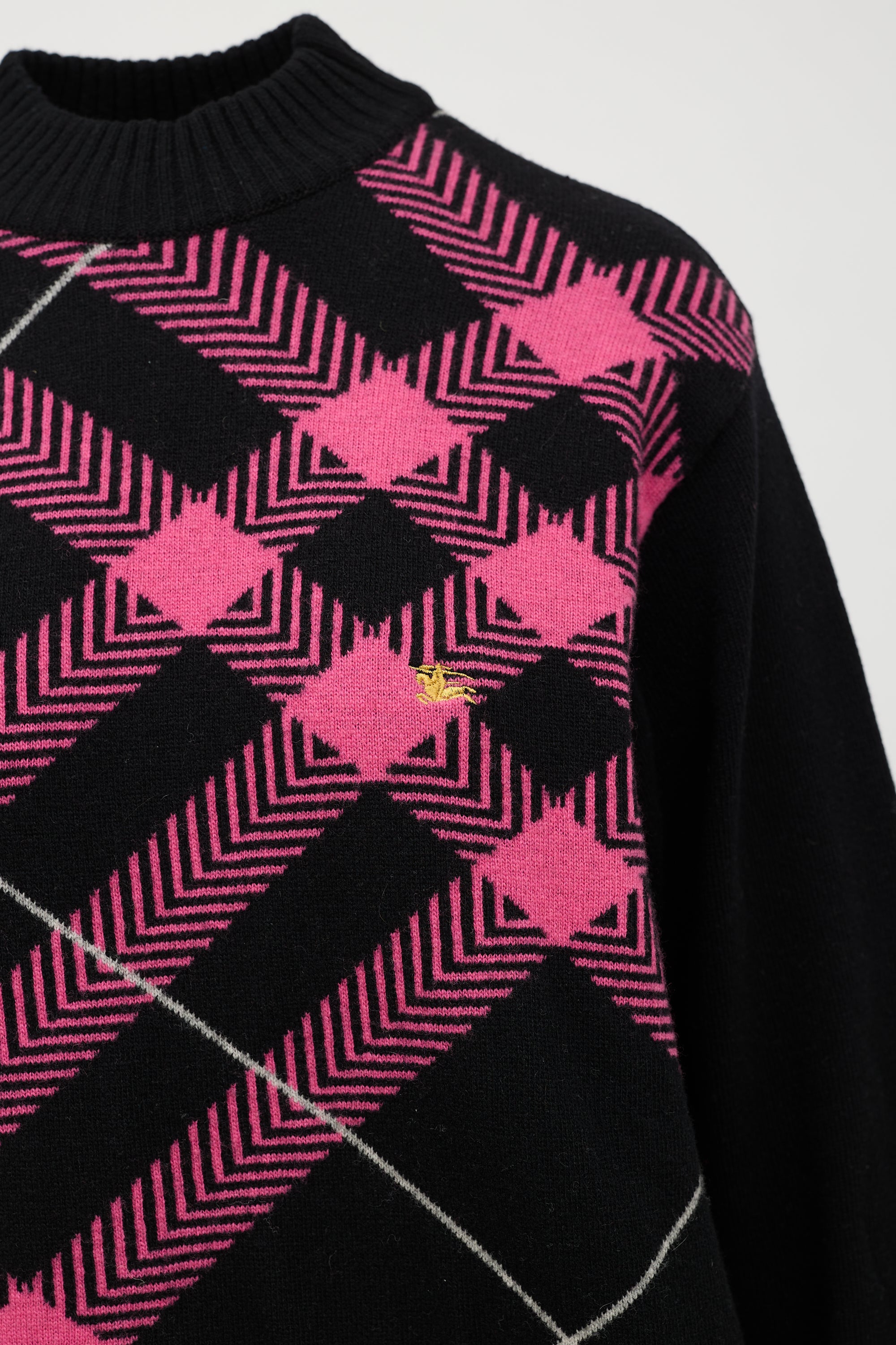 Pre-owned Burberry black and pink sweater featuring crewneck, check pattern at front, yellow embroidered logo at left chest, and ribbed collar, hem, and cuffs.