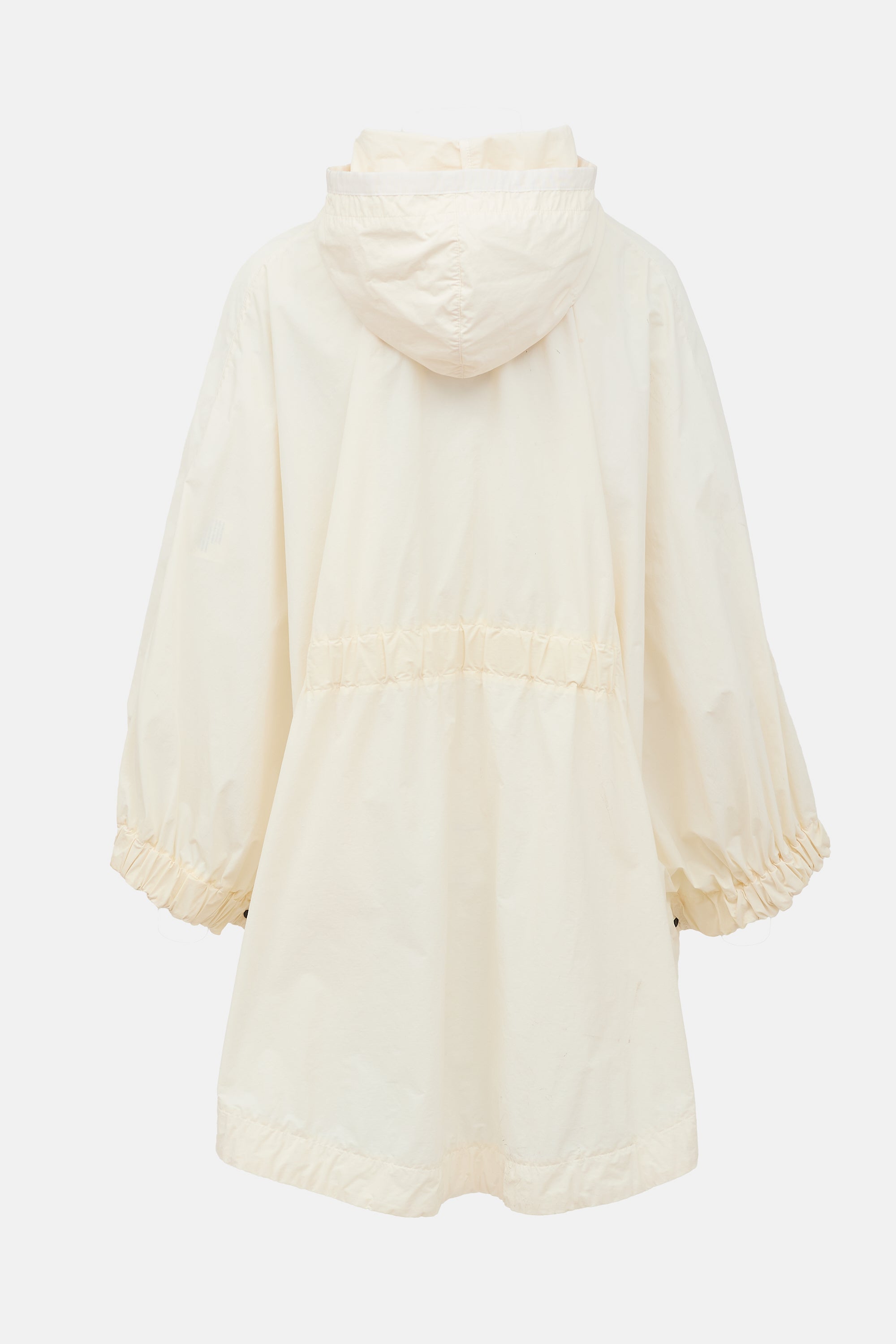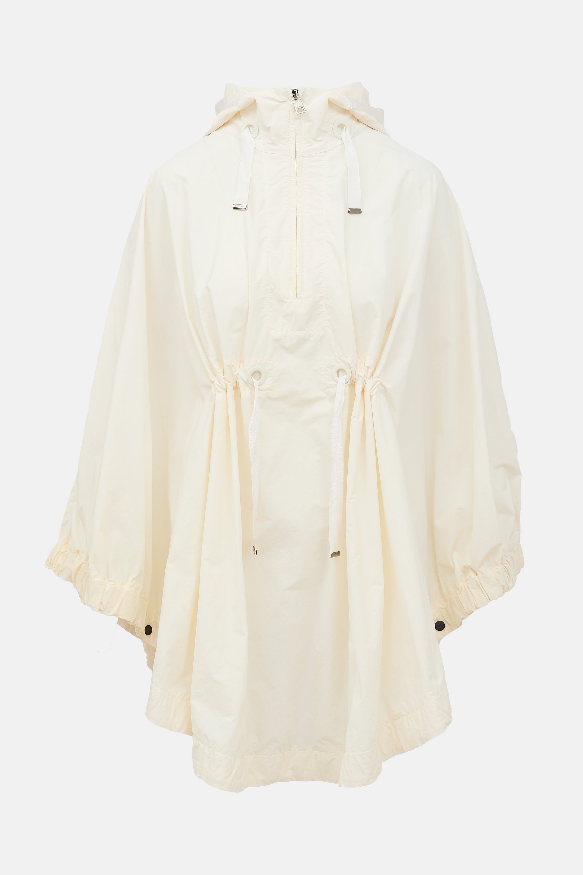 Pre-owned Fendi cream nylon cape featuring drawstring hood with grosgrain trim, quarter zip neckline, drawstring waist, snap buttons at hem for armhole, and elasticized back waist and cuffs.