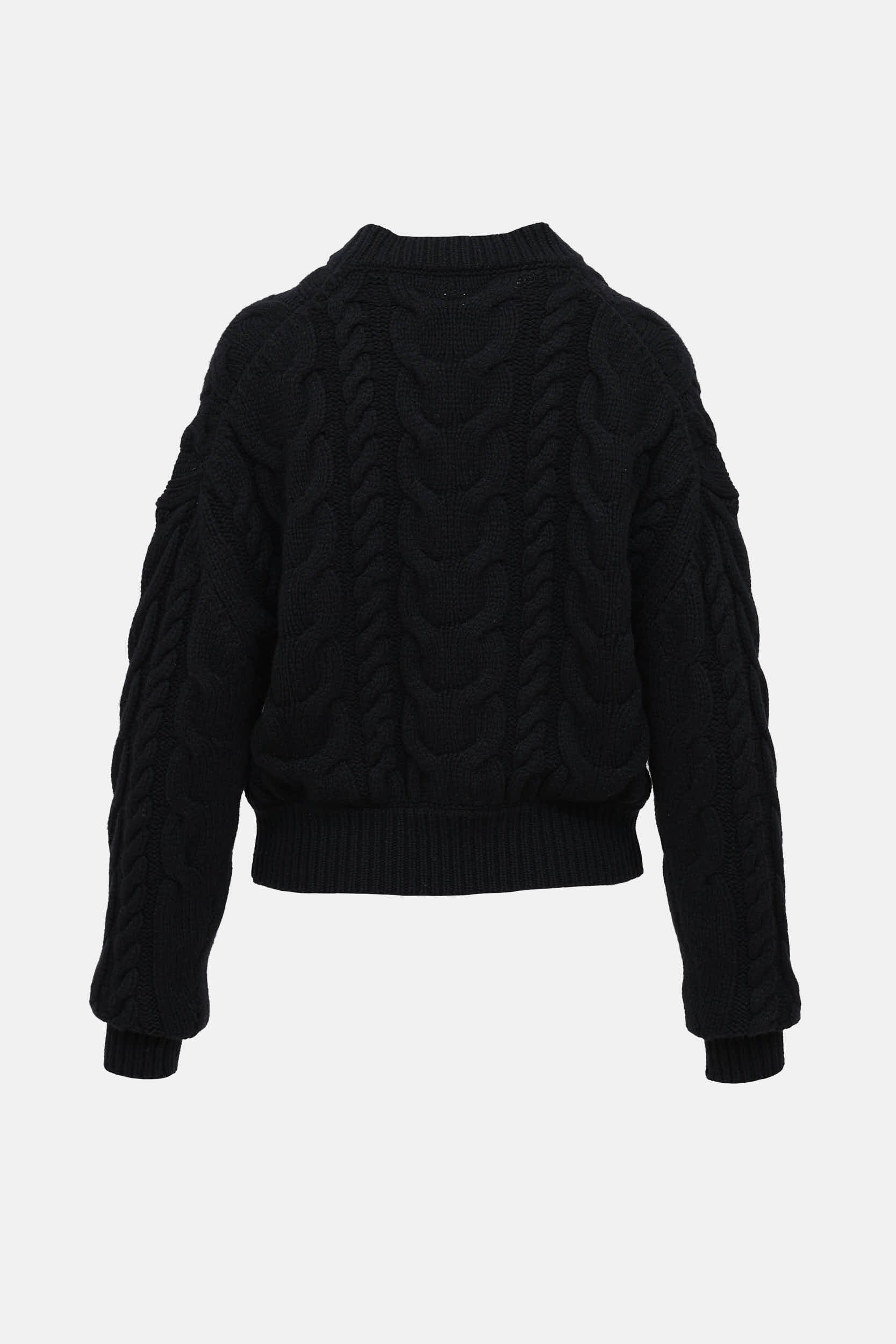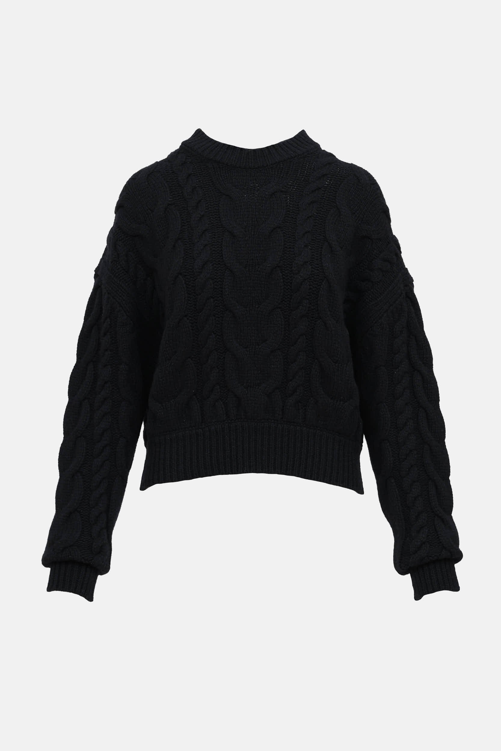Pre-owned Frame black knit long sleeve sweater featuring mock neckline, cable knit, dropped shoulders, and ribbed knit trims.