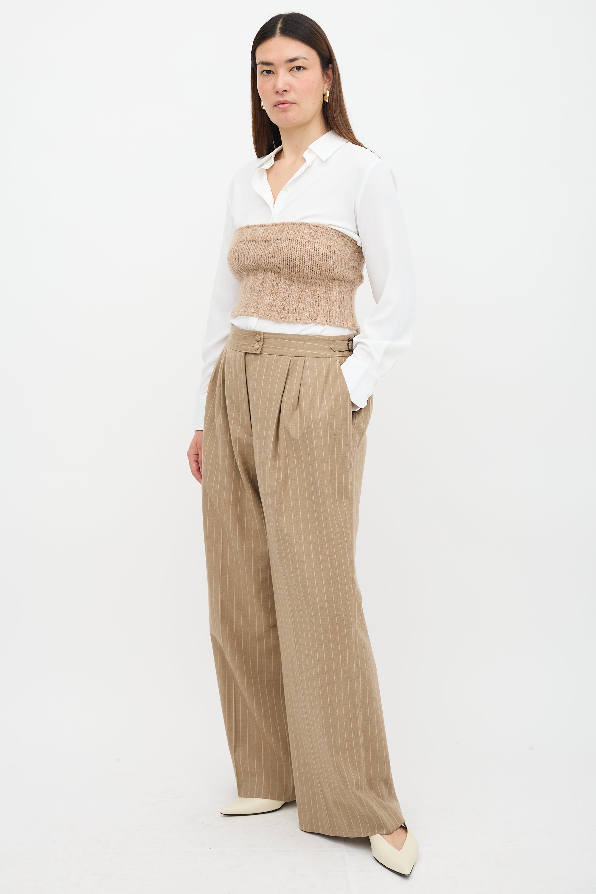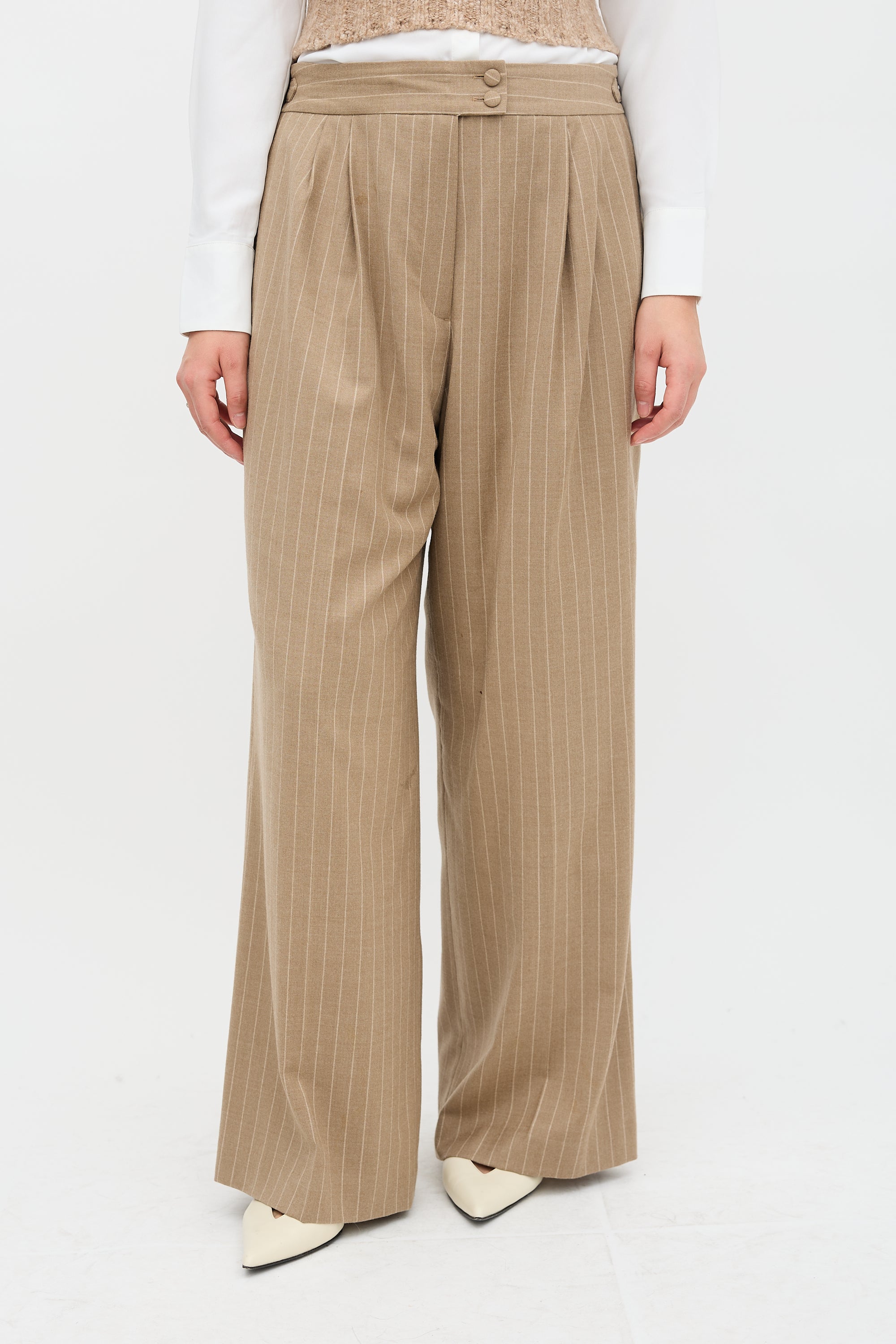 Pre-owned Godwin Charli brown wool pinstripe Florence trouser featuring a zip fly with covered button fastening, adjustable straps at sides, two inseam pockets, pleated front, and a wide leg.