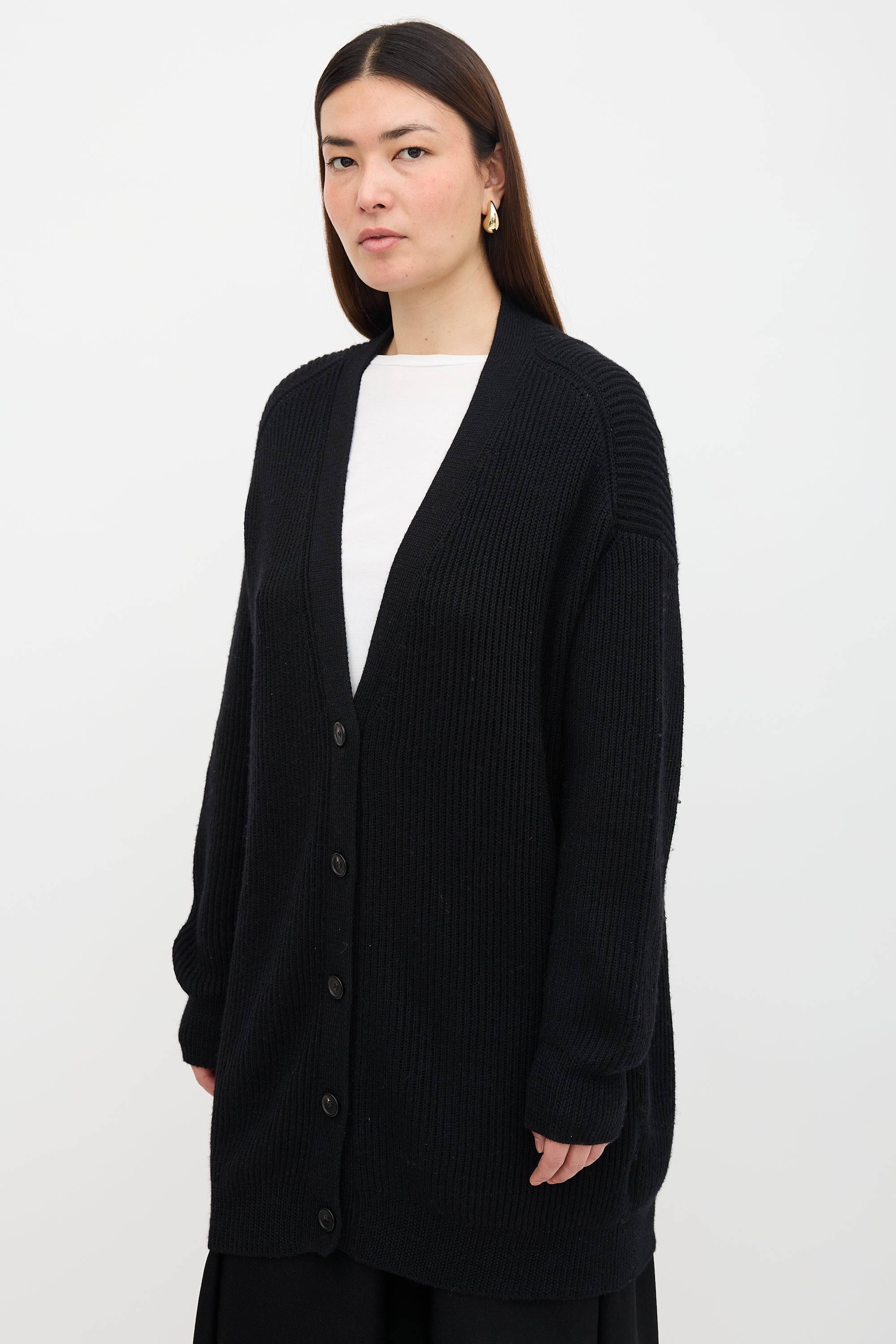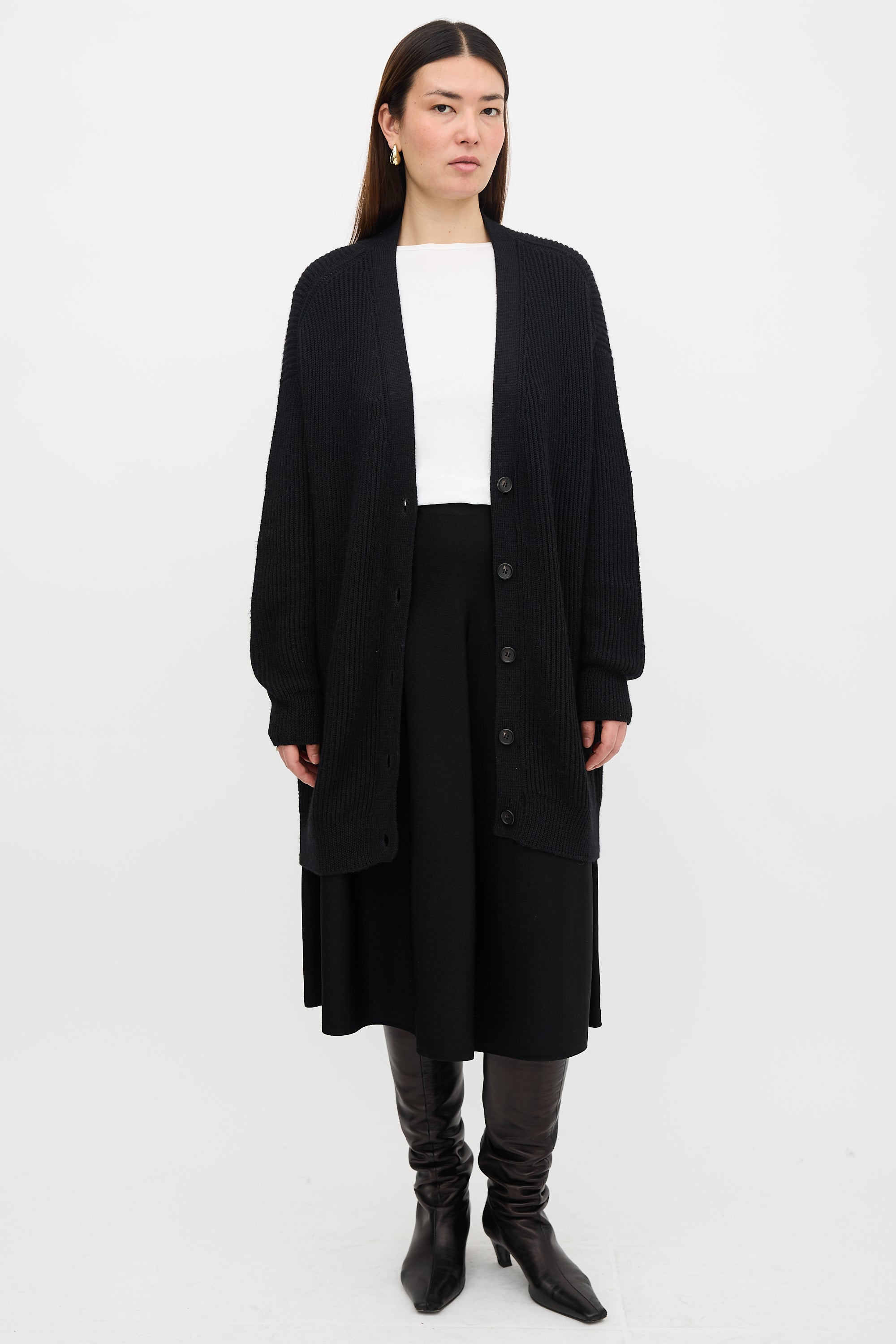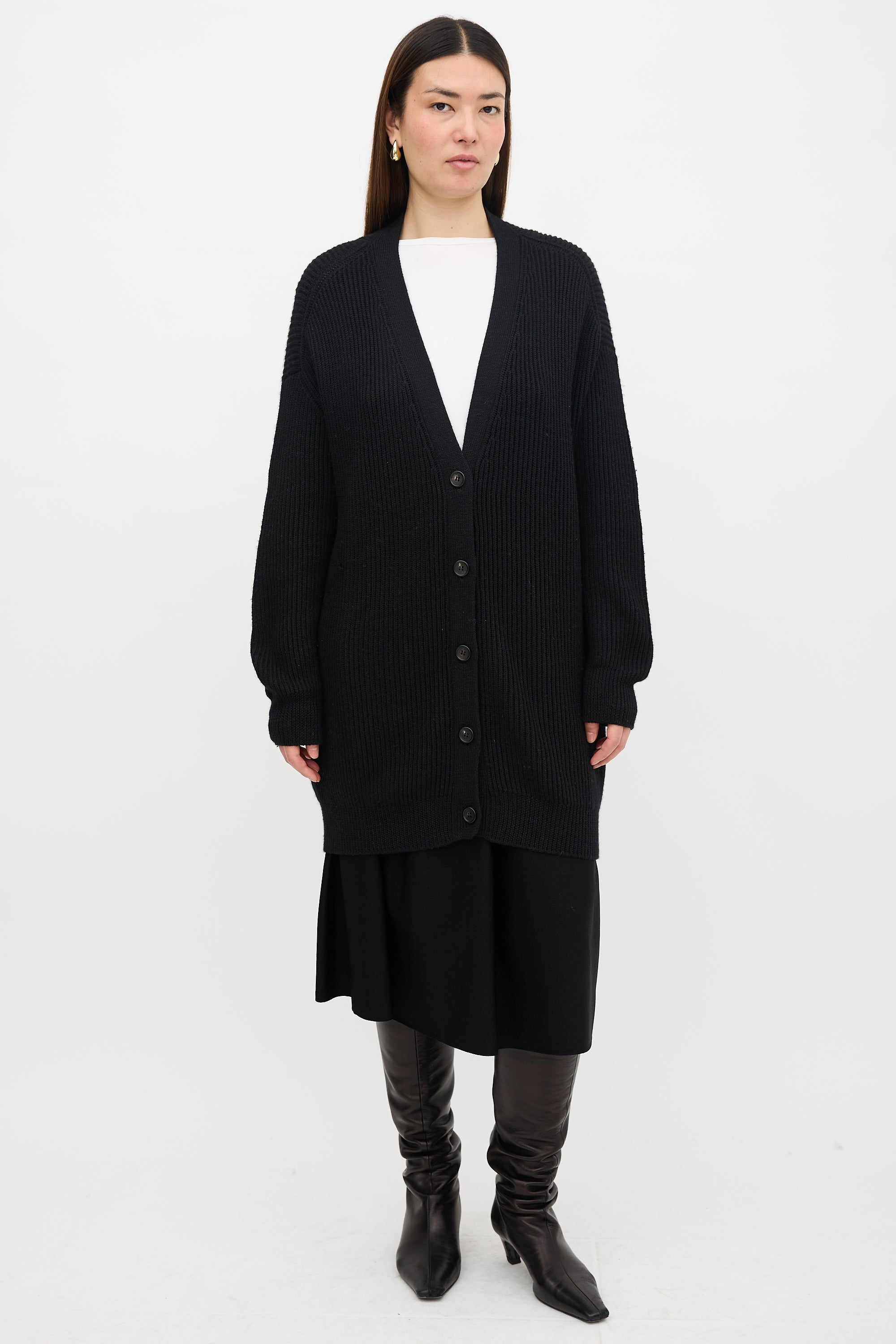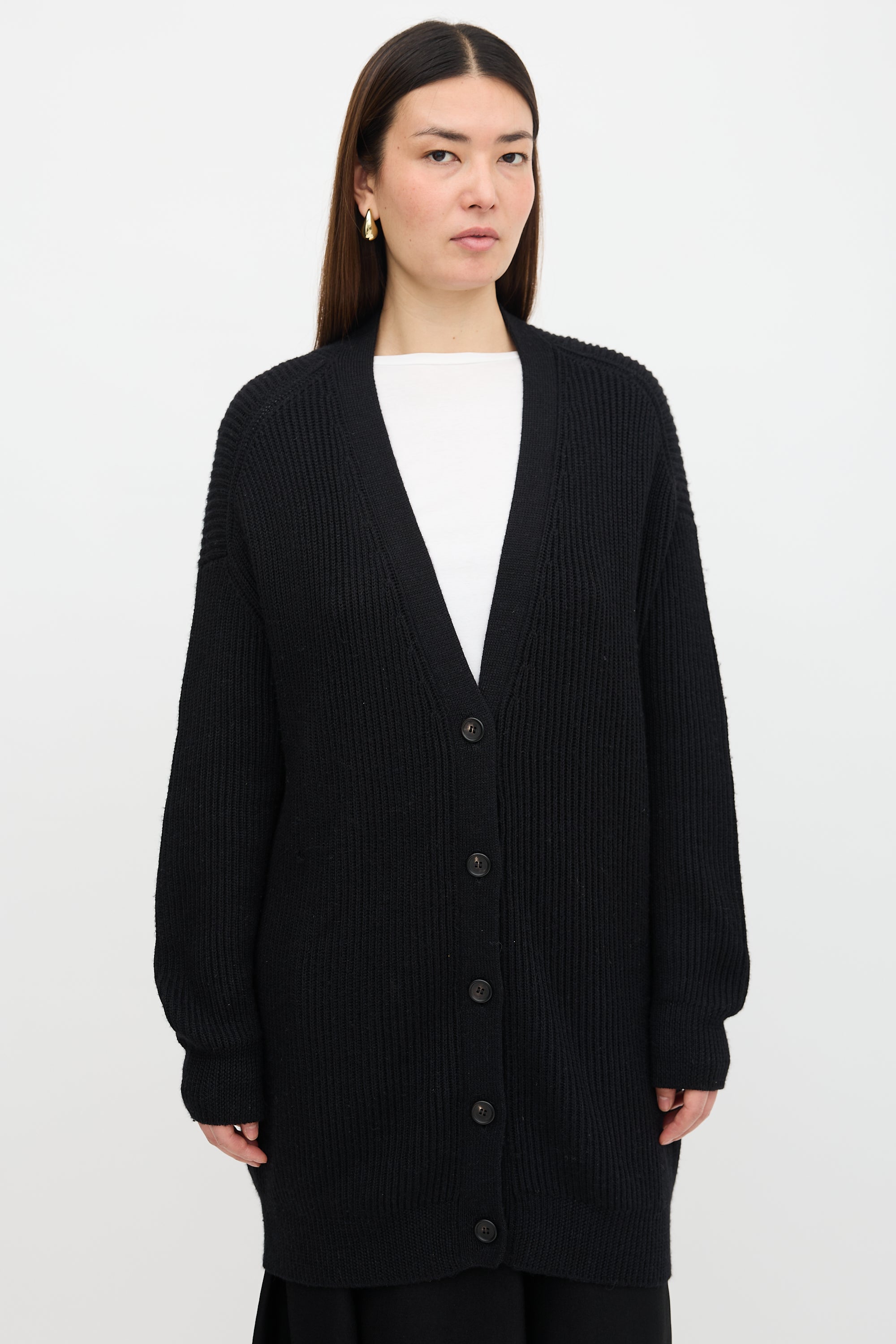 Pre-owned Håndværk black ribbed alpaca long cardigan featuring a V-neckline and a ribbed hem and cuffs.