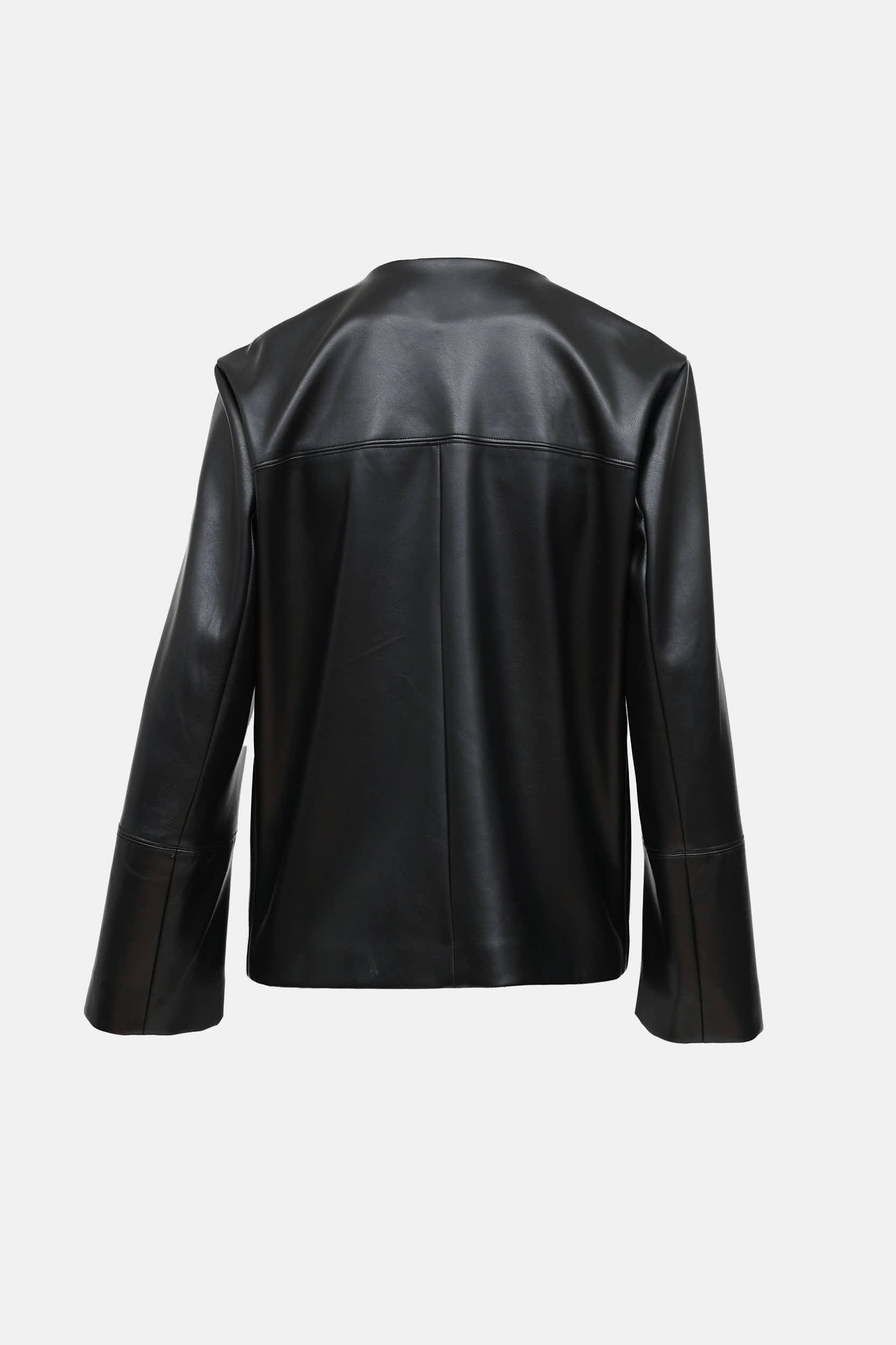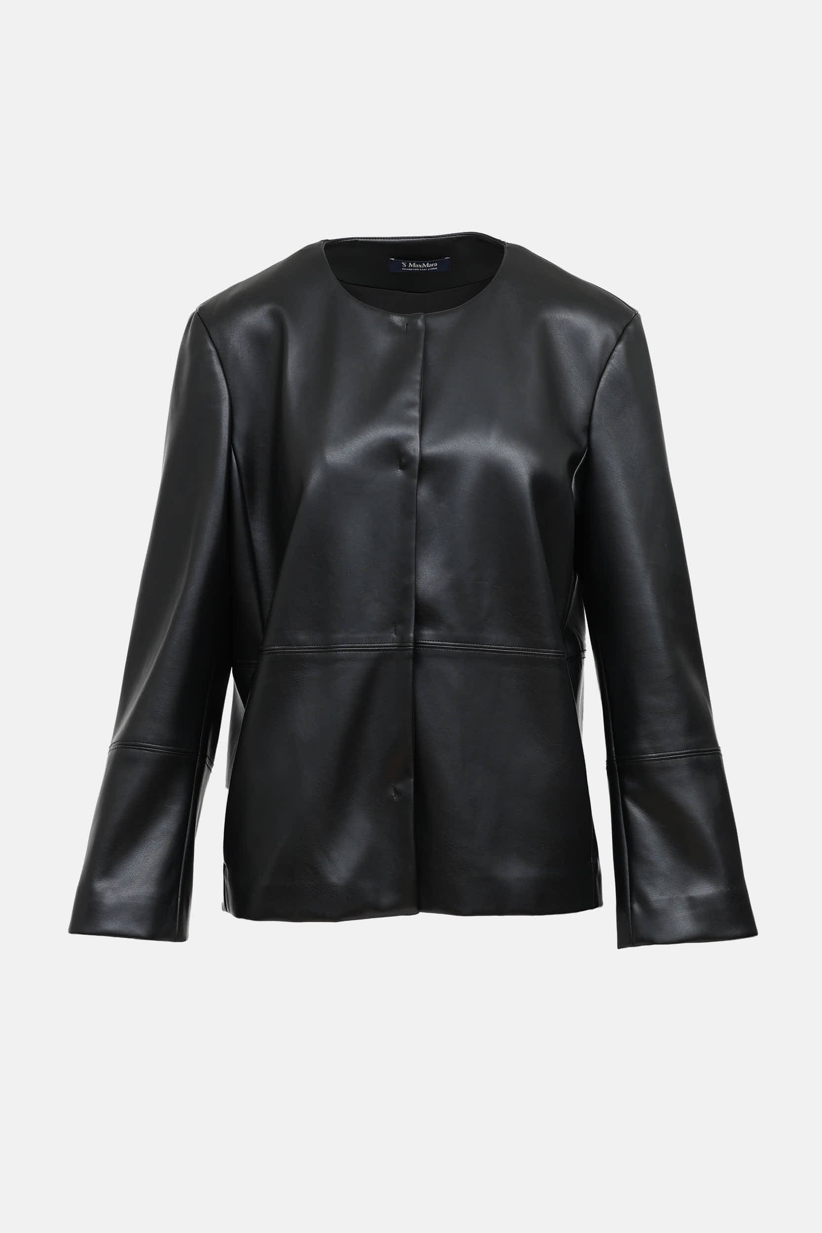 Pre-owned Max Mara black long sleeve jacket featuring round neckline, snap button front, and slit pockets at side. Lined.