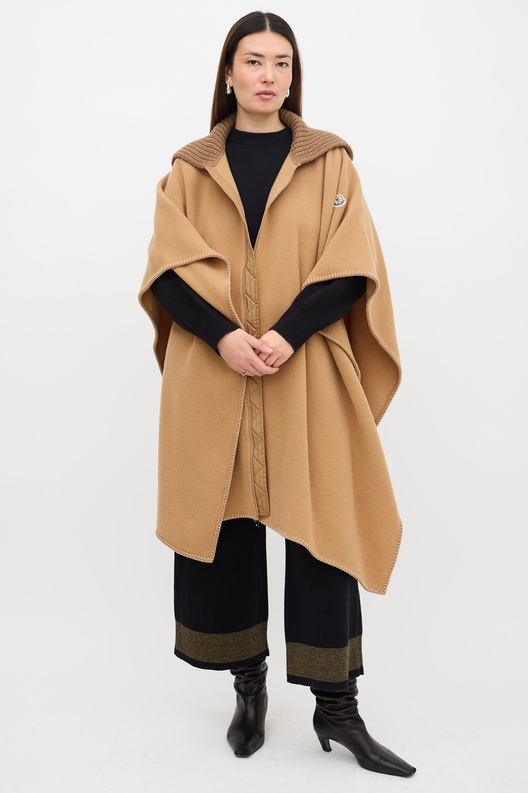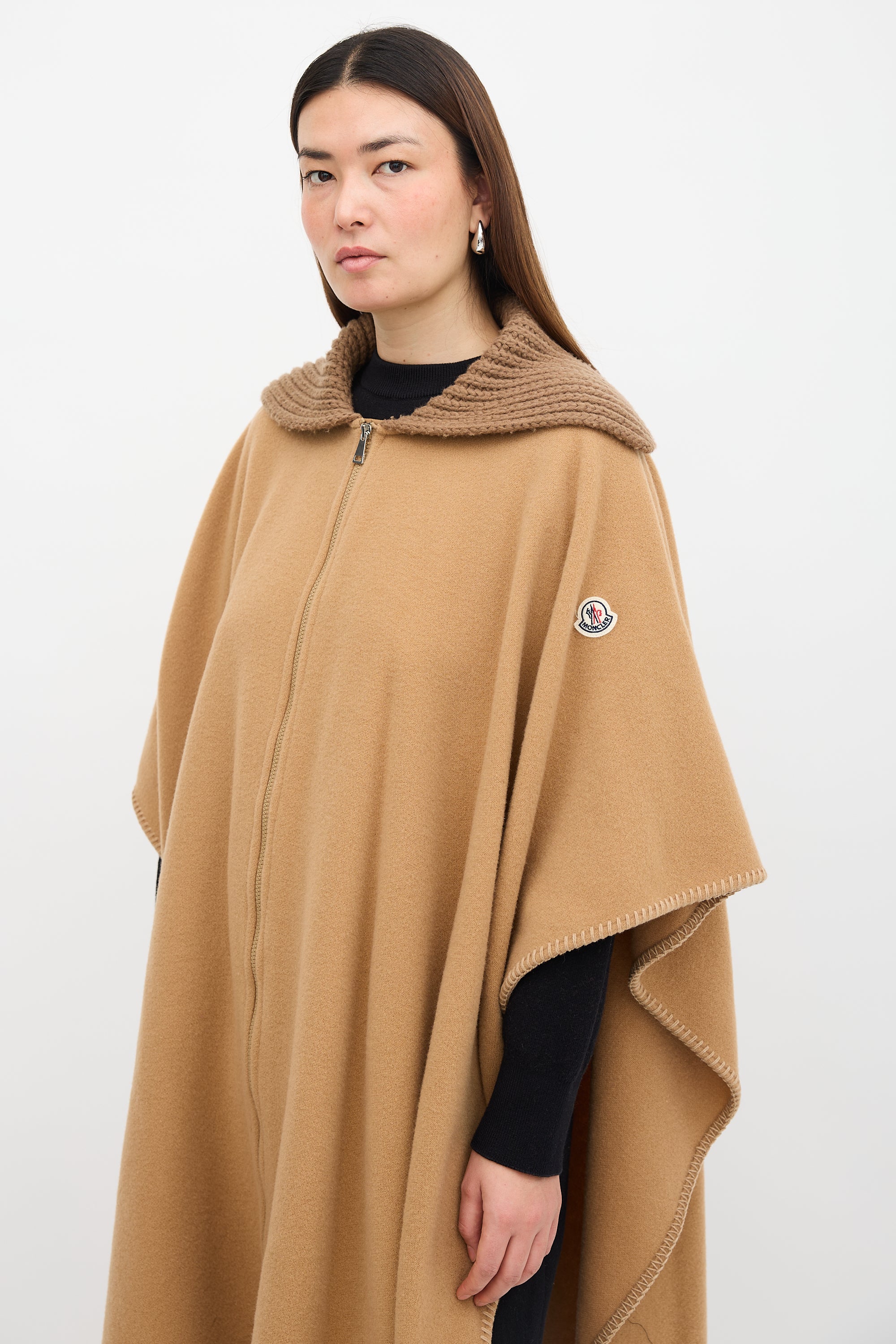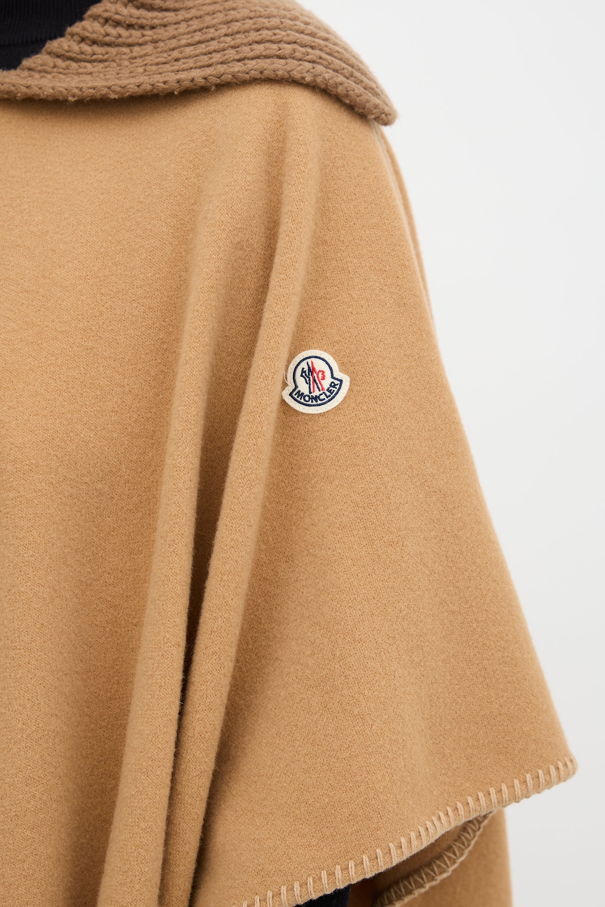Pre-owned Moncler beige wool cape featuring a ribbed classic collar, two way zip front, felted logo patch, and whipstitched edges.