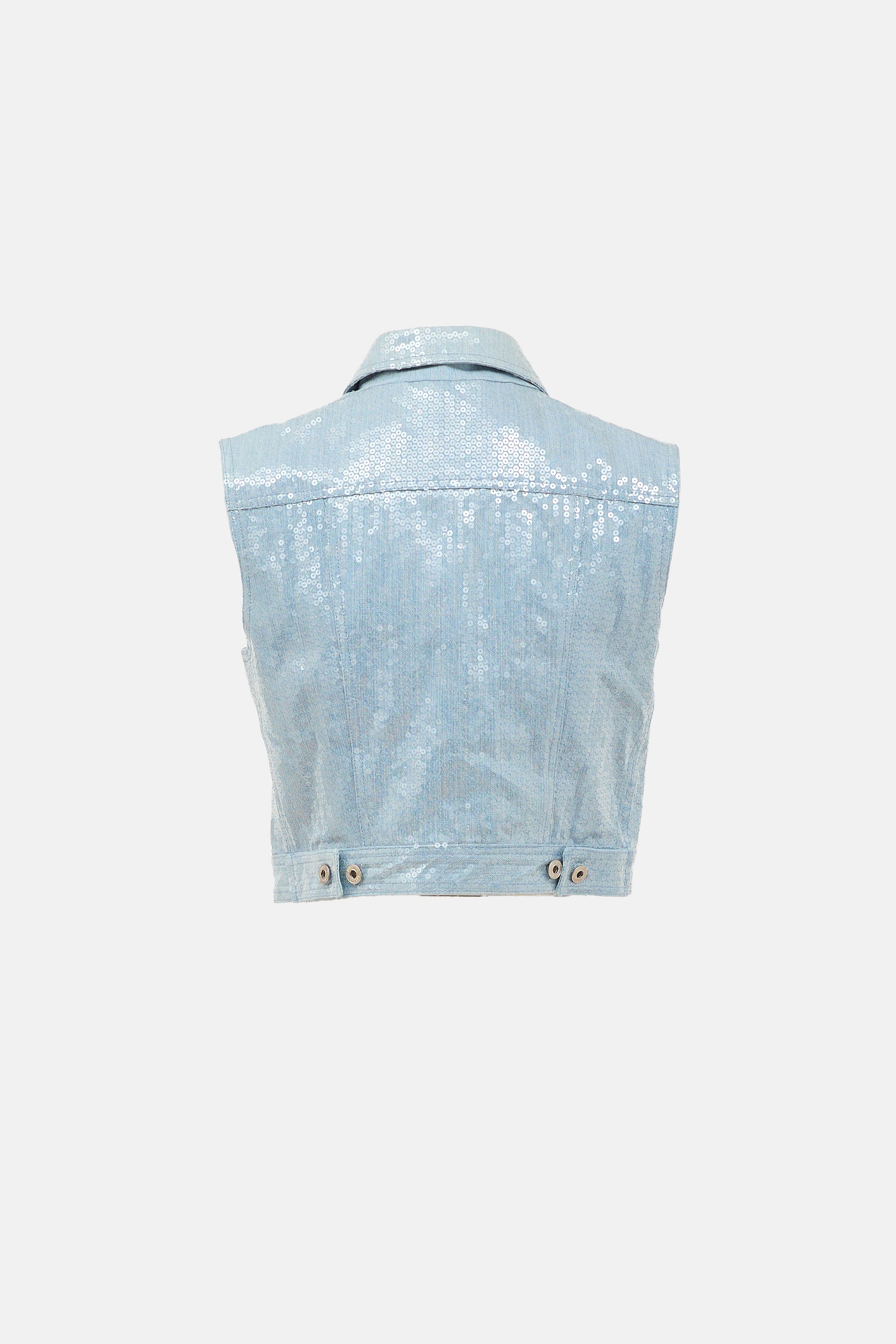 Pre-owned Moschino light wash denim vest featuring all over transparent sequins, spread collar, button up front, two flap pockets at chest, and adjustable hem. Lined.