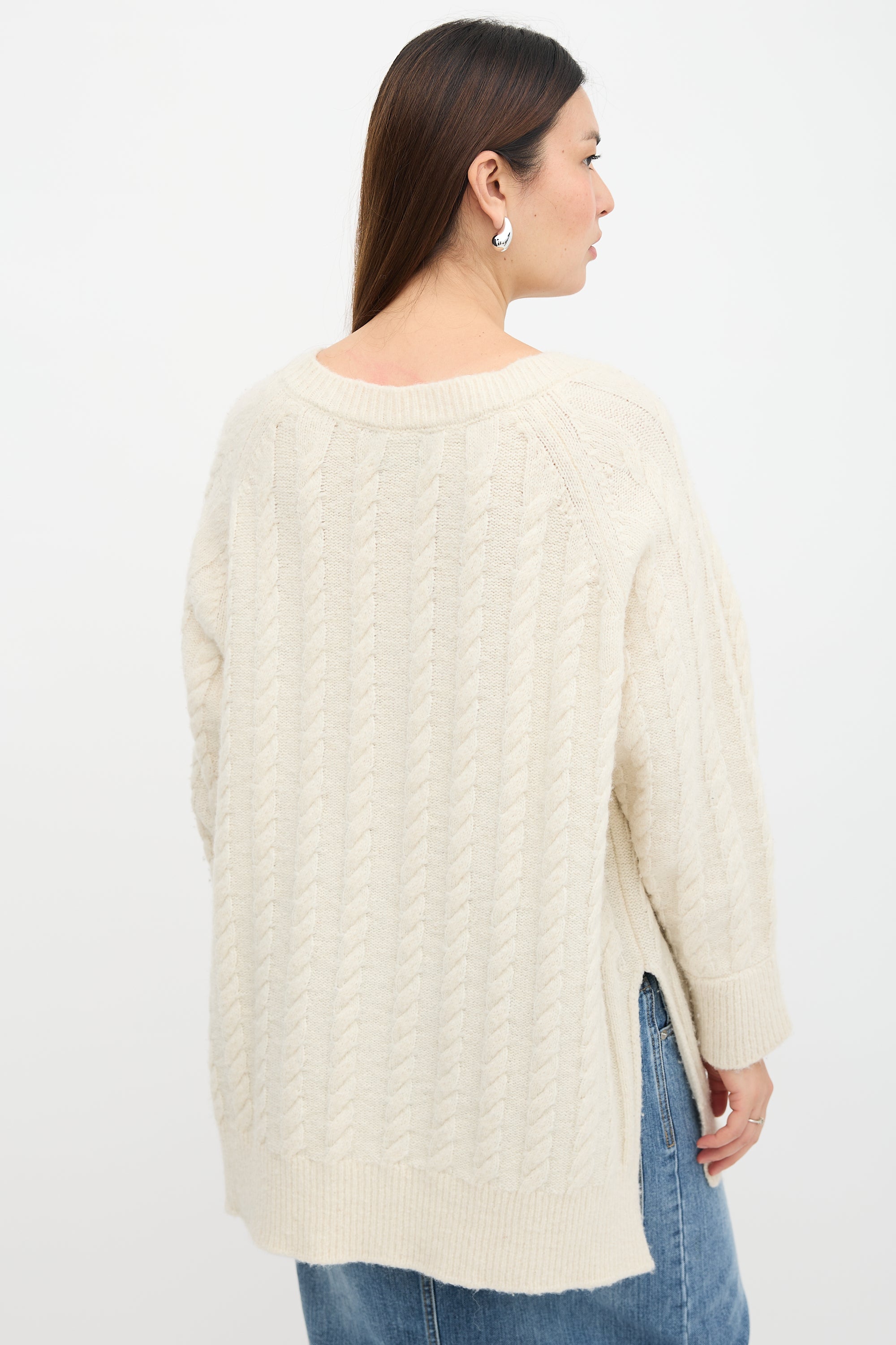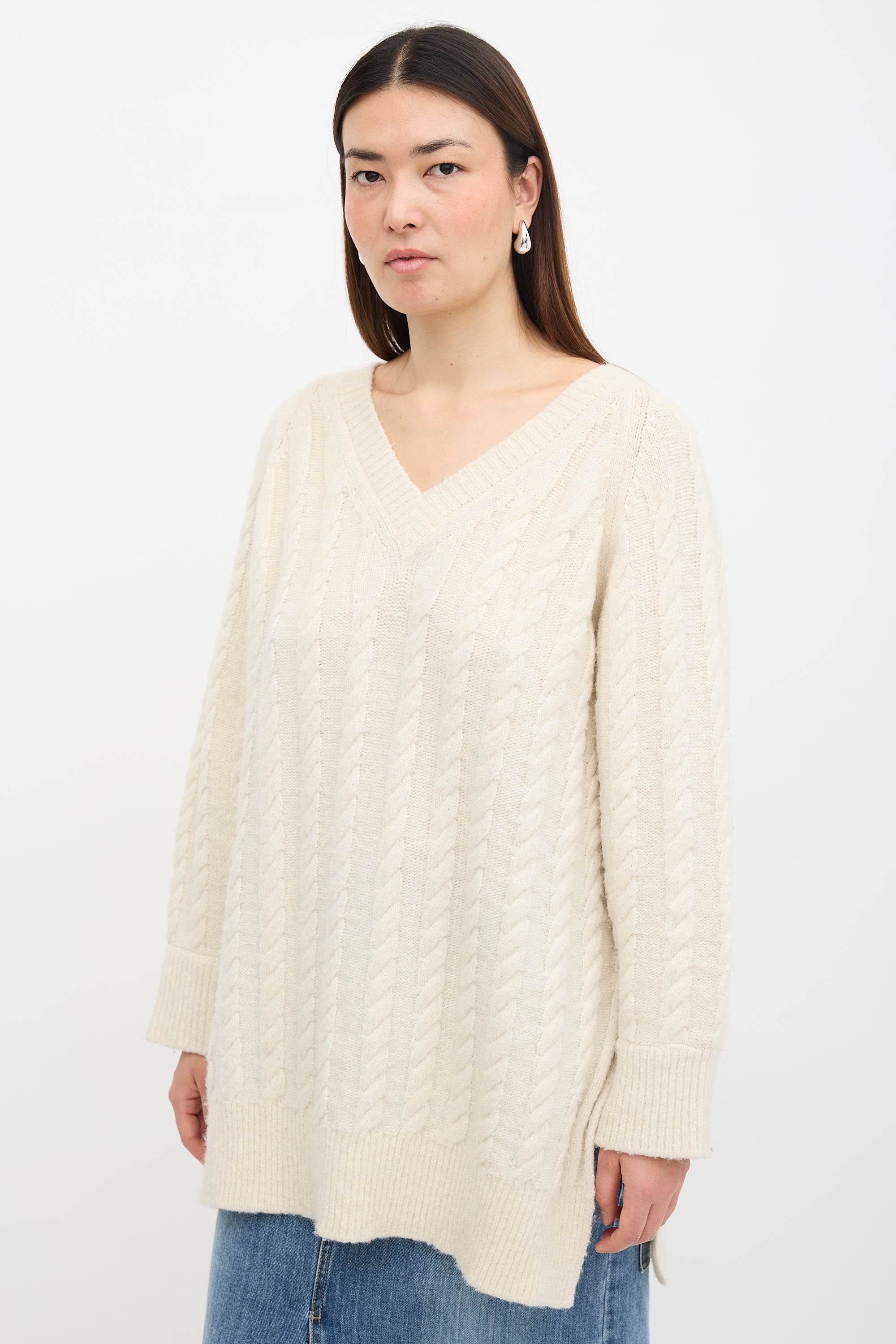 Pre-owned Simone Rocha cream cable knit oversized sweater featuring a V-neckline, side slits and a ribbed hem and cuffs.