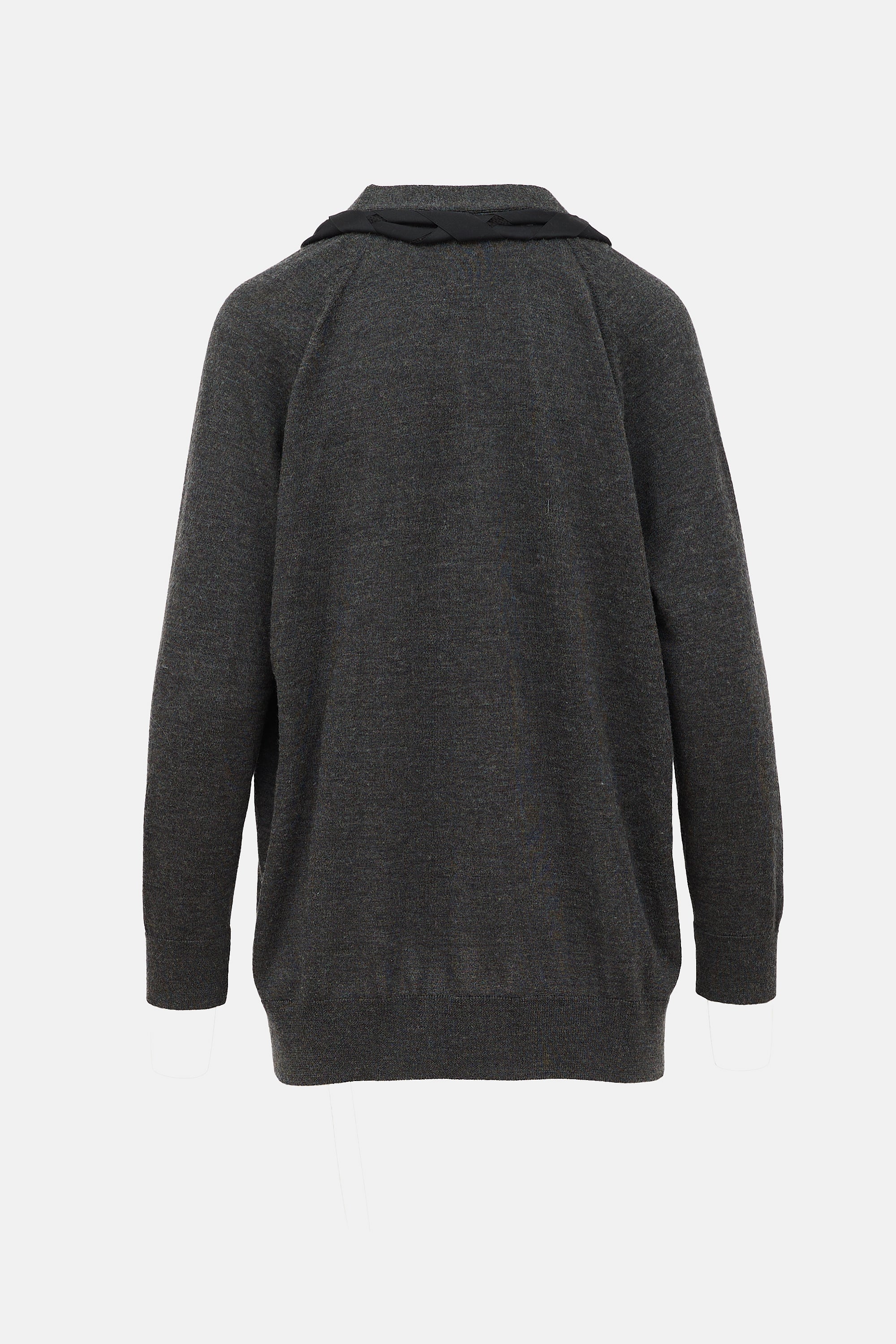 Pre-owned Simone Rocha dark grey wool blend cardigan featuring Y-neckline, button up front, braided ribbon trim, side vents, and ribbed placket, hem, and cuffs.