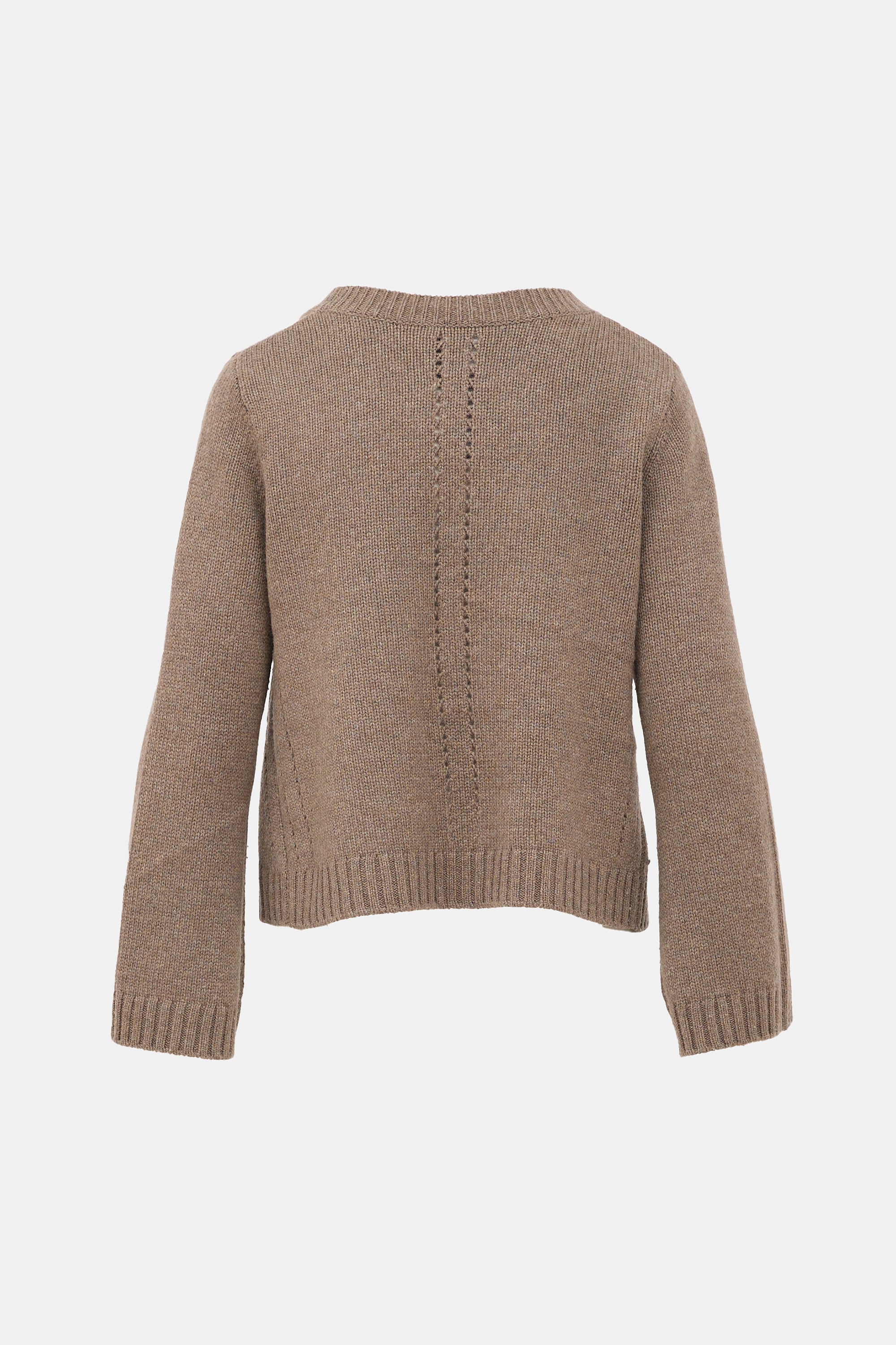 Pre-owned Smythe brown cashmere pointelle sweater featuring crew neckline, A-line design, flared sleeves, and ribbed collar, hem, and cuffs.