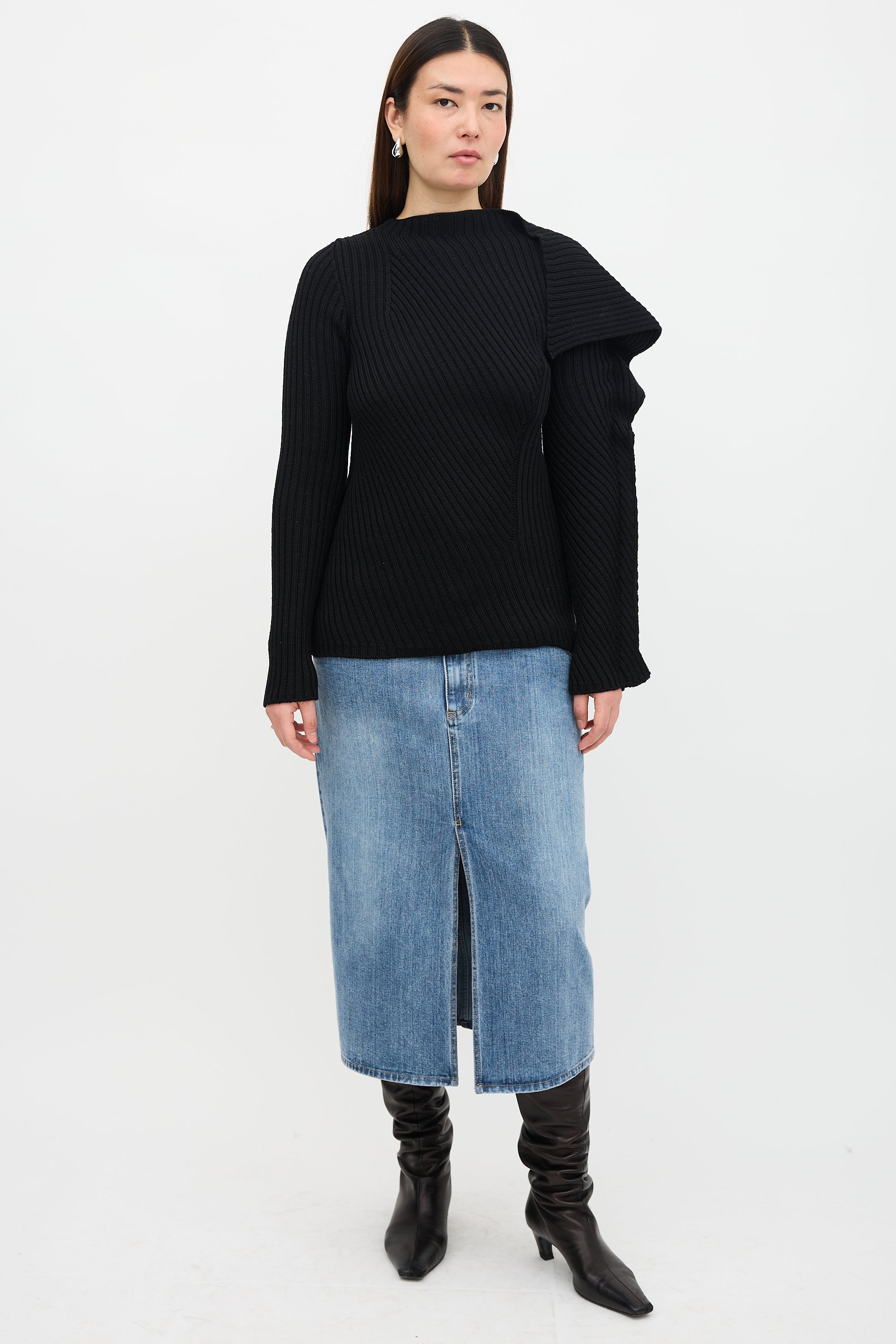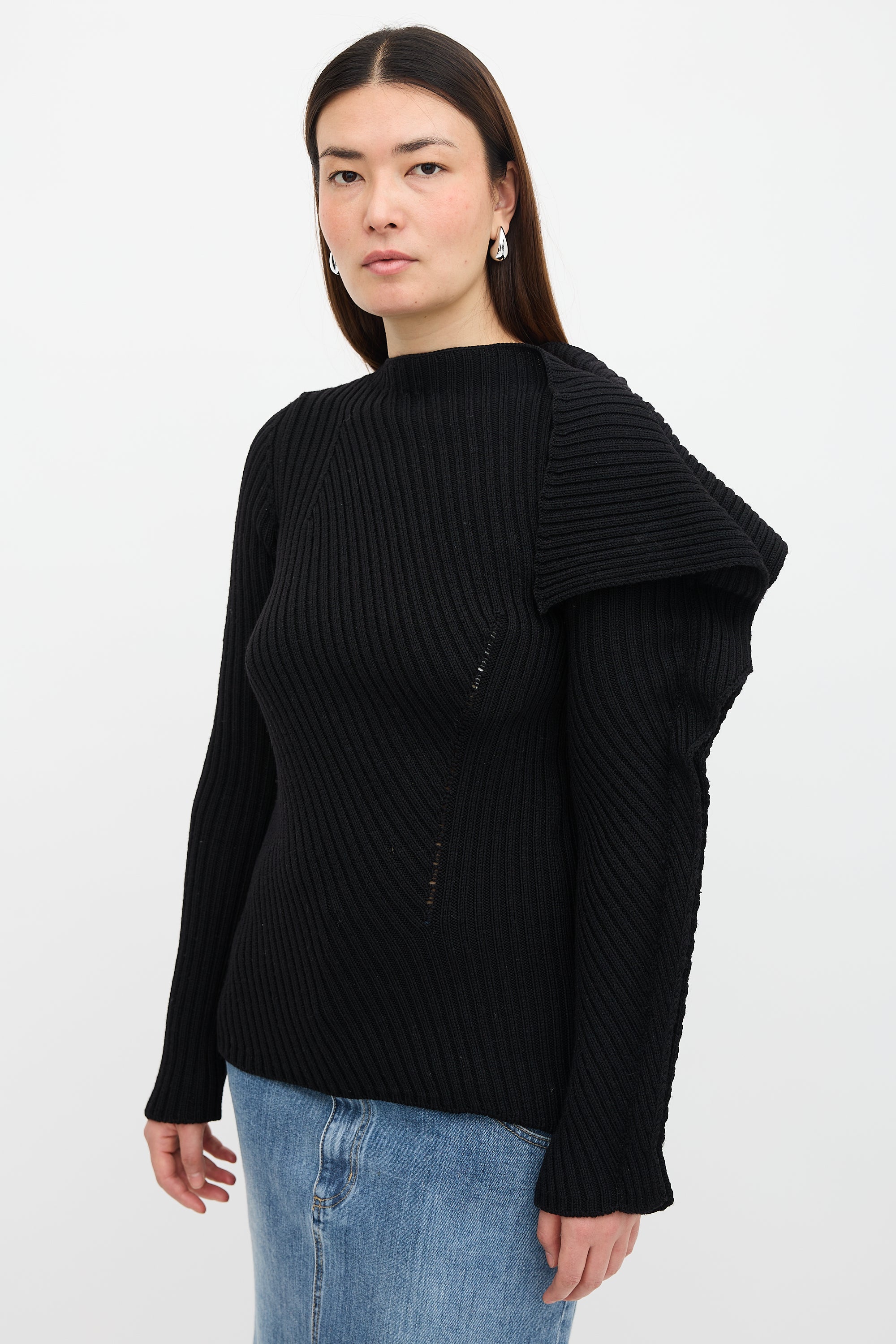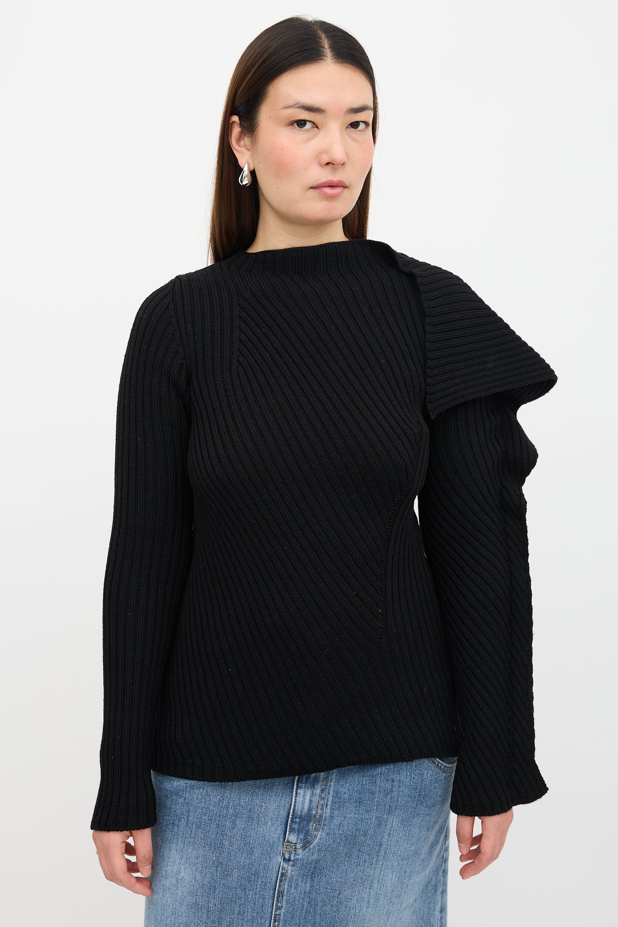 Pre-owned Sportmax black wool ribbed Pila sweater featuring a bateau neckline, ruffled left sleeve, and open knit detail at midsection.