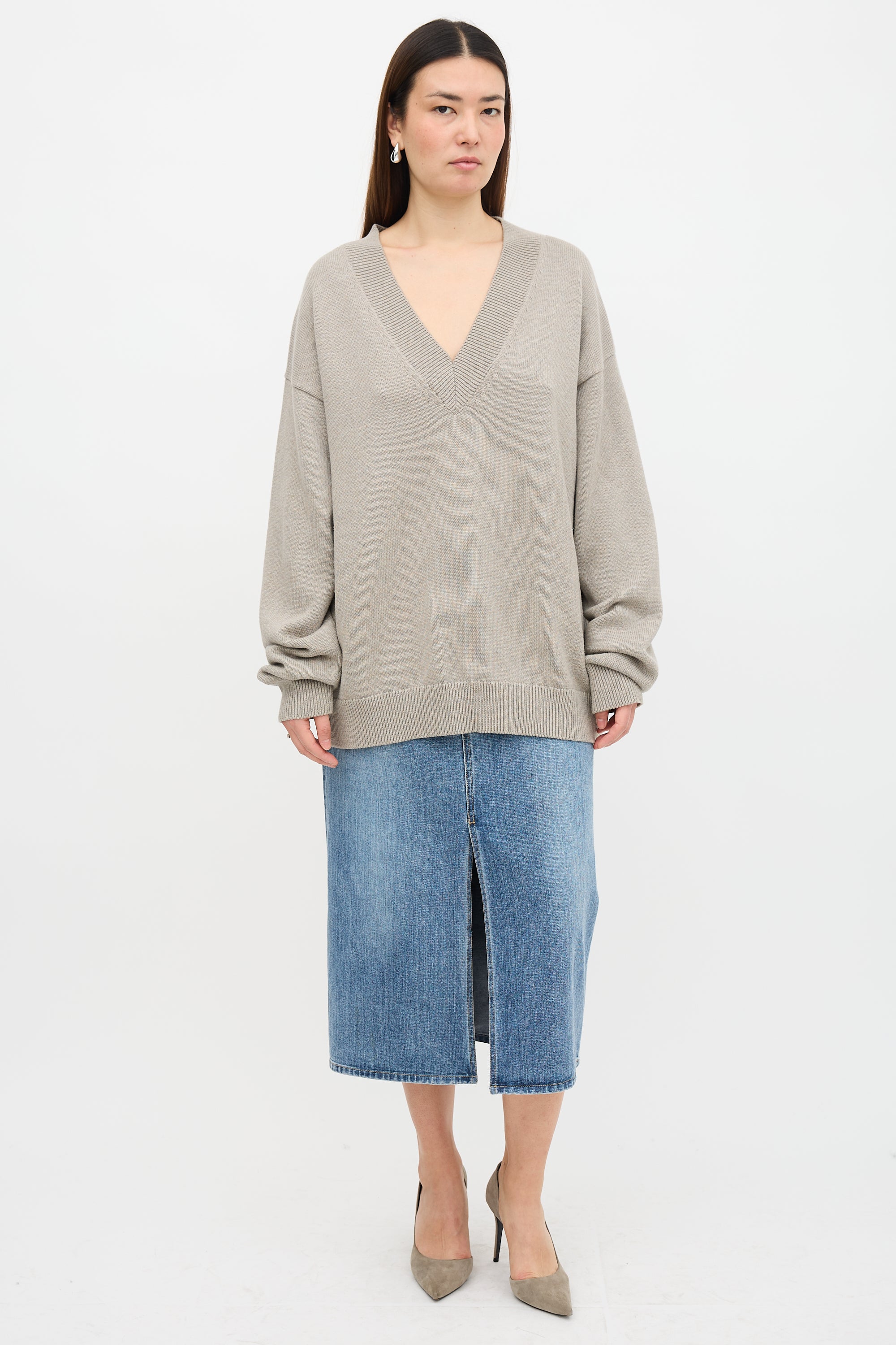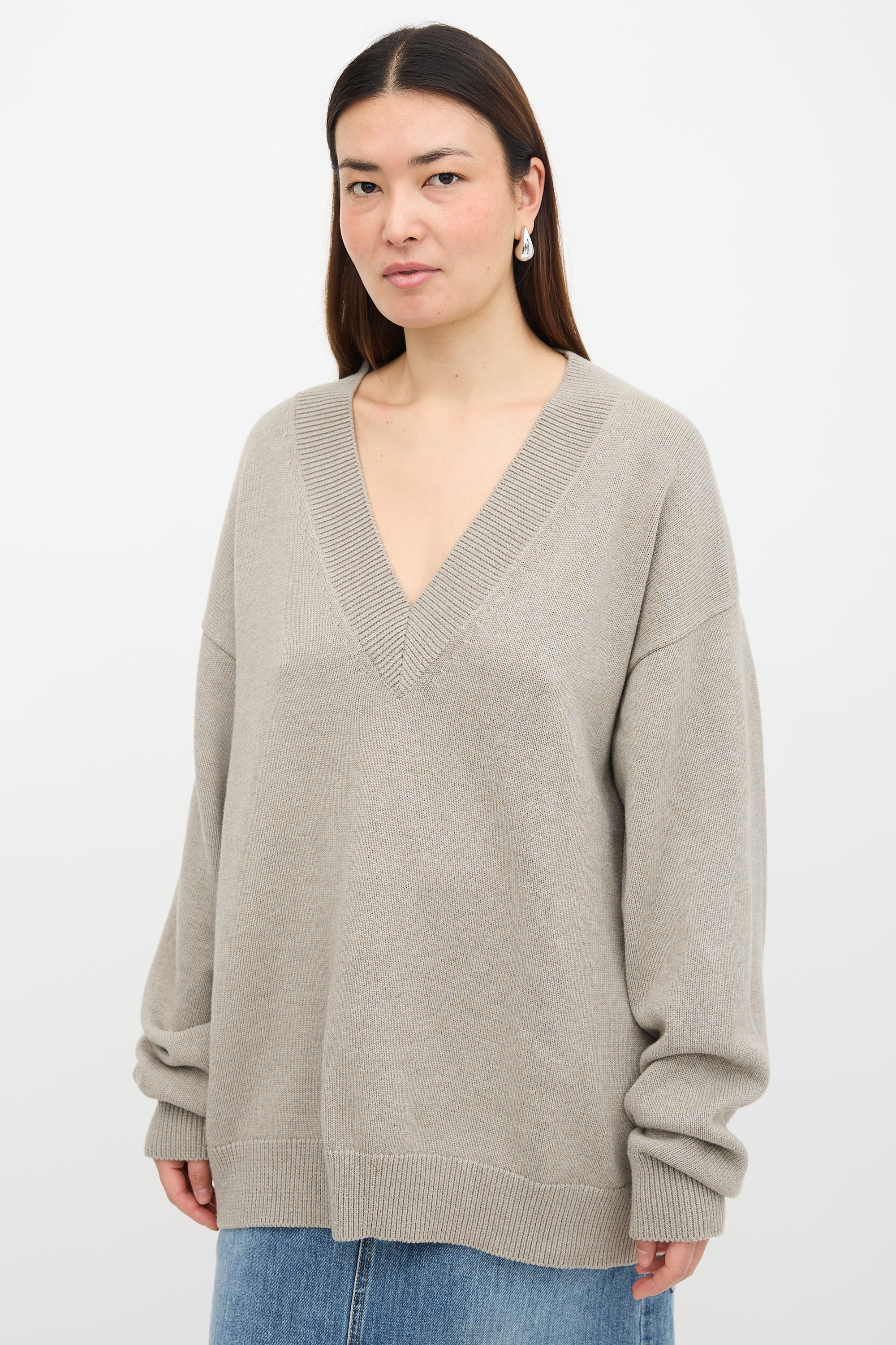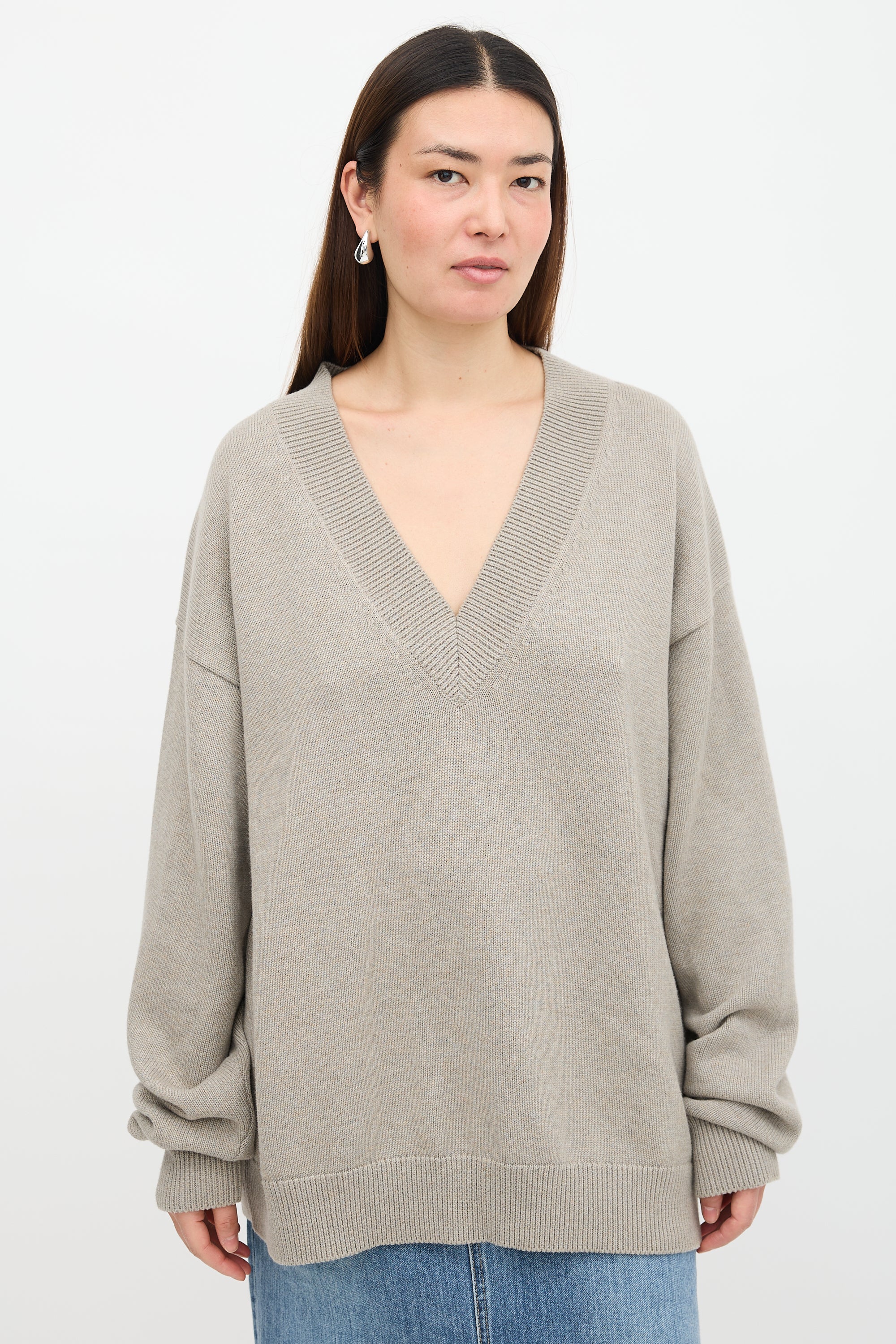 Pre-owned Studio Nicholson beige merino wool blend Sola sweater featuring a ribbed V-neckline, dropped shoulder, and a ribbed hem and cuffs.