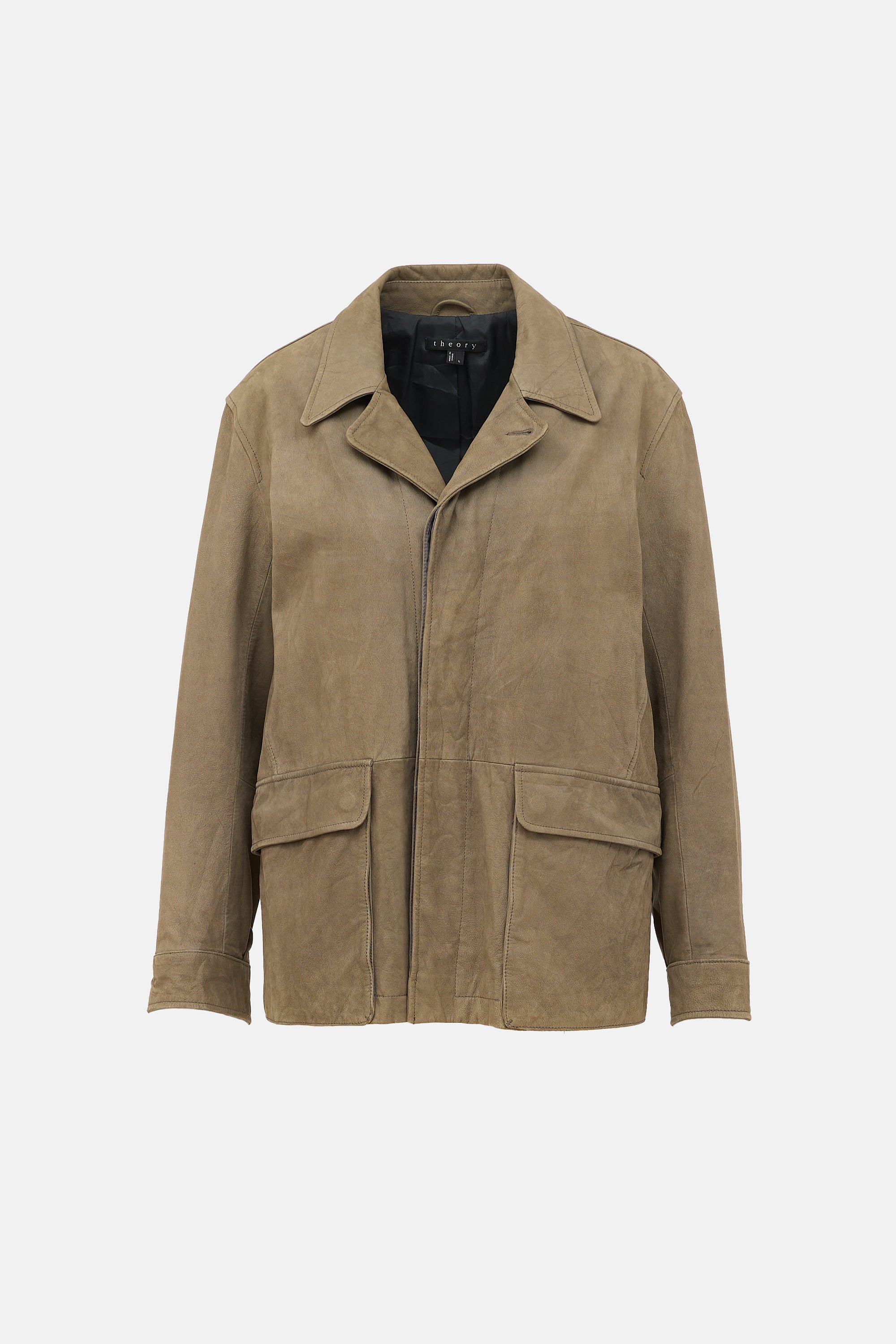 Pre-owned Theory brown leather jacket featuring notched collar, concealed button up front, two front flap pockets, interior drawstring waist, and buttoned cuffs. Lined.