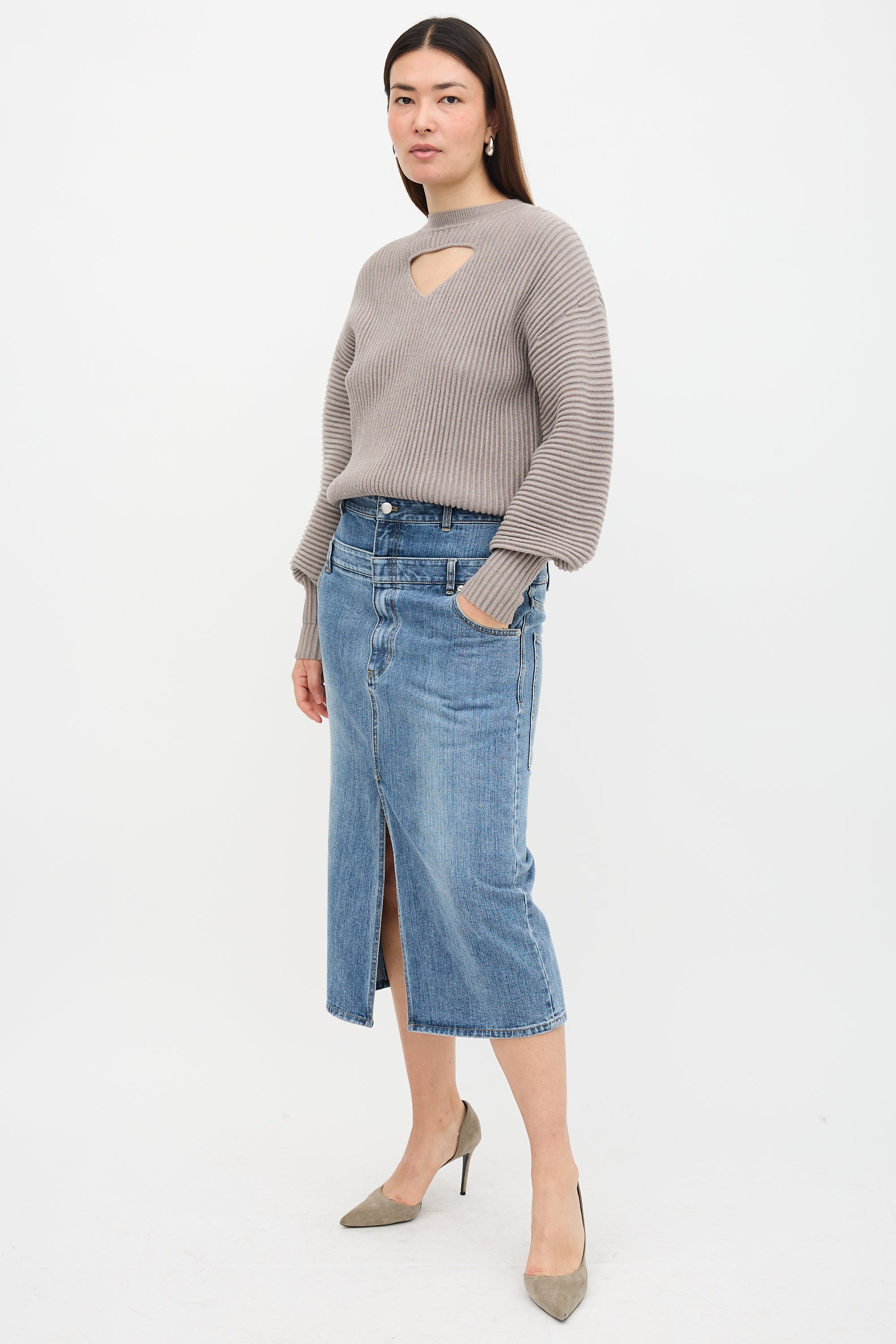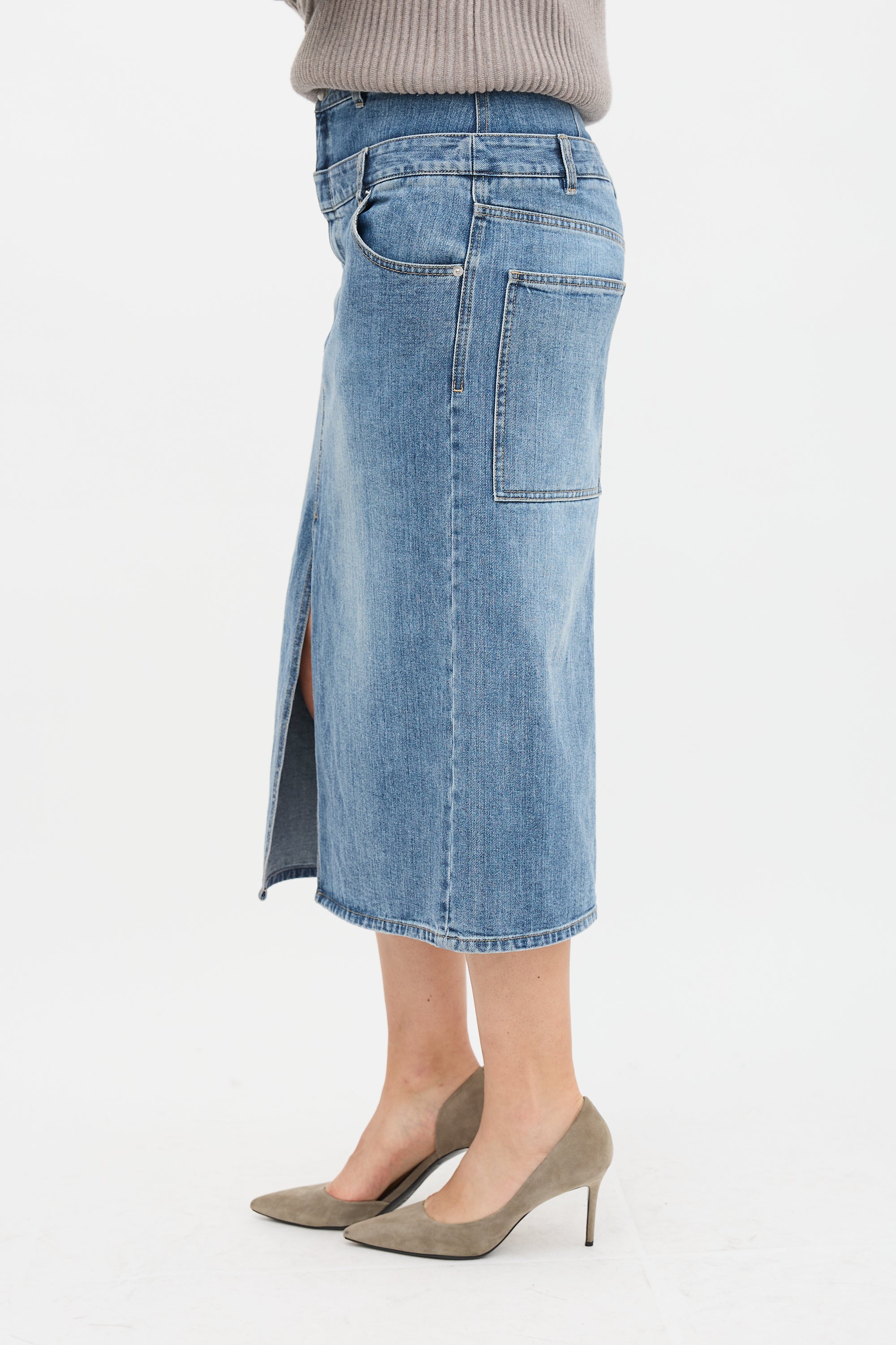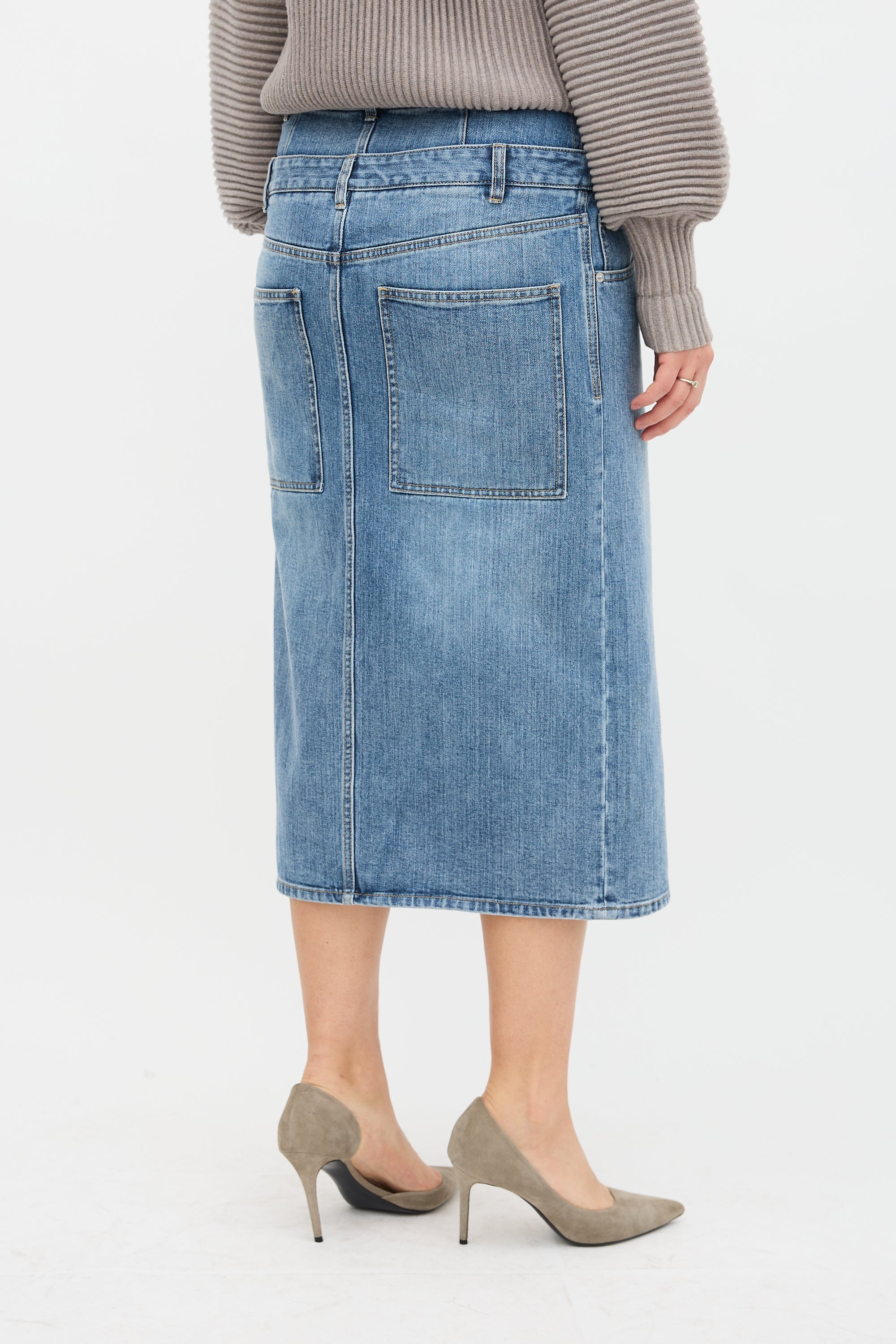 Pre-owned Tibi medium wash Double Waisted denim skirt featuring a zip fly, belt loops, five pocket styling, and front centre vent.