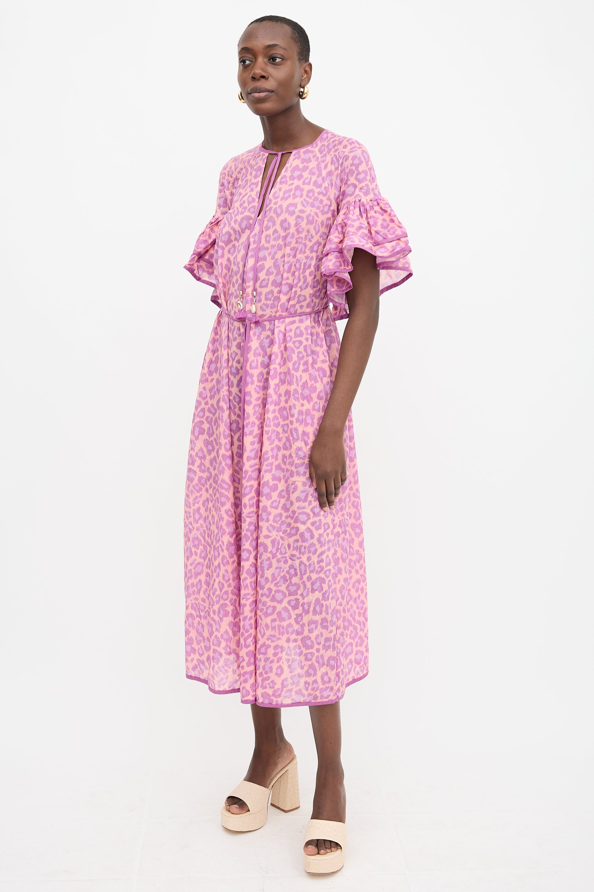 Pre-owned Zimmermann pink and purple midi dress featuring leopard print, split neckline with tie detail and button closure, in seam pockets, ruffle tier sleeves, waist tie, and shell and tassel embellishment.