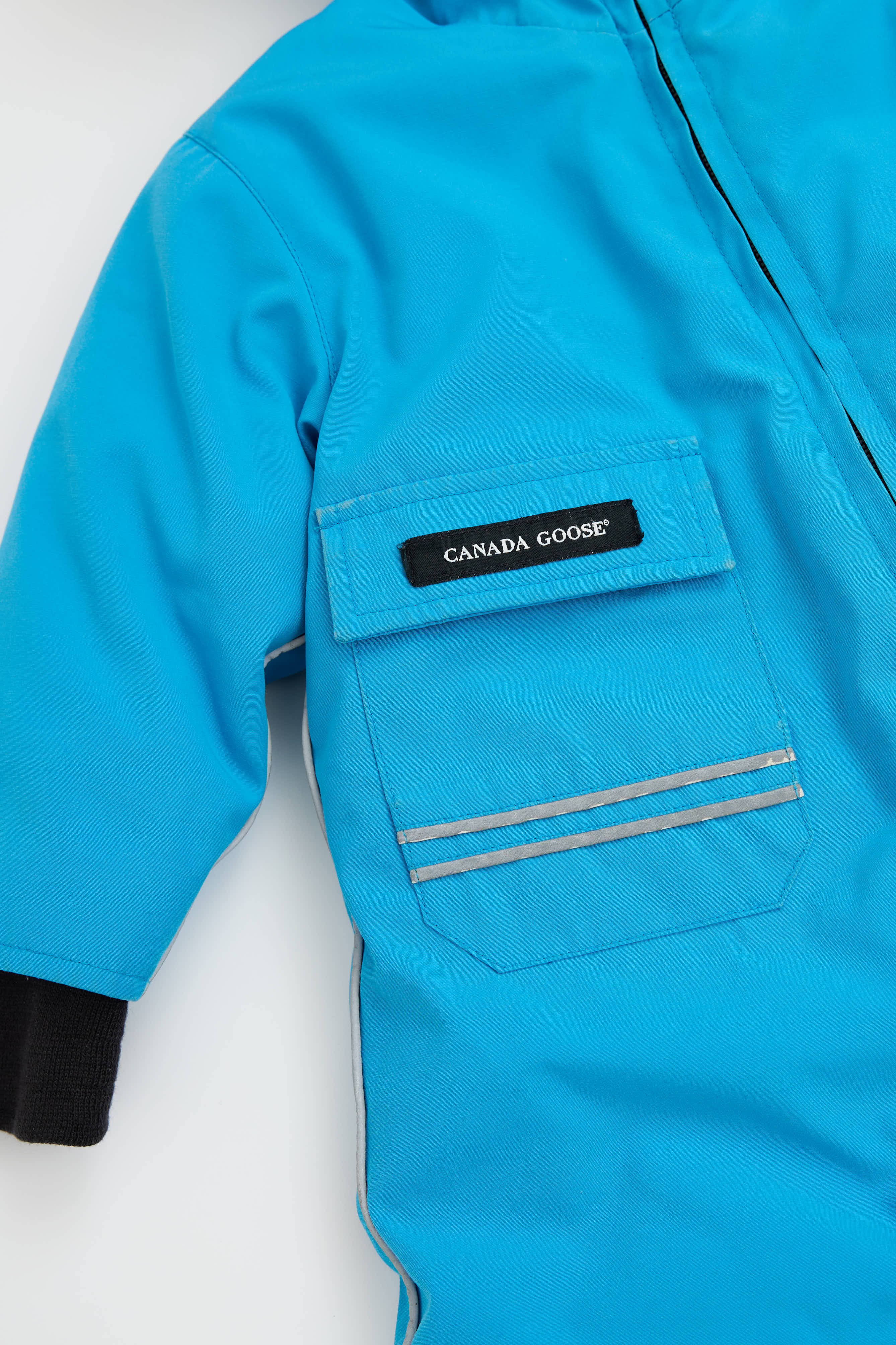 Pre-owned Canada Goose blue down one piece snowsuit featuring an attached hood with removable fur trim, long sleeves with ribbed cuffs, stirrup strap at hem, one flap pocket at front, and zip closure.