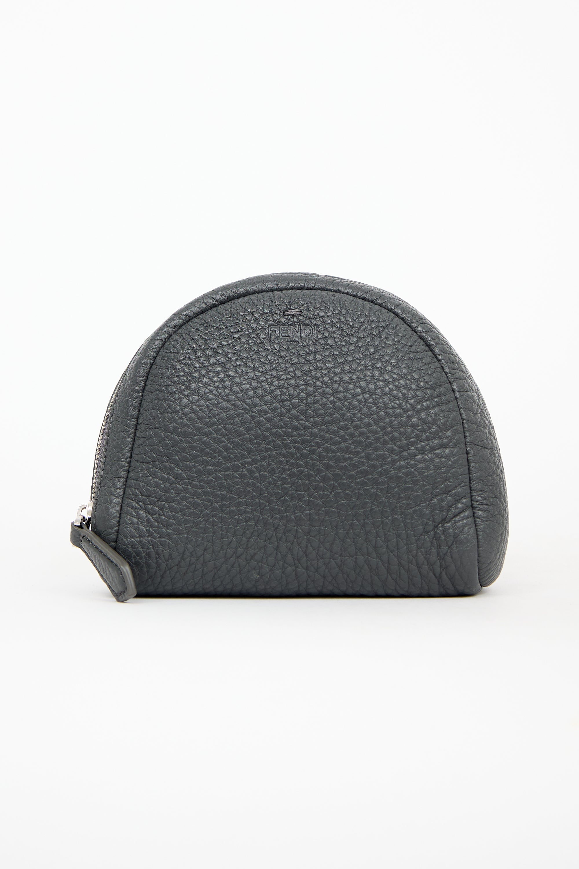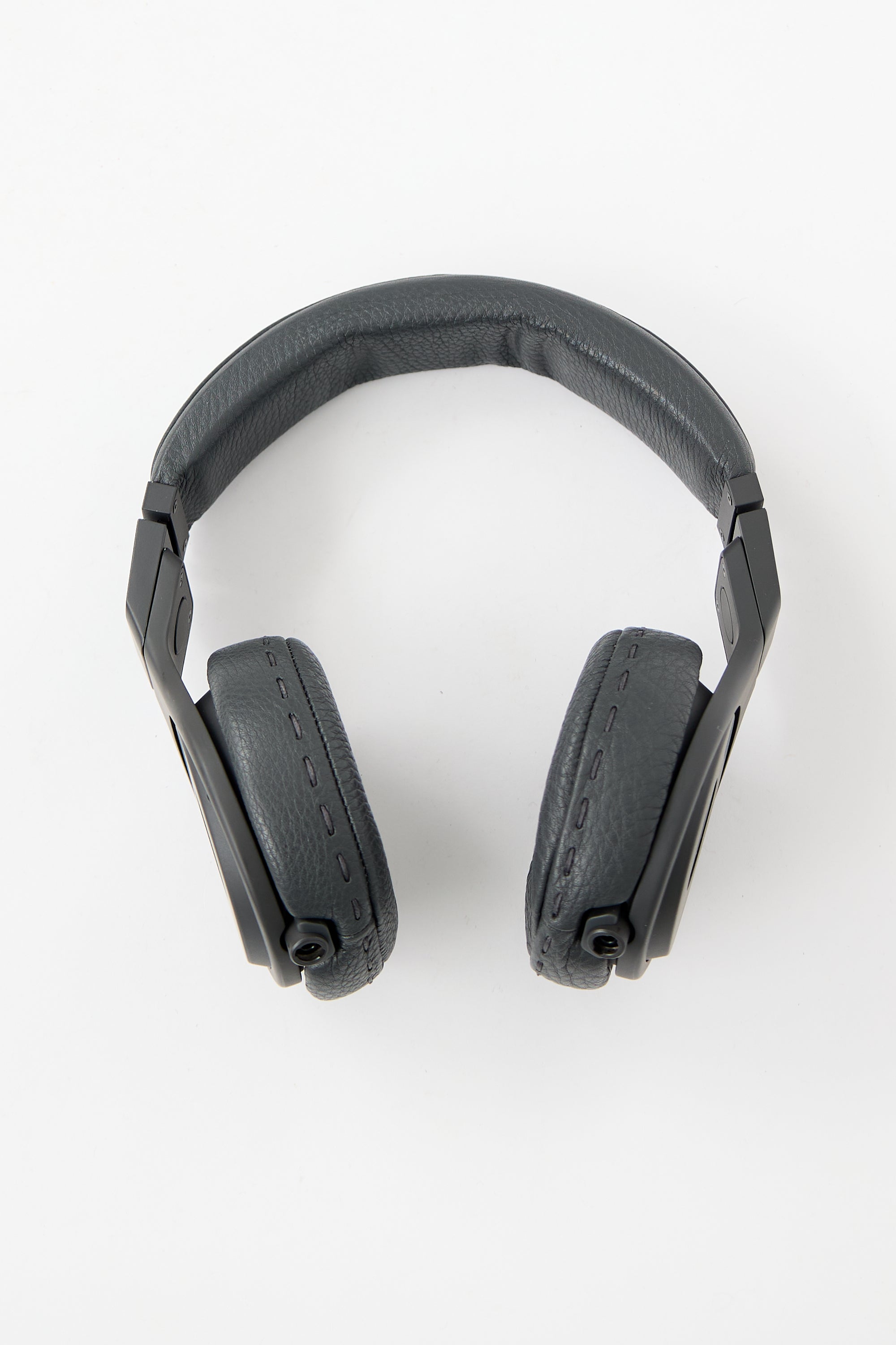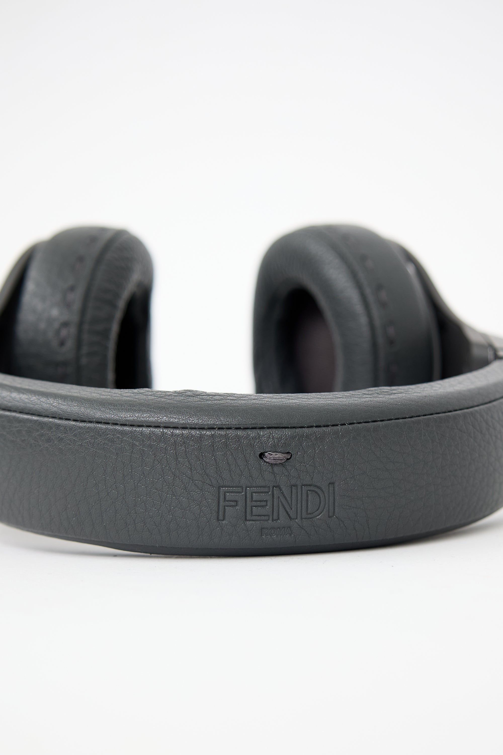 Pre-owned Fendi X Beats By Dr. Dre 2015 grey Selleria leather collapsible wire headphones featuring tonal stitching, padded band with stamped logo at top, swivel hinge with debossed logos, and red cable with audio volume control. Comes with original case and lightning to headphone jack adapter.