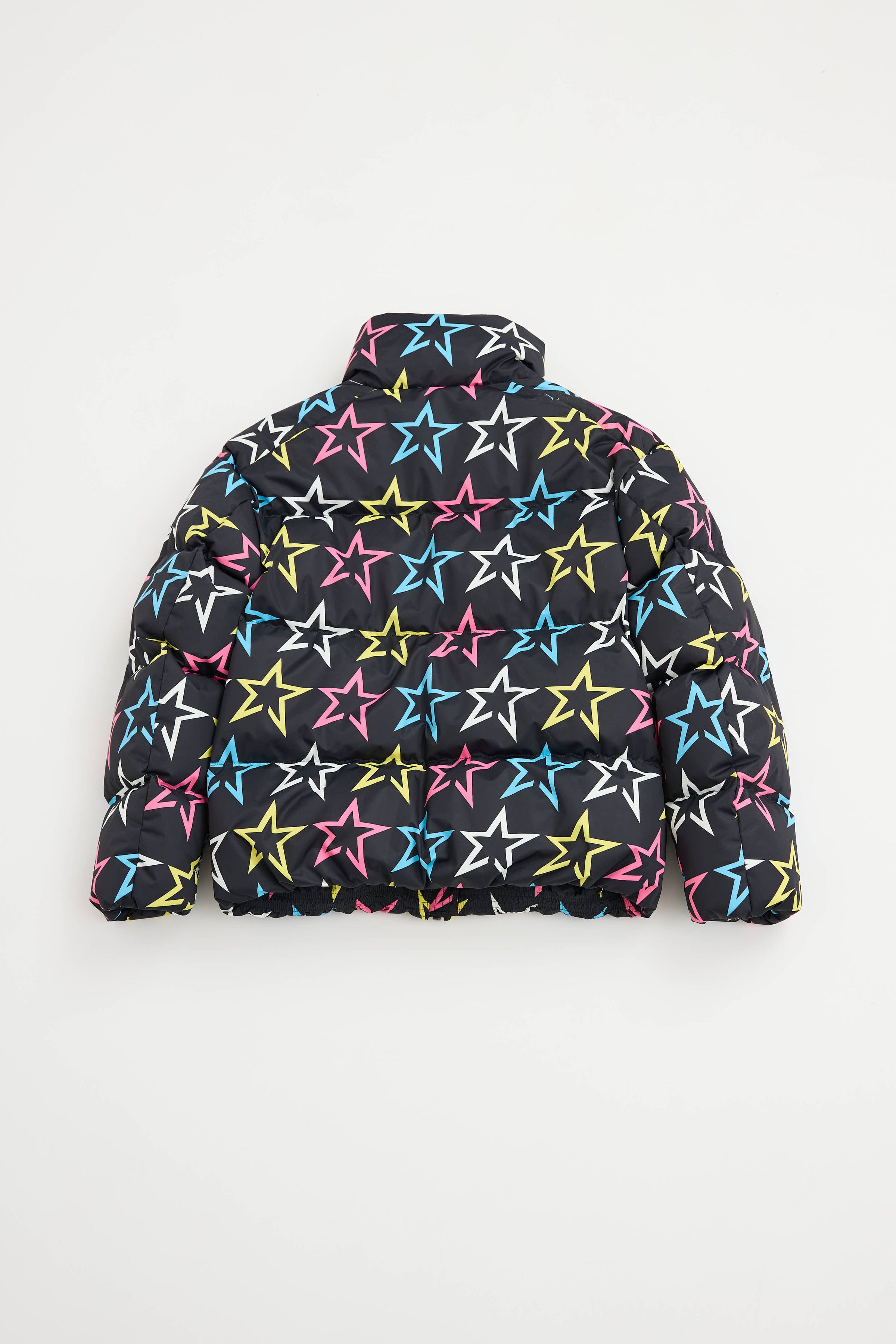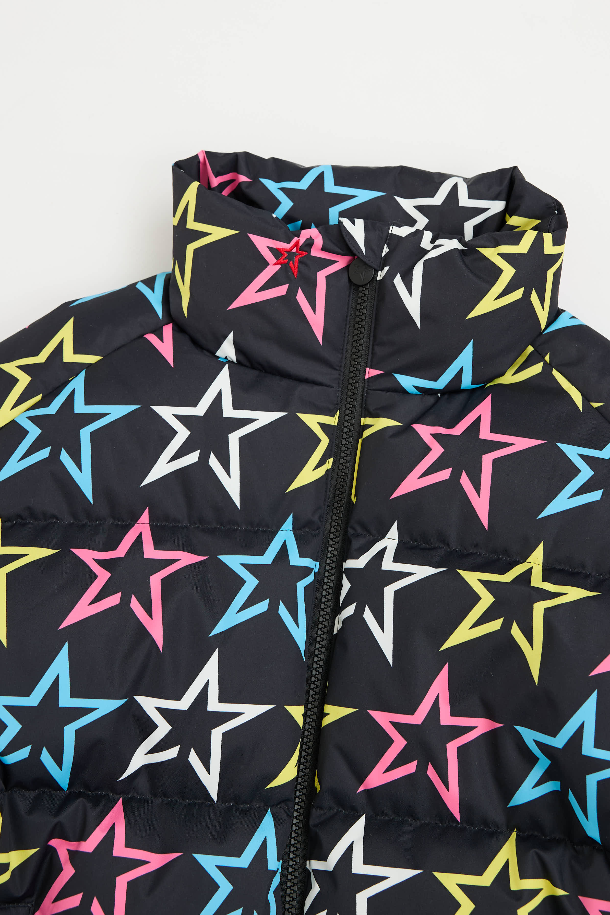 Pre-owned Perfect Moment black Nuuk puffer ski jacket featuring a mockneck collar, multicolour cluster star pattern, zip pockets at sides, interior snow skirt, and zip closure.