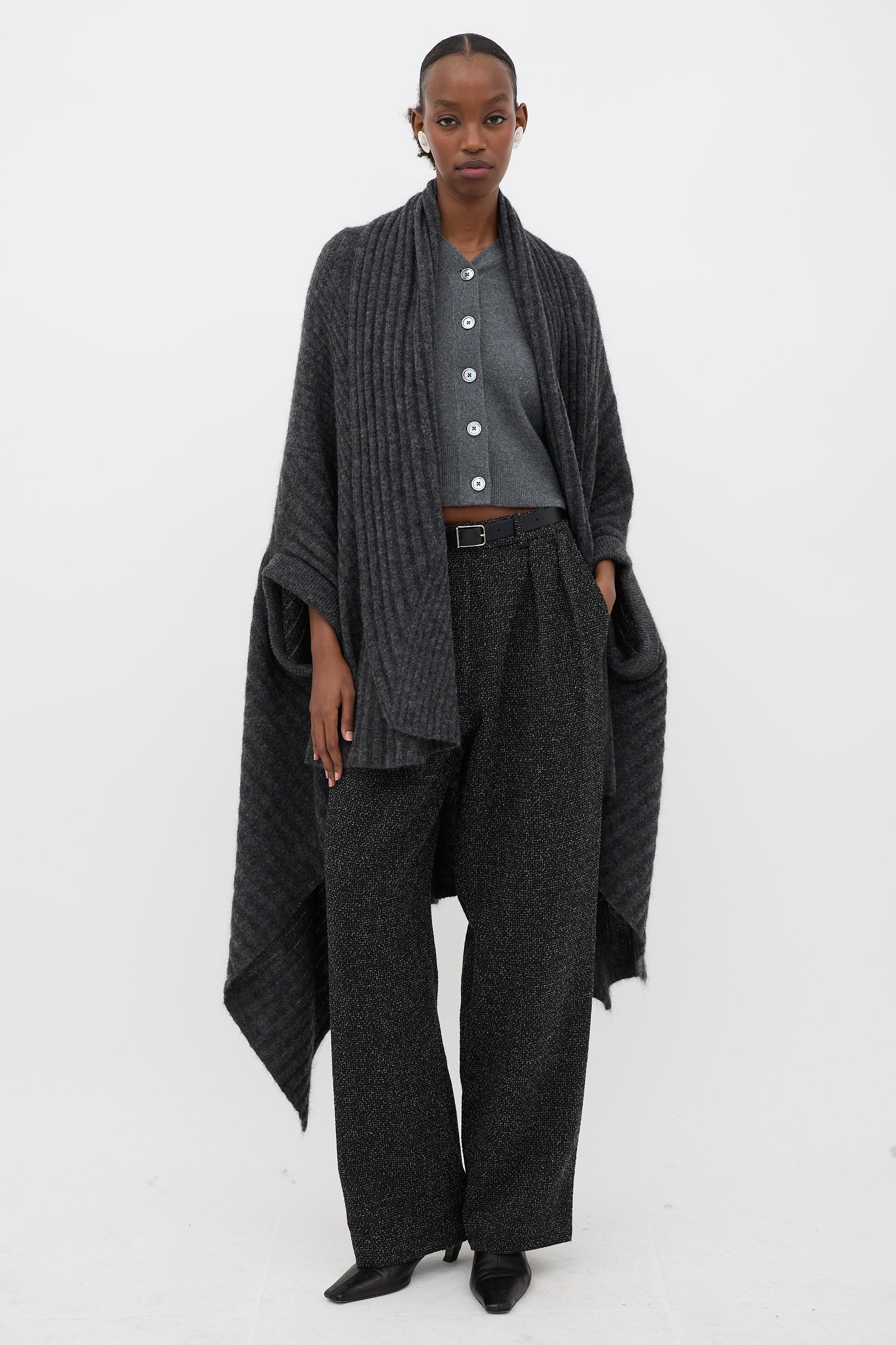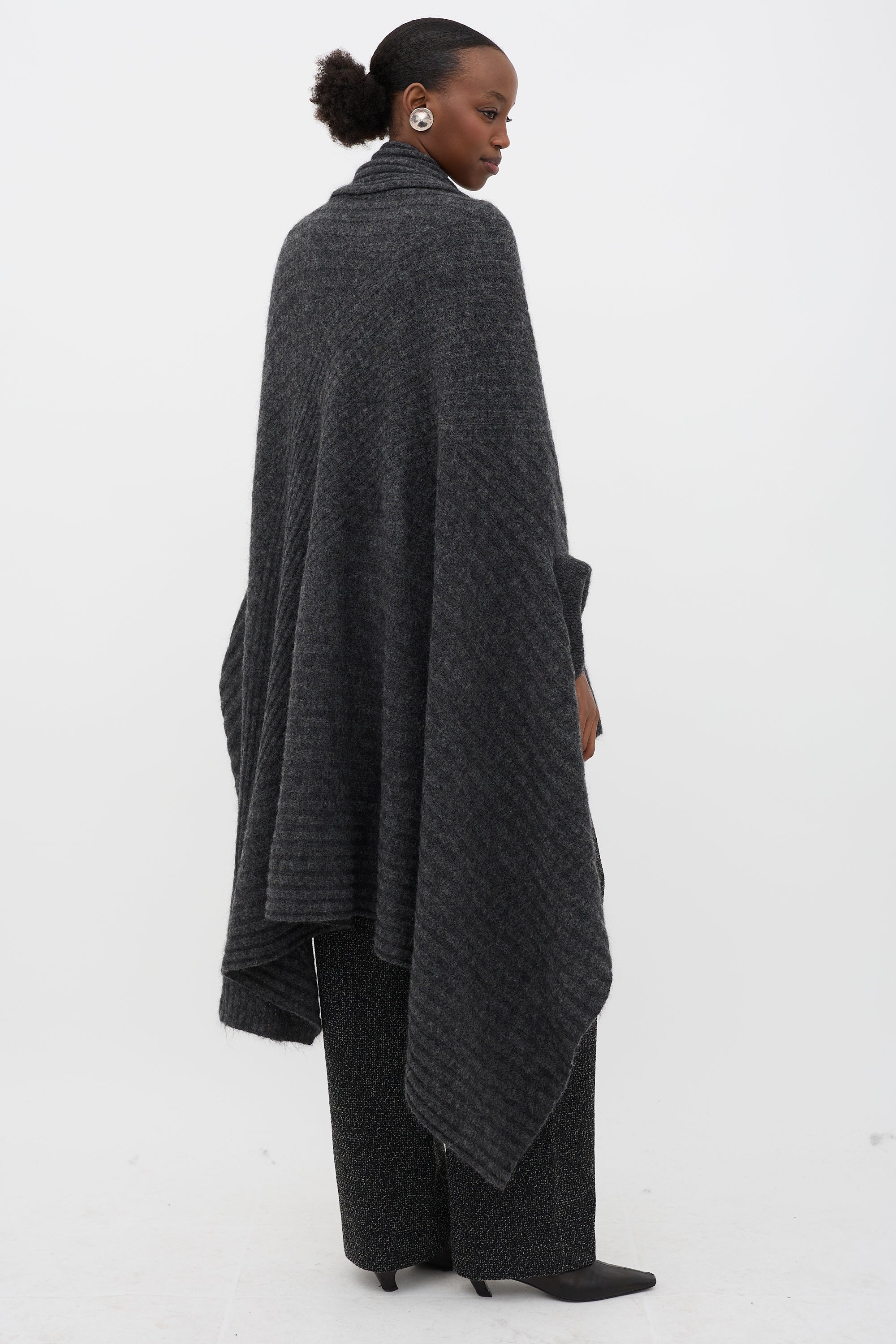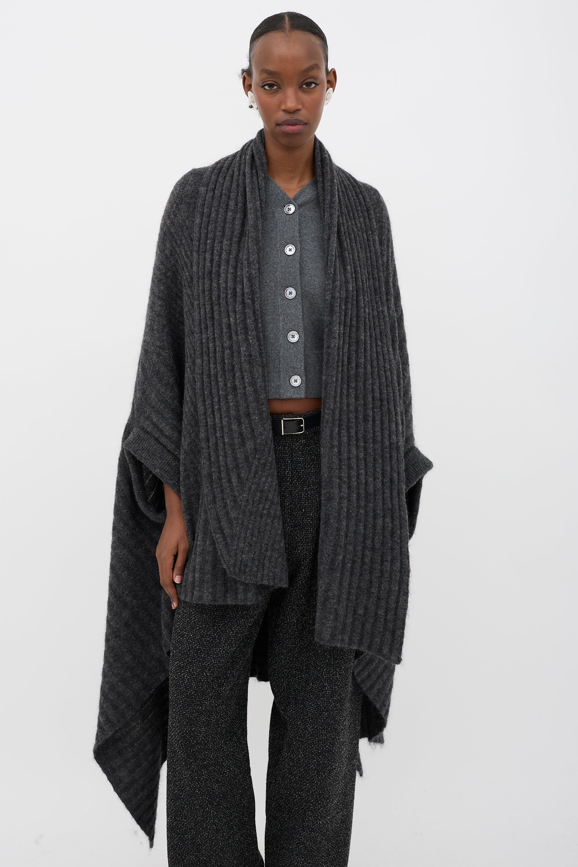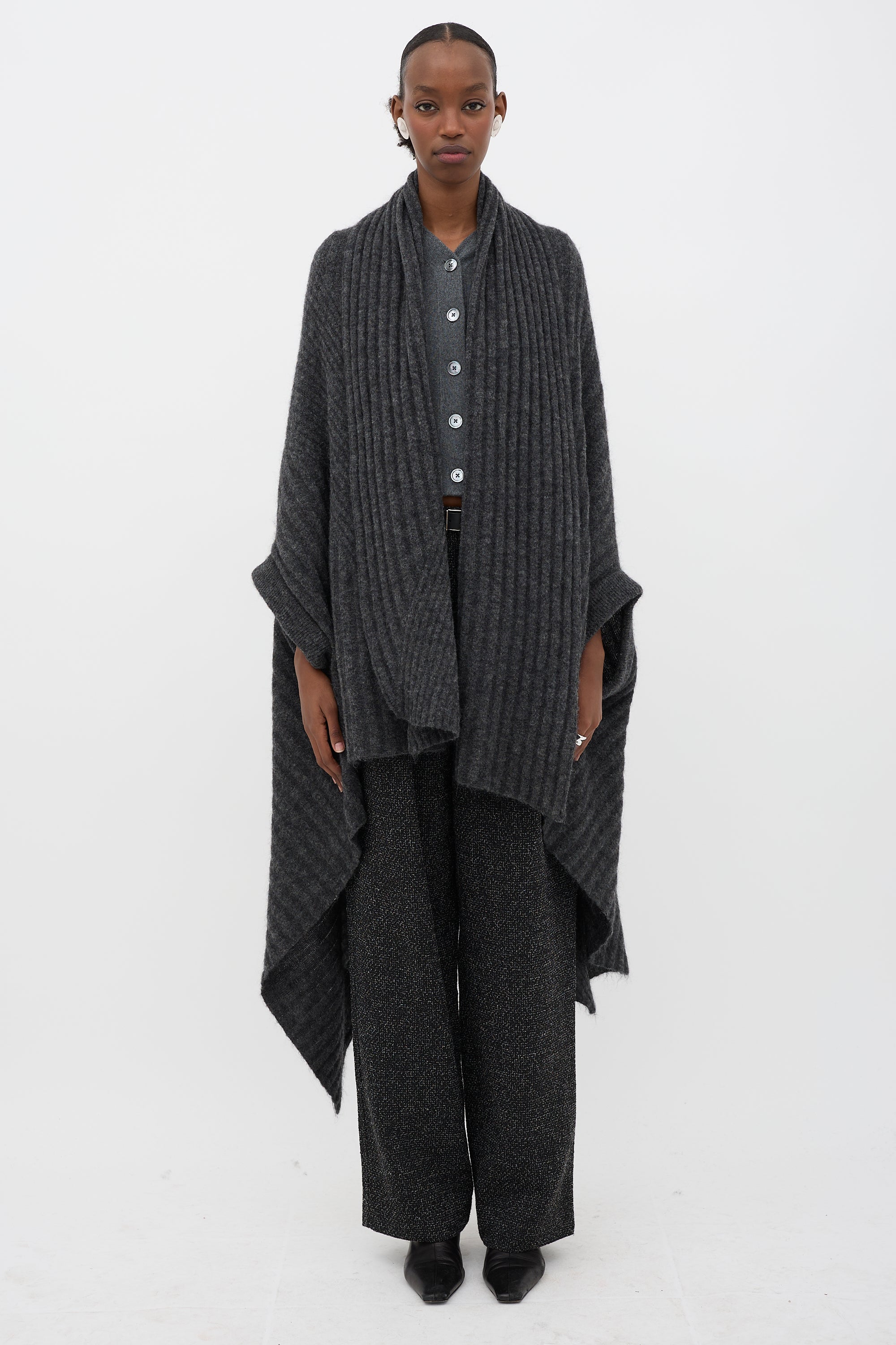 Pre-owned Acne Studios dark grey mohair blend Alan cardigan featuring open front, draped design, waterfall hem, and ribbed arm holes.