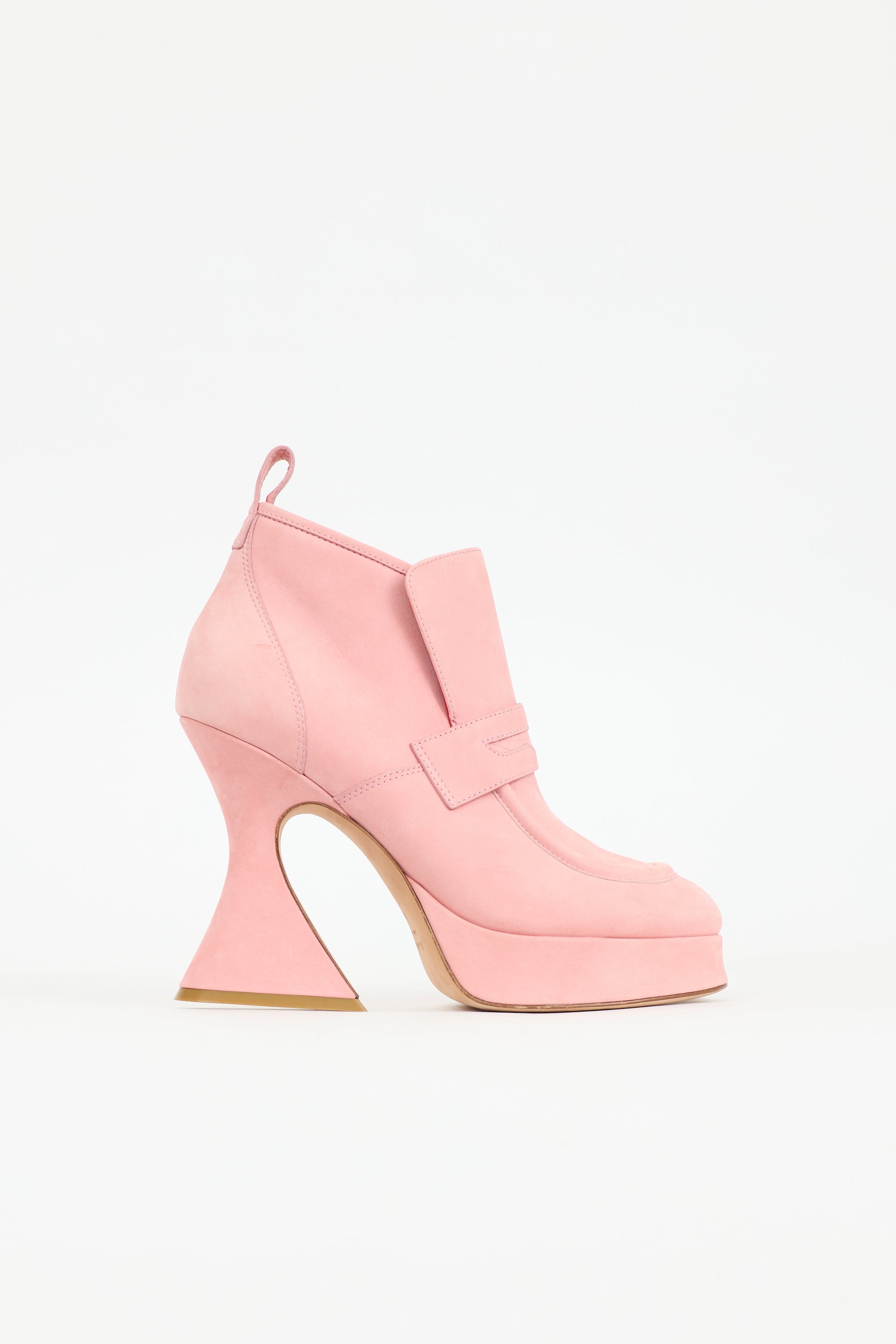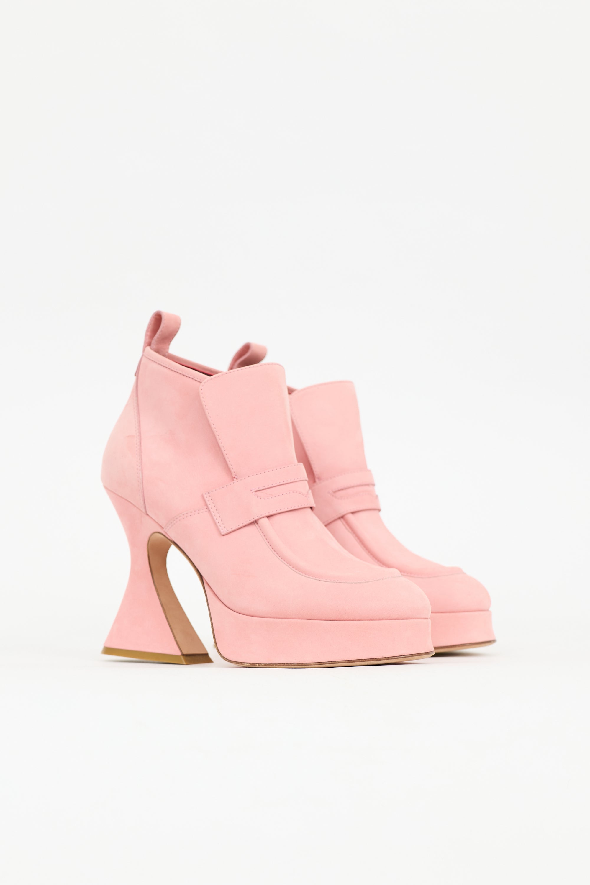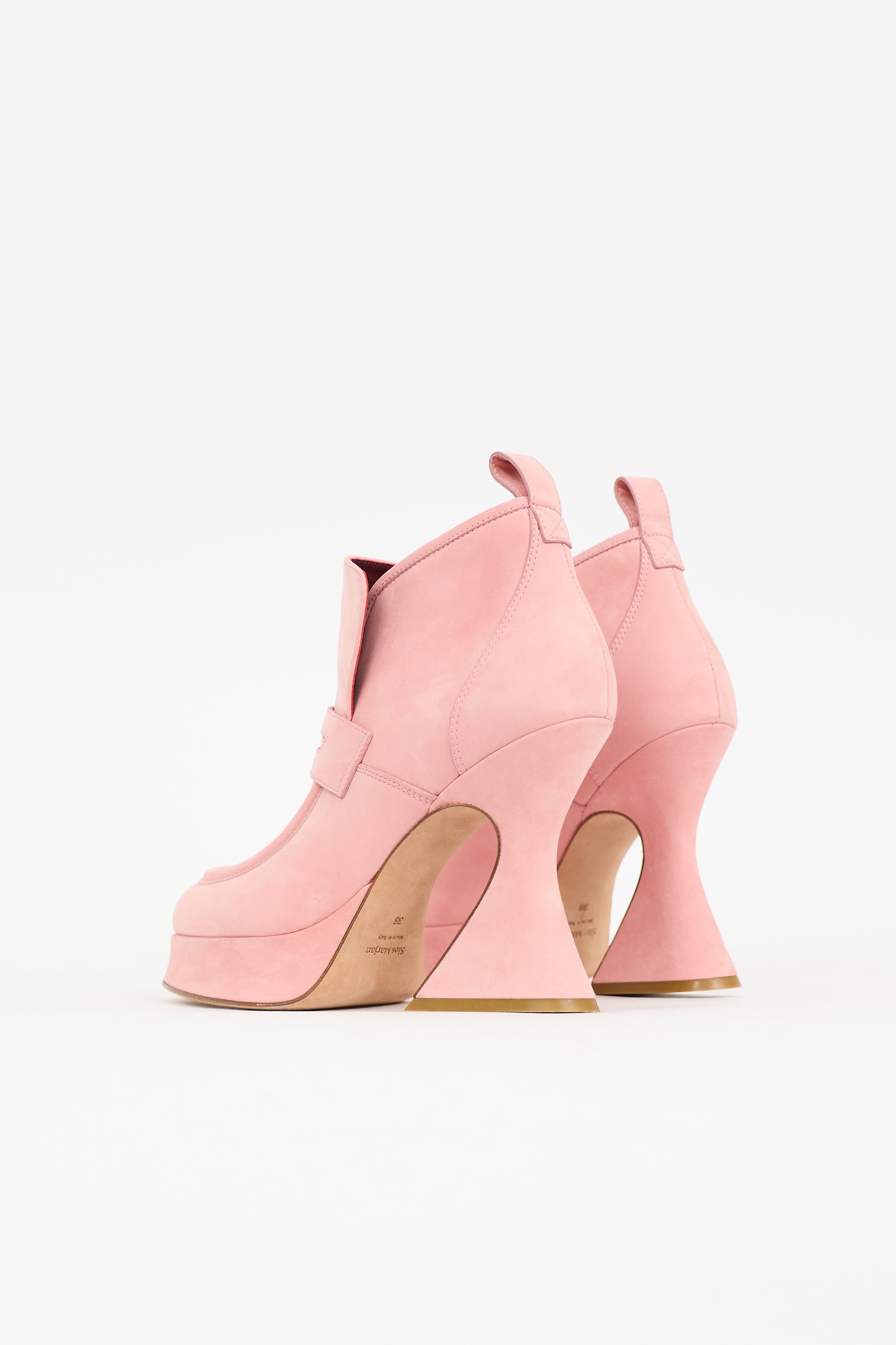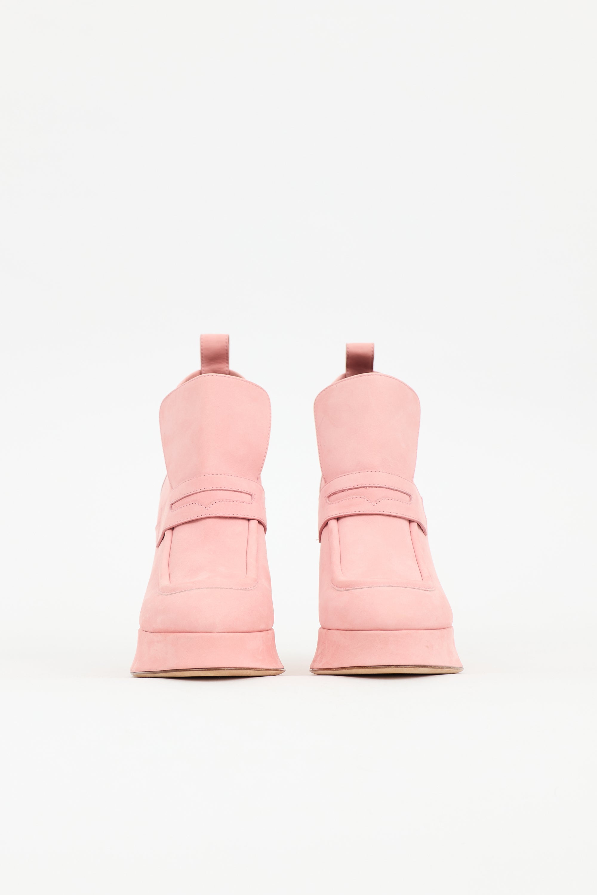 Pre-owned Sies Marjan pink suede loafer heels featuring rounded toe, pull tab at back, platform box, and curved heel.