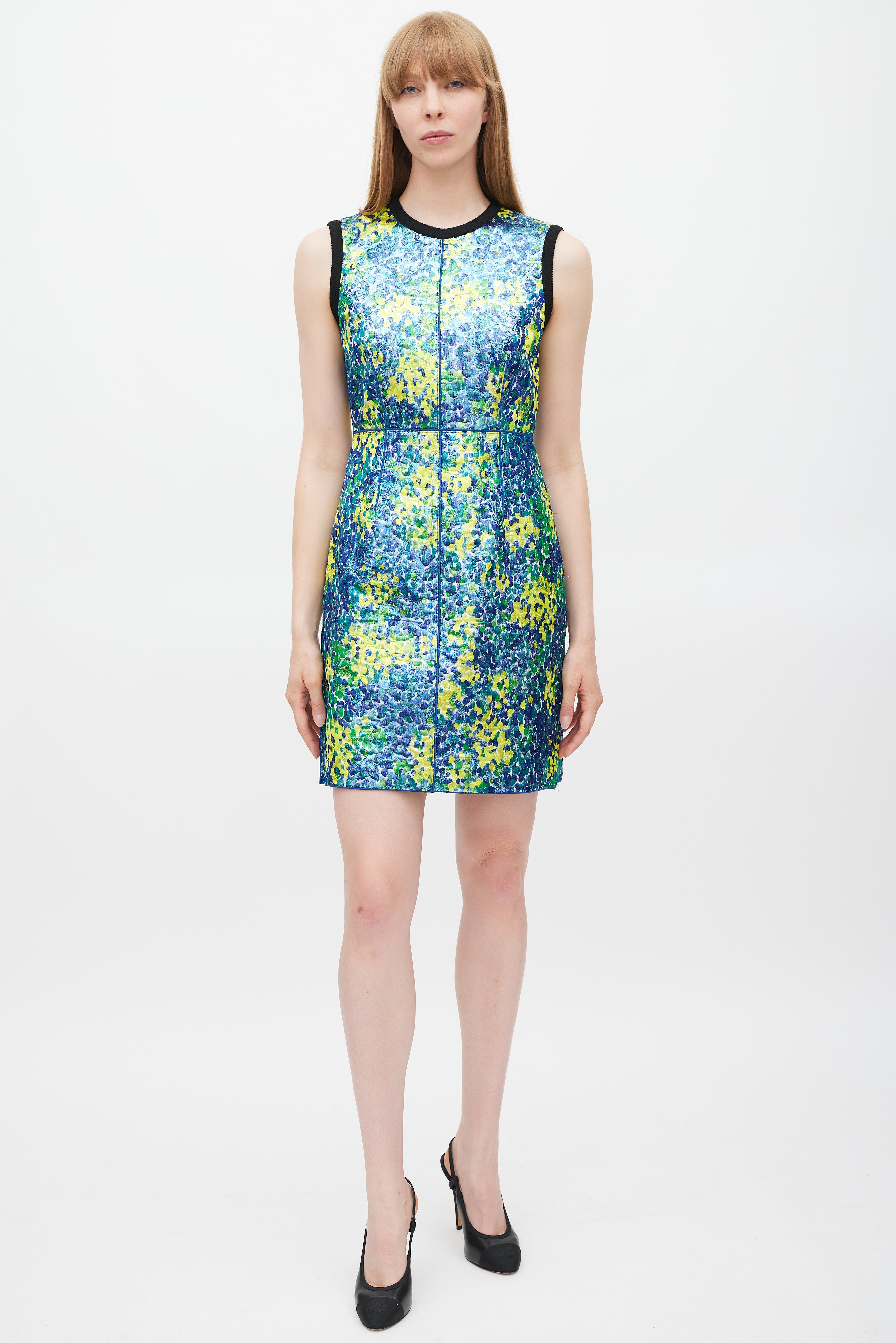 Pre-owned Marc Jacobs blue dress featuring a multicolour abstract metallic jacquard pattern throughout, round neckline, sleeveless styling, and zip at back with hook and eye closure. Lined.