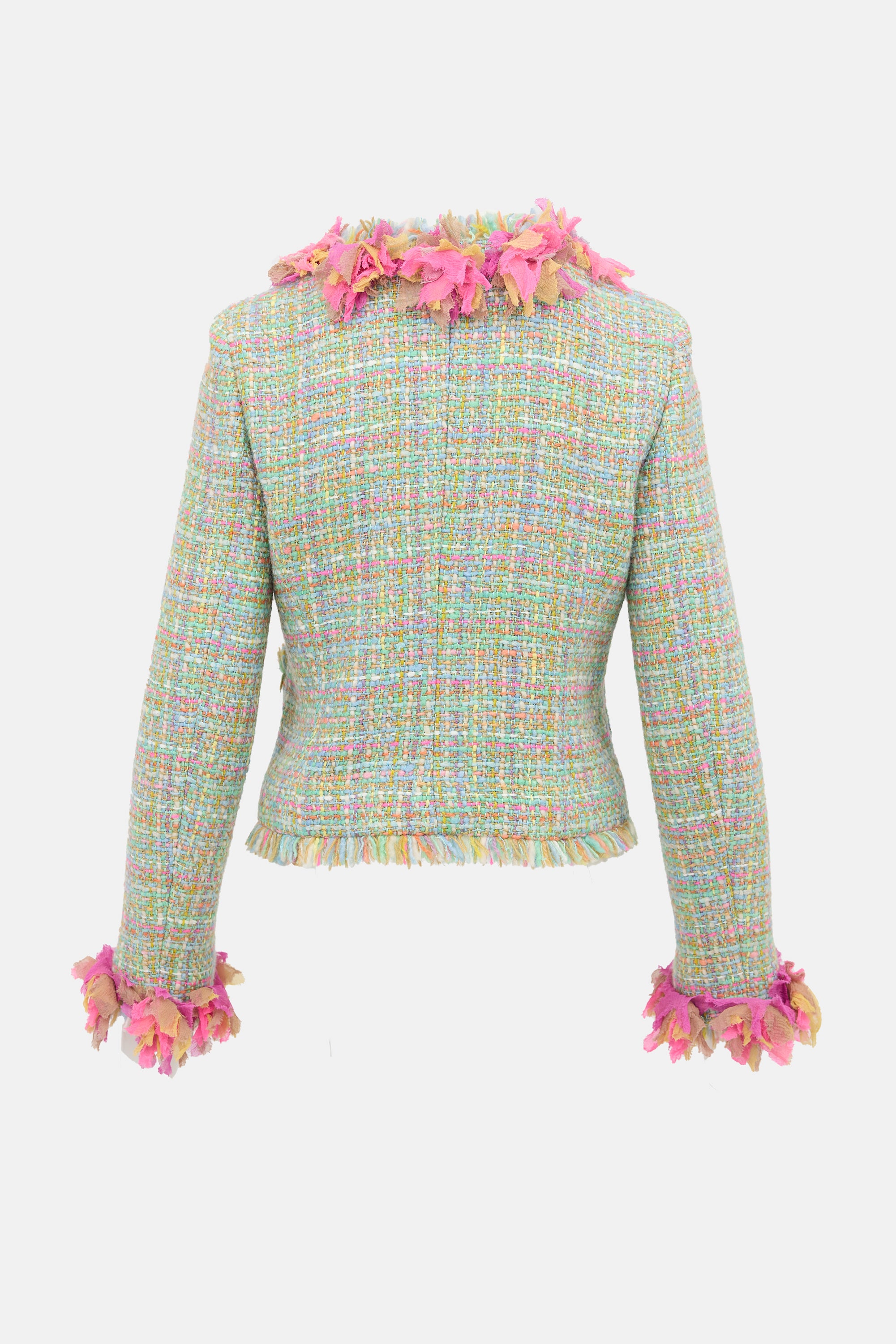 Pre-owned Chanel Fall/Winter 2001 multicolour wool blend tweed jacket featuring multicolour raw trimmed flower appliques at collar and cuffs, padded shoulder, snap button front, patch pockets, and fringe trim. Lined.
