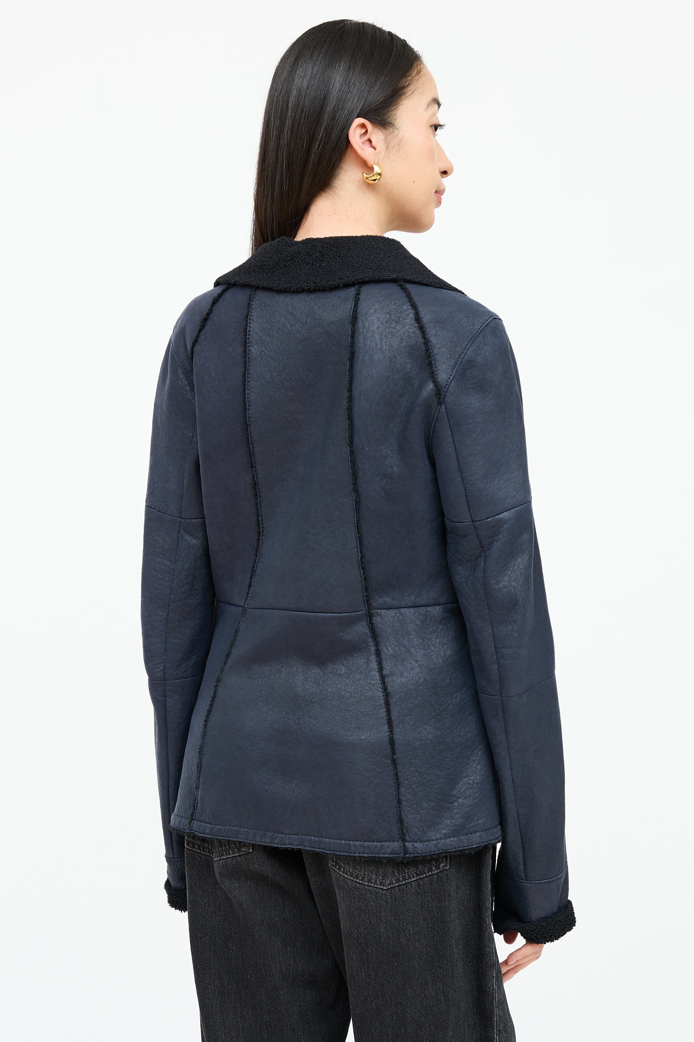 Pre-owned Christ navy shearling coat featuring button up closure, lapel collar and two slip pockets at waist.