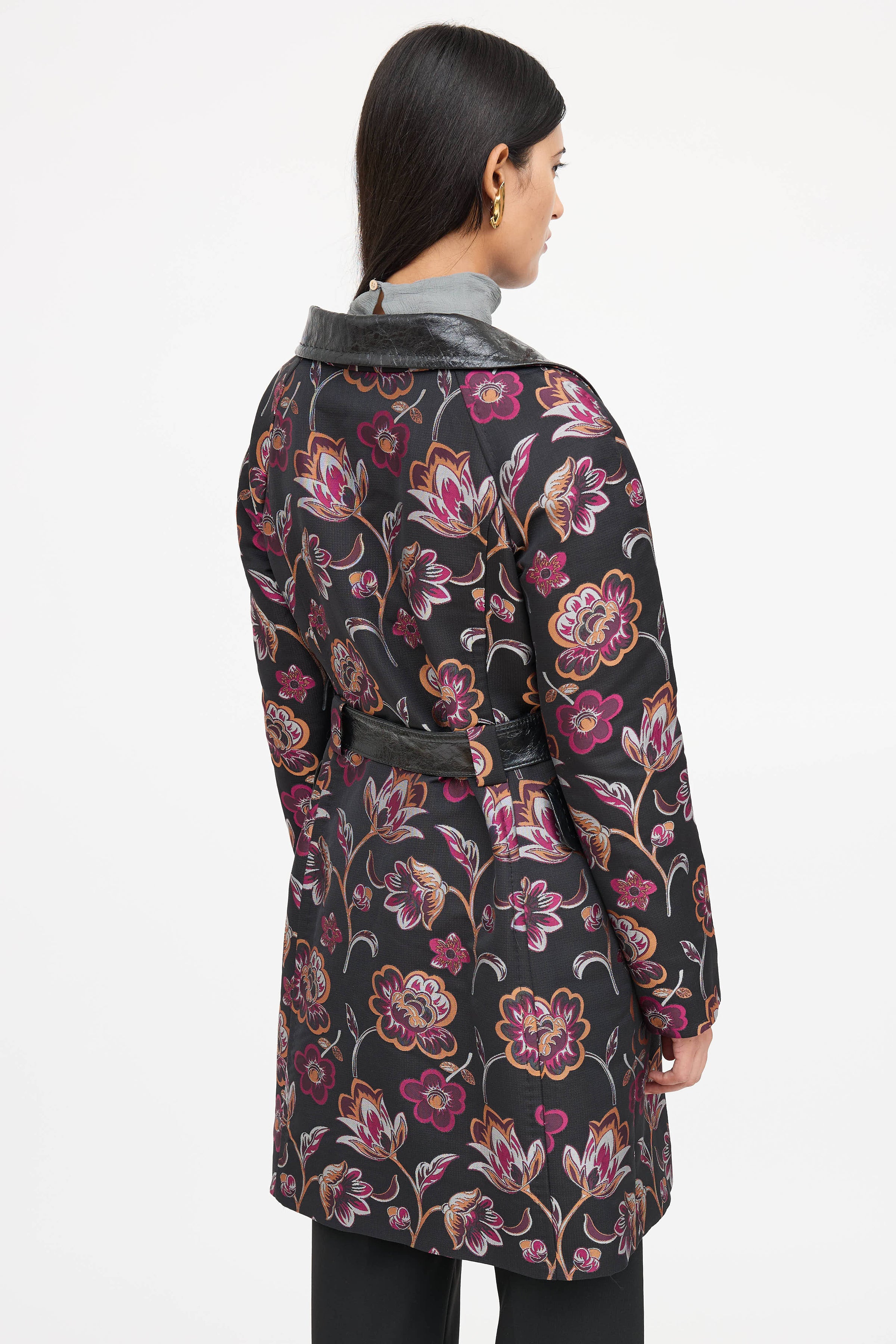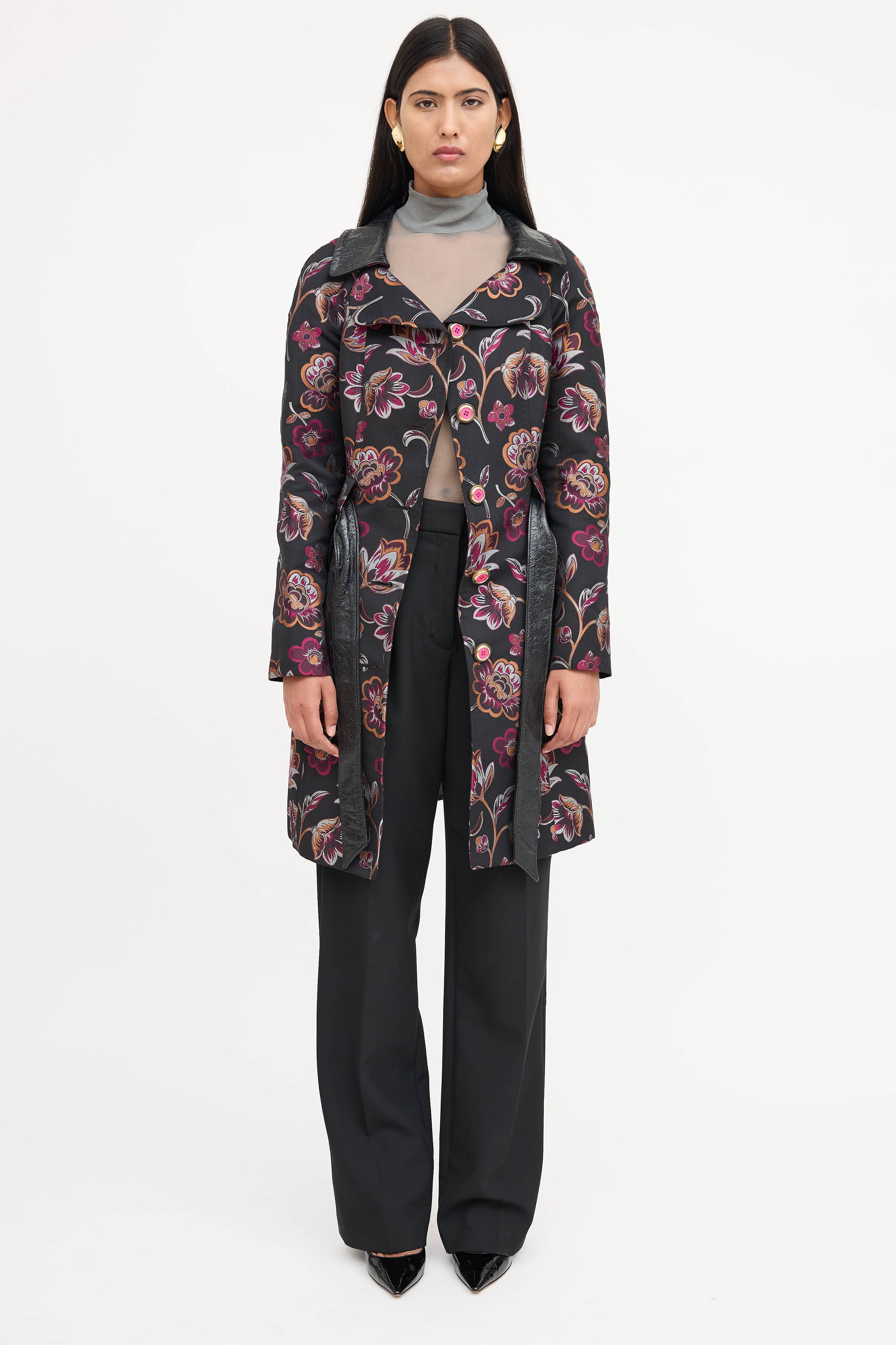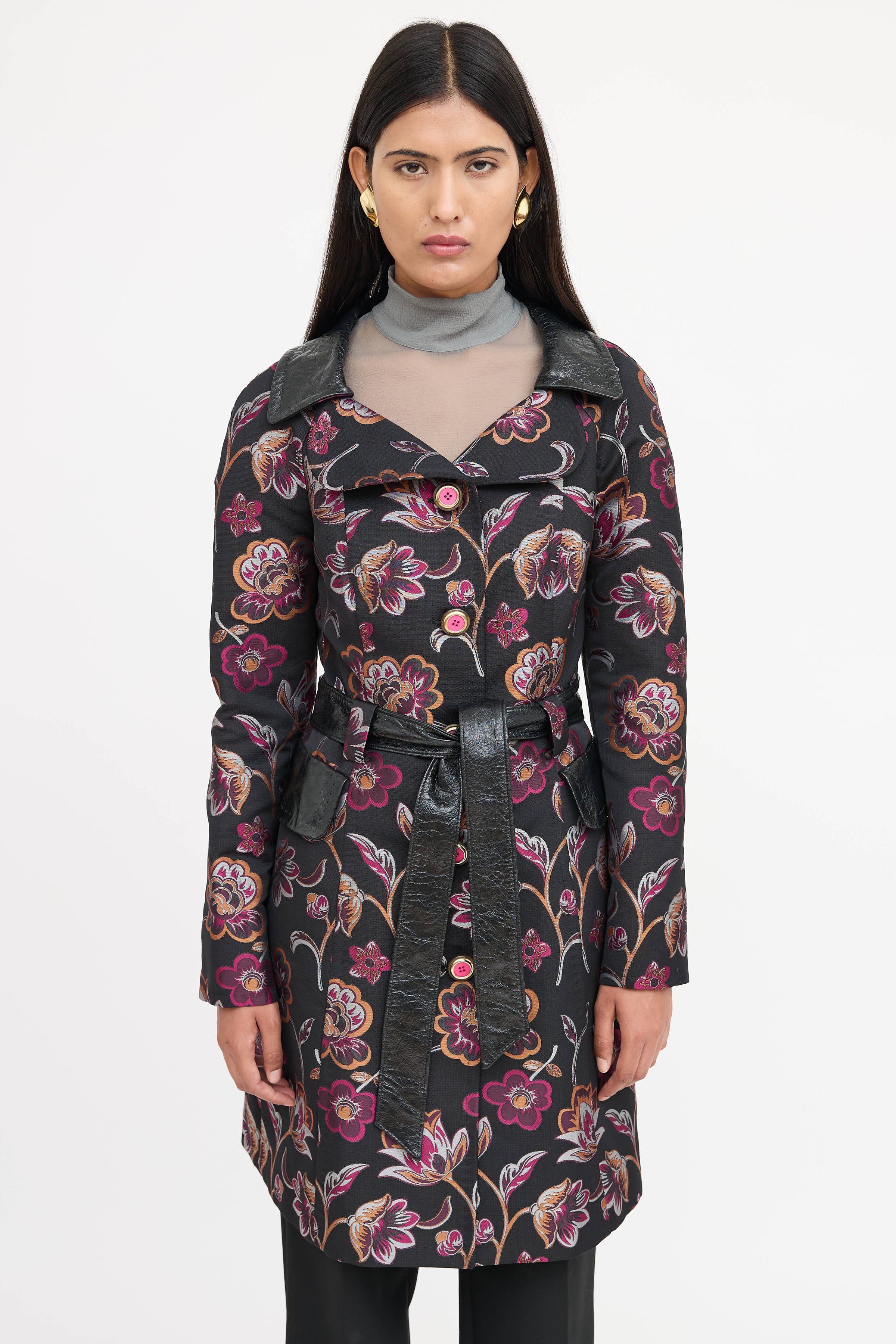 Pre-owned D&G pink and multicolor floral brocade long sleeve coat featuring pointed round collar, leather trimming, button front, belted waist, and flap pockets at front. Lined.