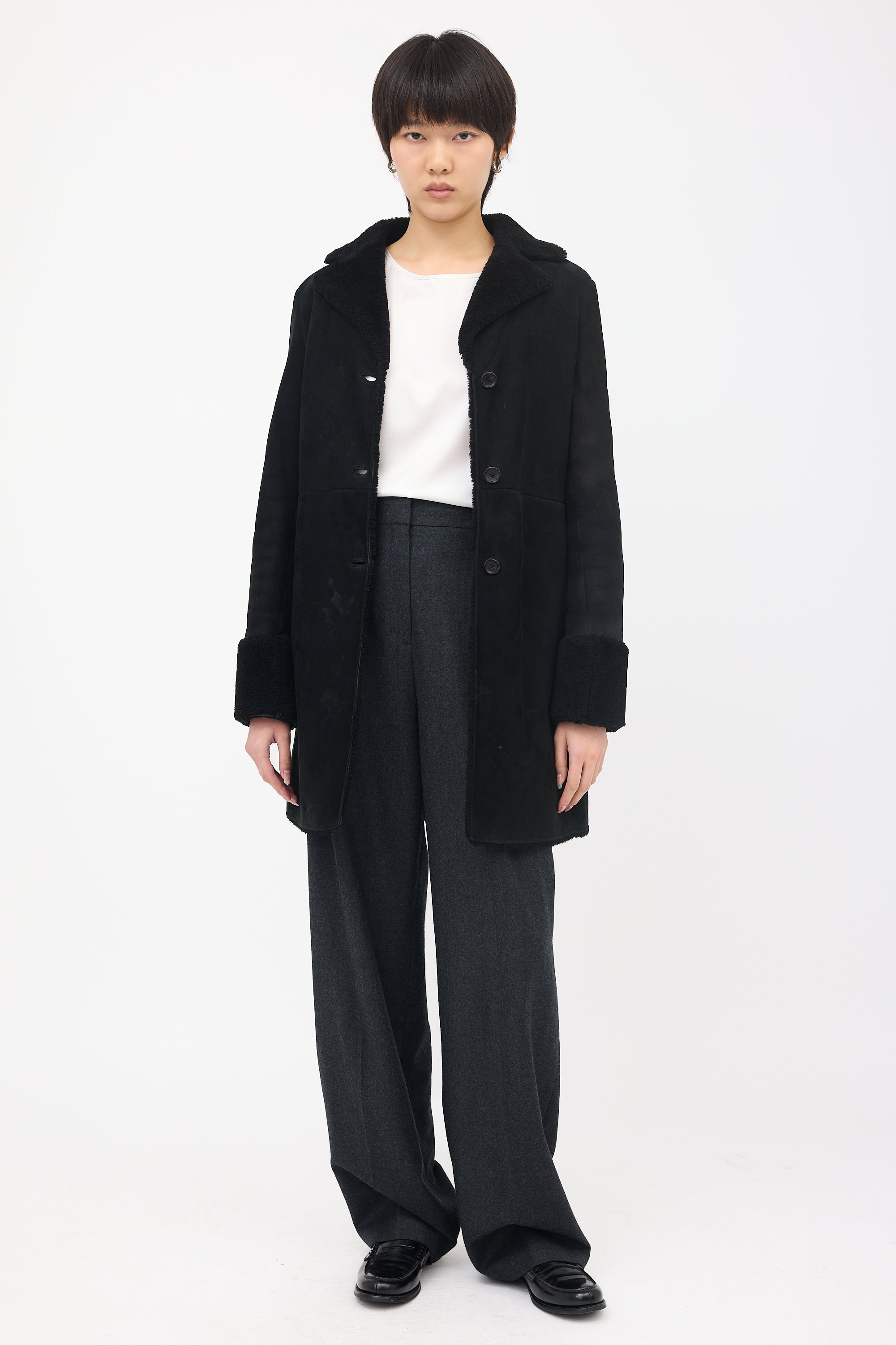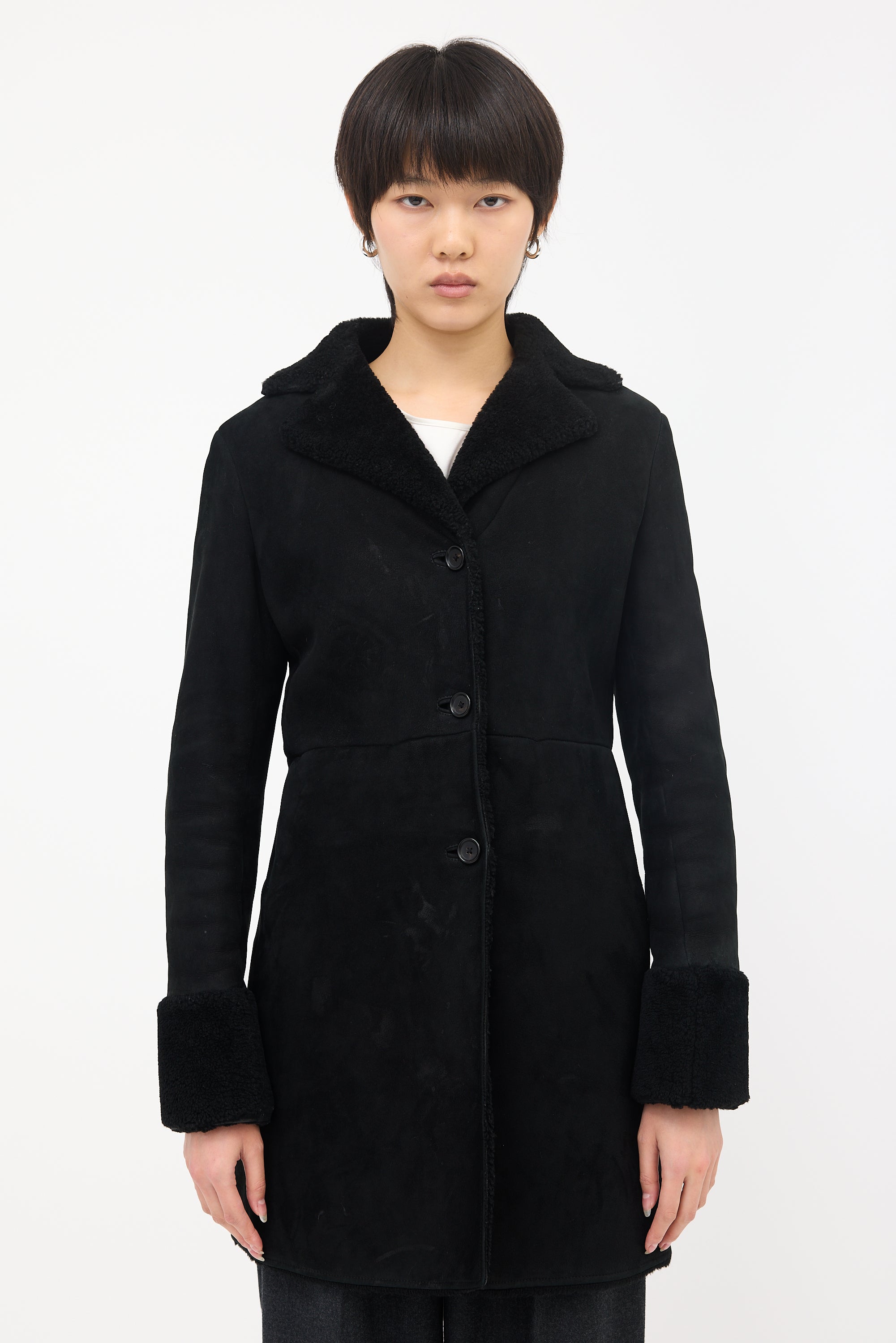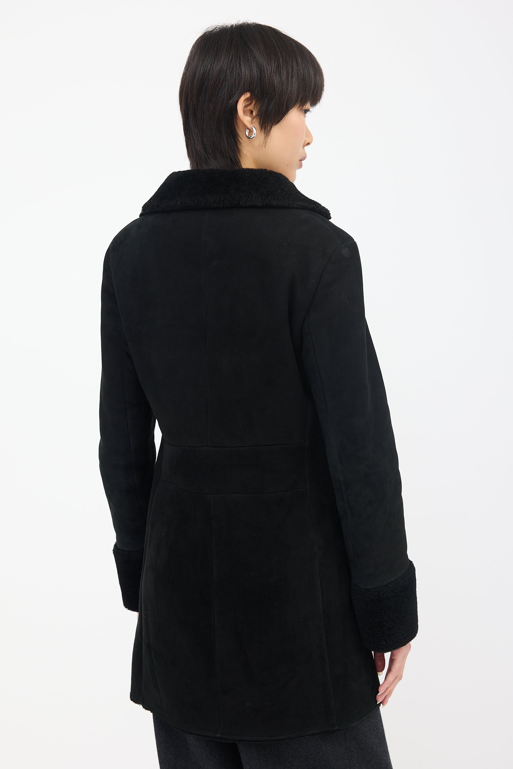 Pre-owned Jil Sander black suede shearling coat featuring a notched lapel, button front, paneled construction, two inseam pockets, and shearling trimmed cuffs.