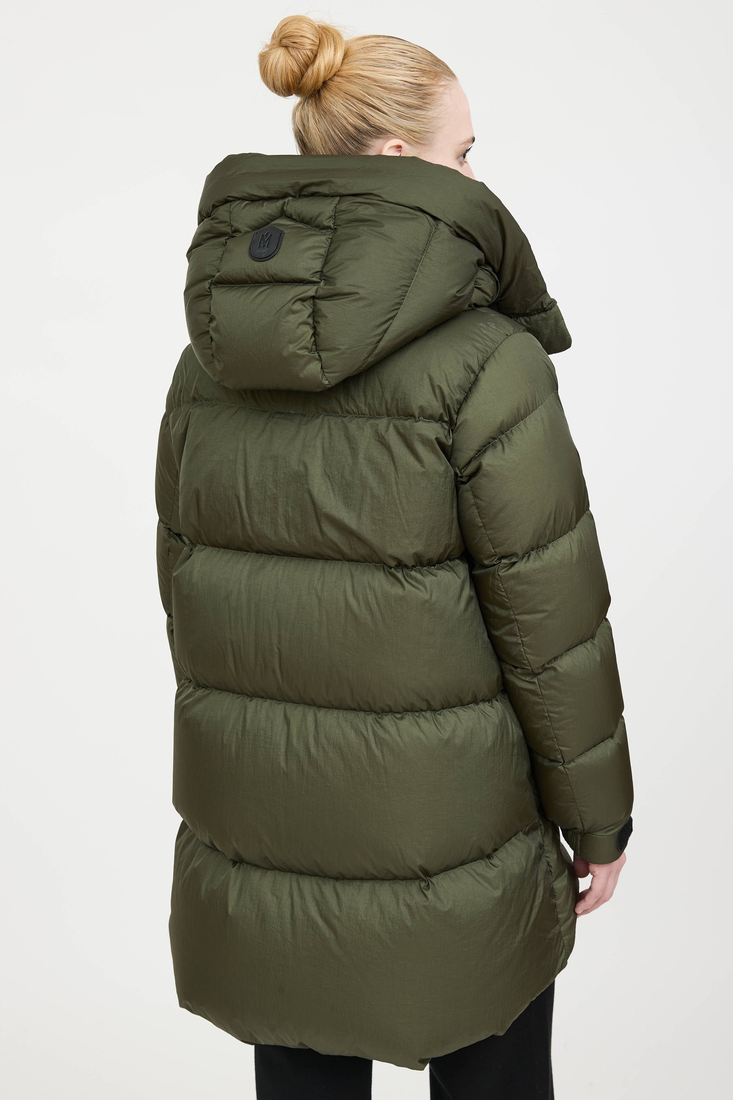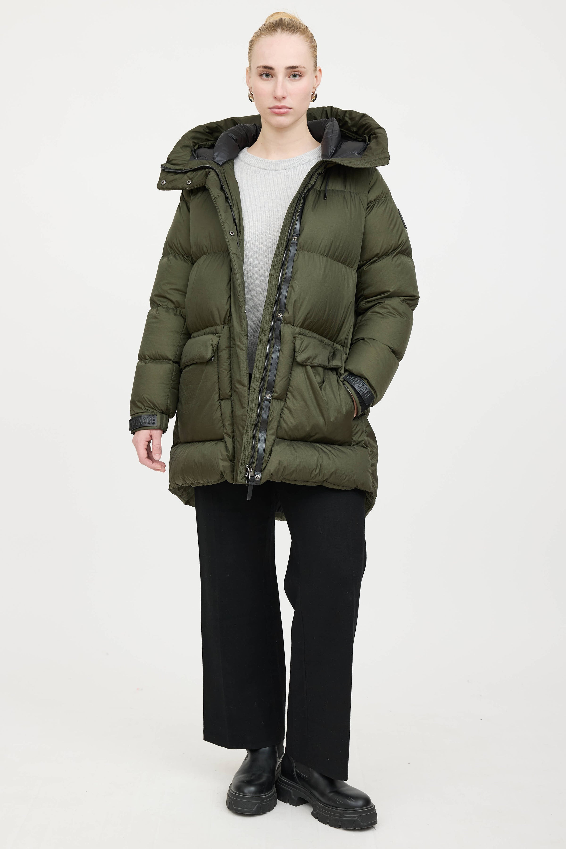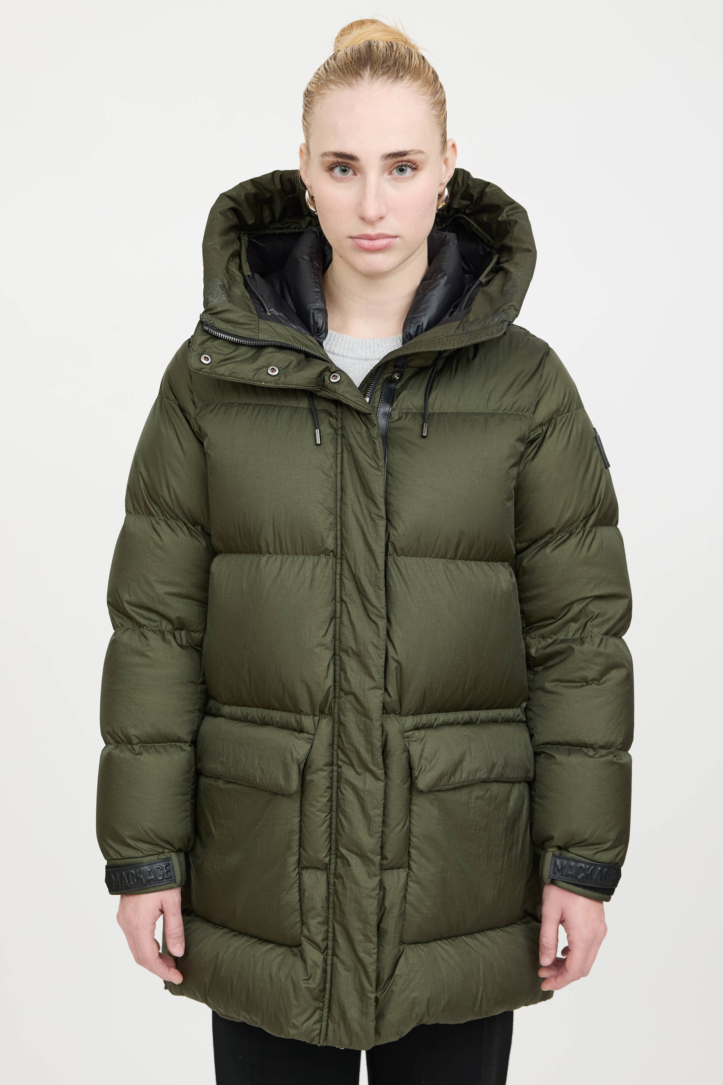 Pre-owned Mackage green Maisie foil shield down jacket featuring a funnel neck collar with drawstring hood, long sleeves, embroidered logo patch at shoulder, two flap pockets at hip, faux leather trim, and zip closure. Lined.