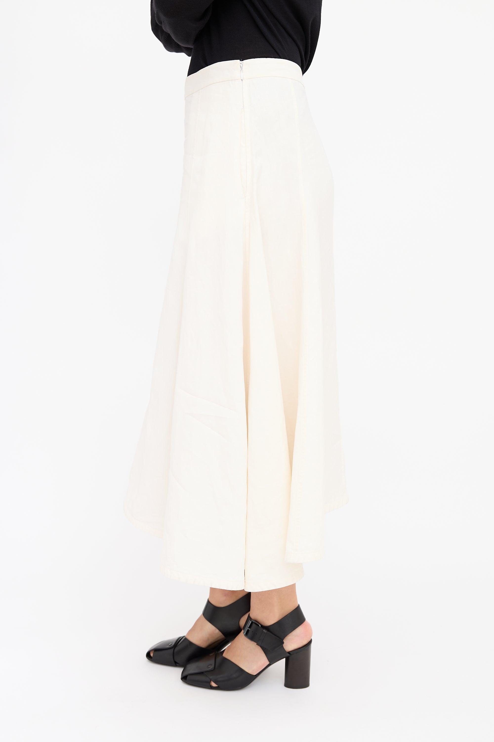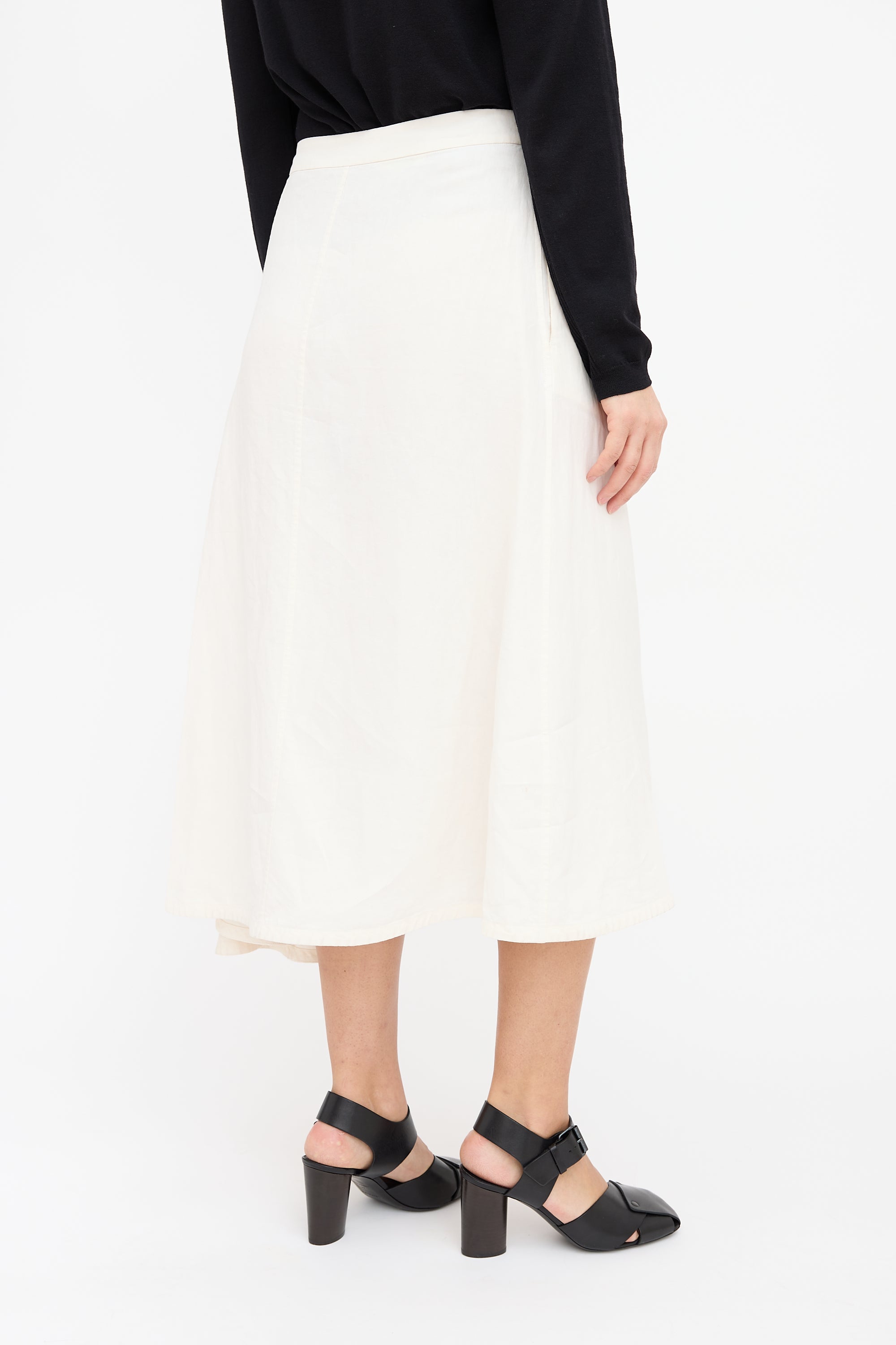 Pre-owned Jil Sander cream linen skirt featuring two inseam pockets, side zip closure with hook fastening, and a asymmetrical hem.