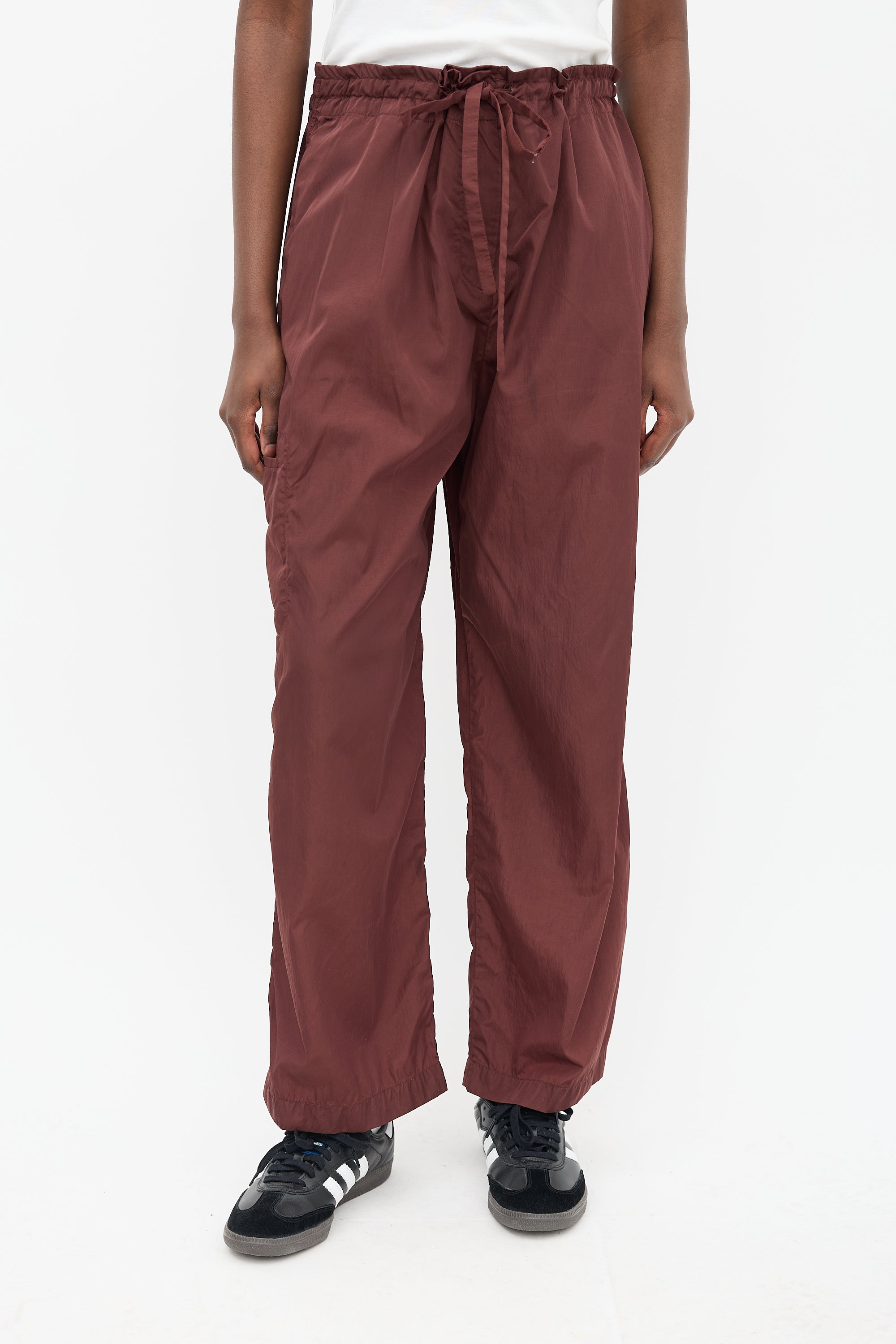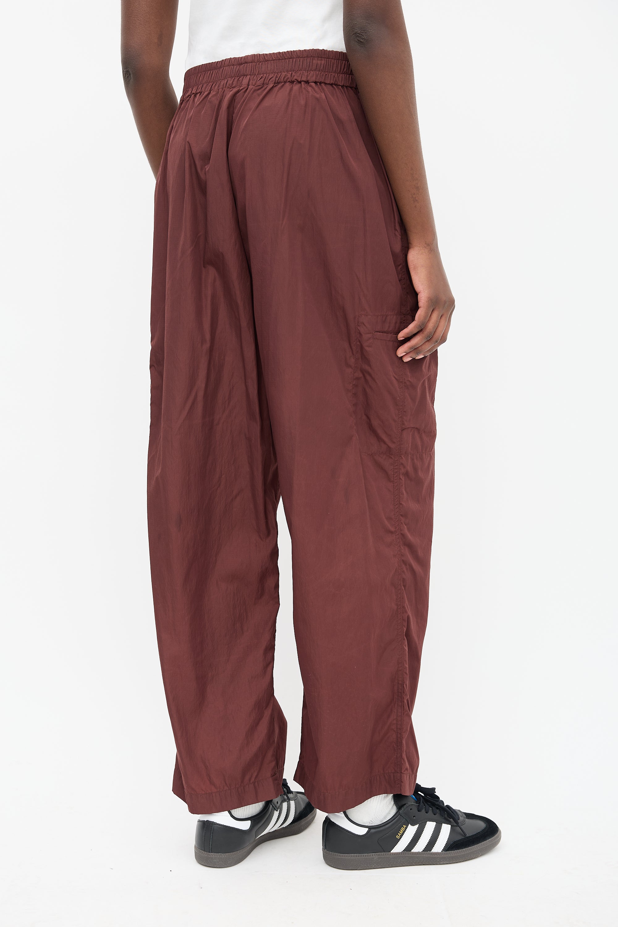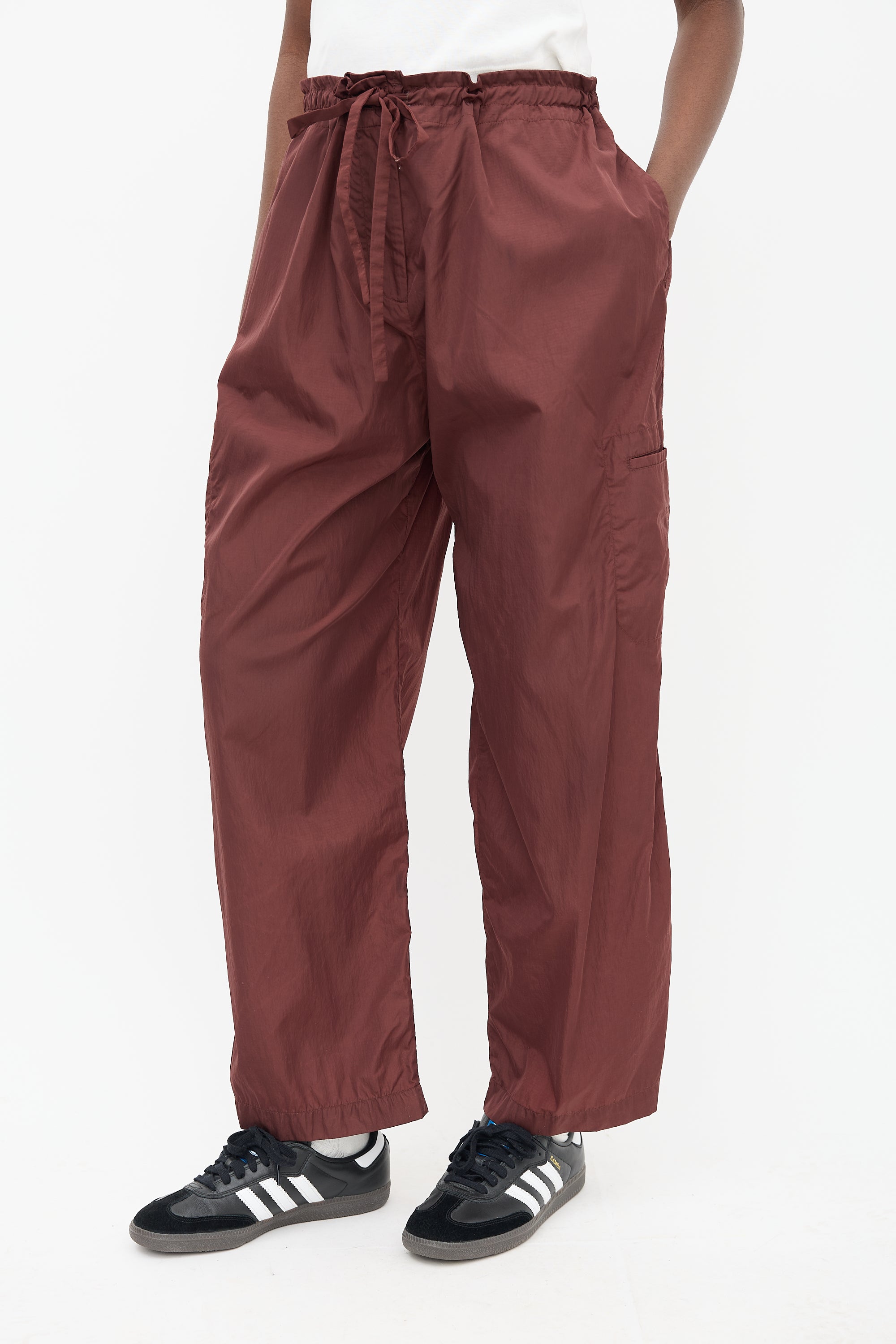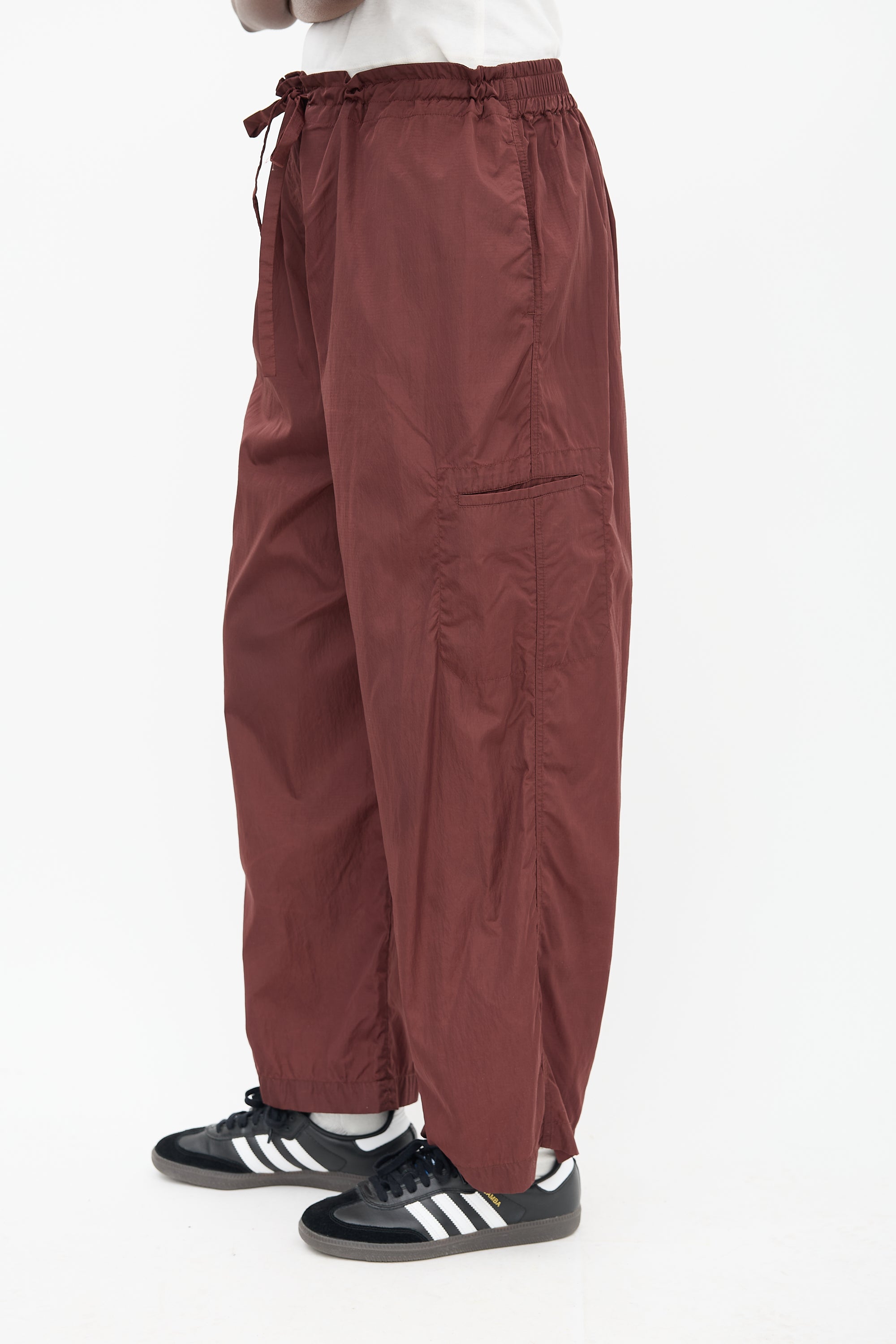 Pre-owned Studio Nicholson burgundy nylon Merida trousers featuring an elasticized drawstring waist, straight leg, in seam pockets, and two cargo pockets at outseam.