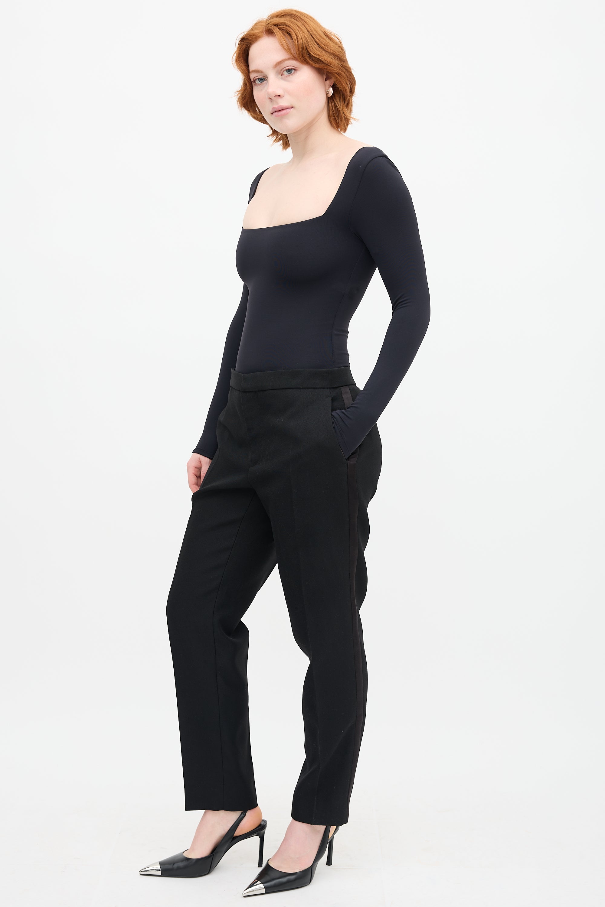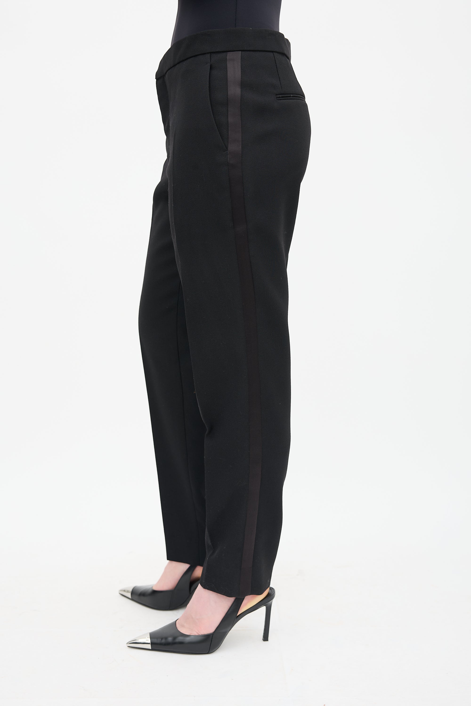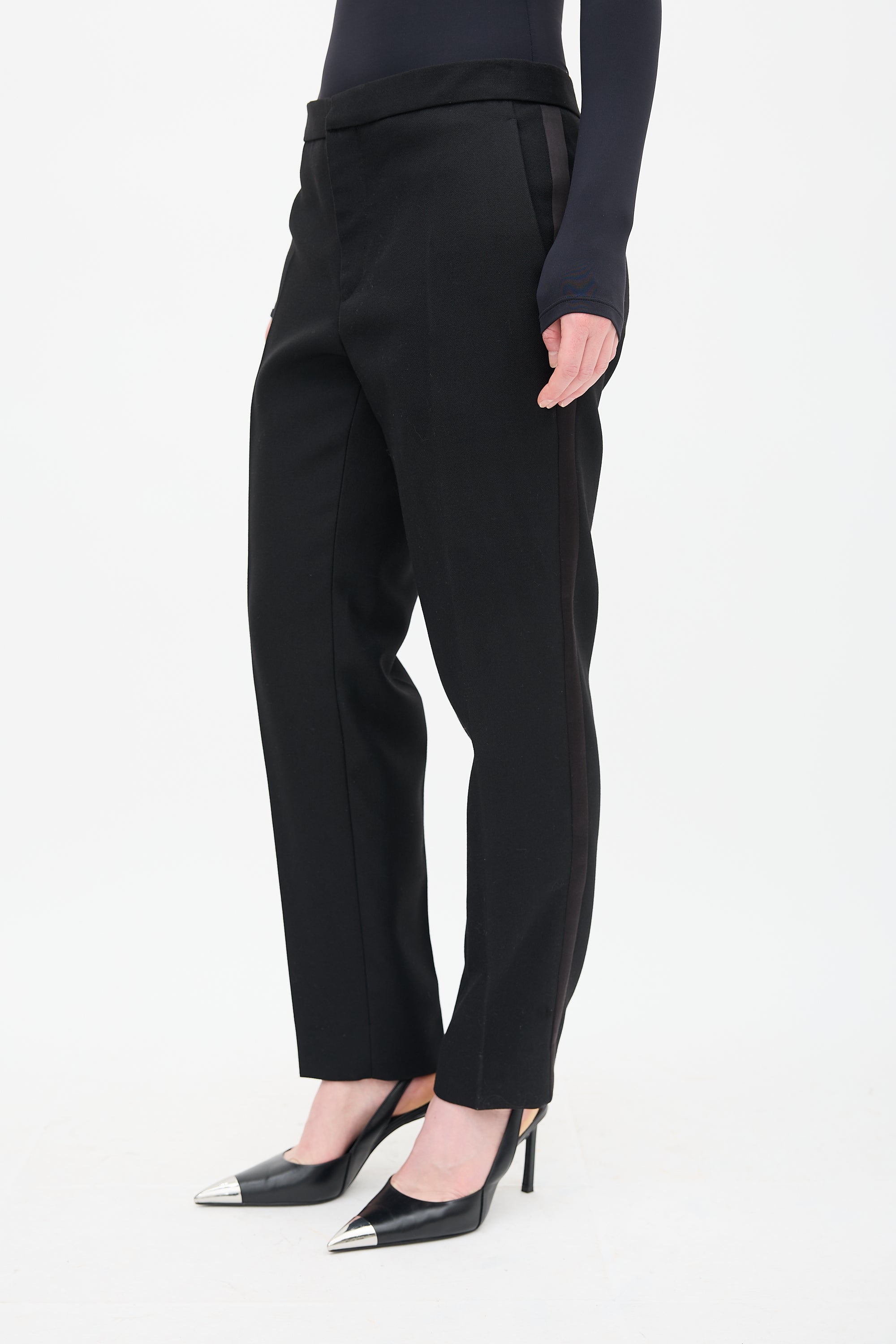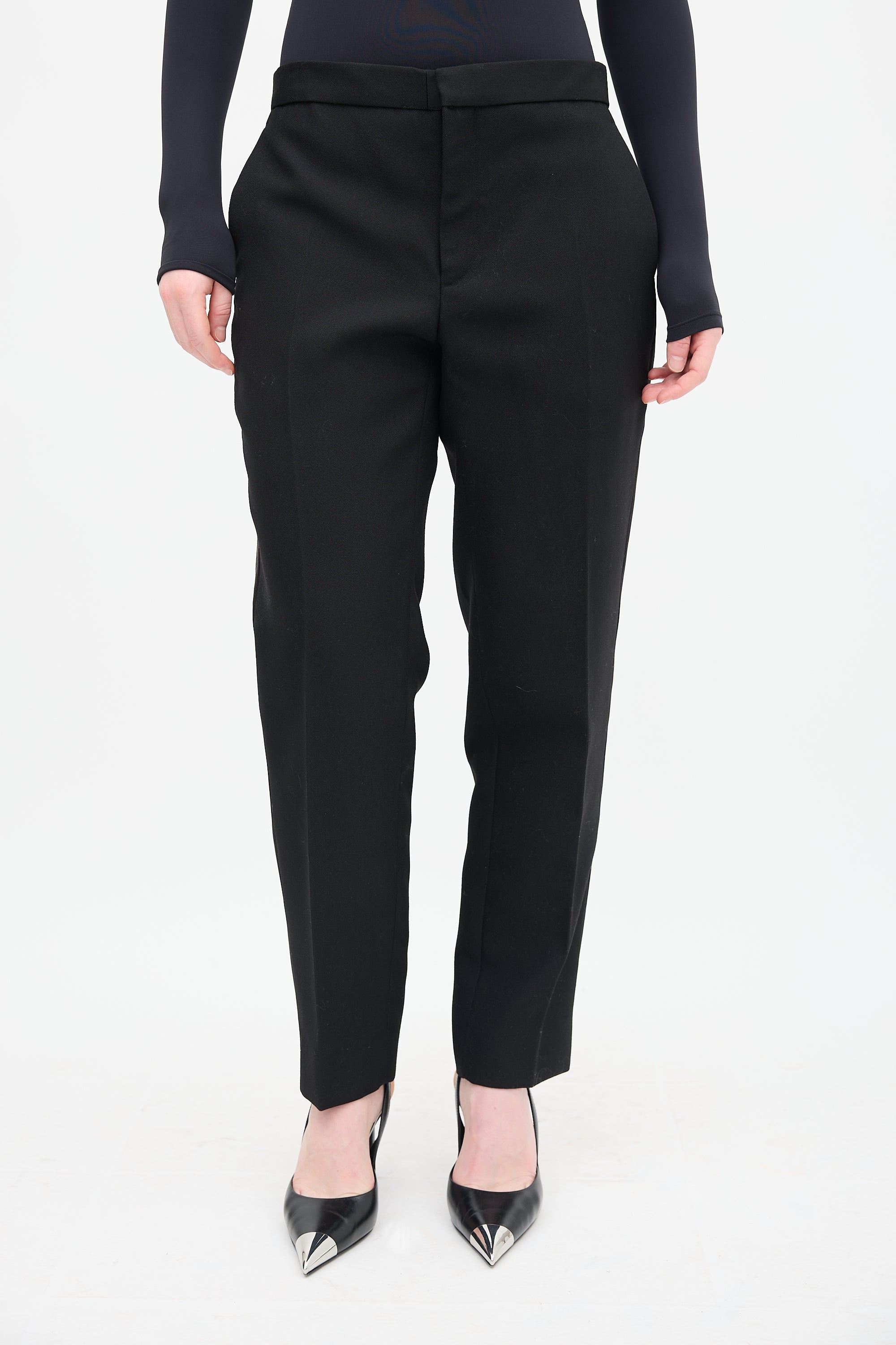 Pre-owned WARDROBE.NYC black wool trouser featuring zip fly with hook and eye fastening, two slash pockets at hips, two welt pockets at back, silk side stripe, and creased tapered leg. Clipped to fit model.