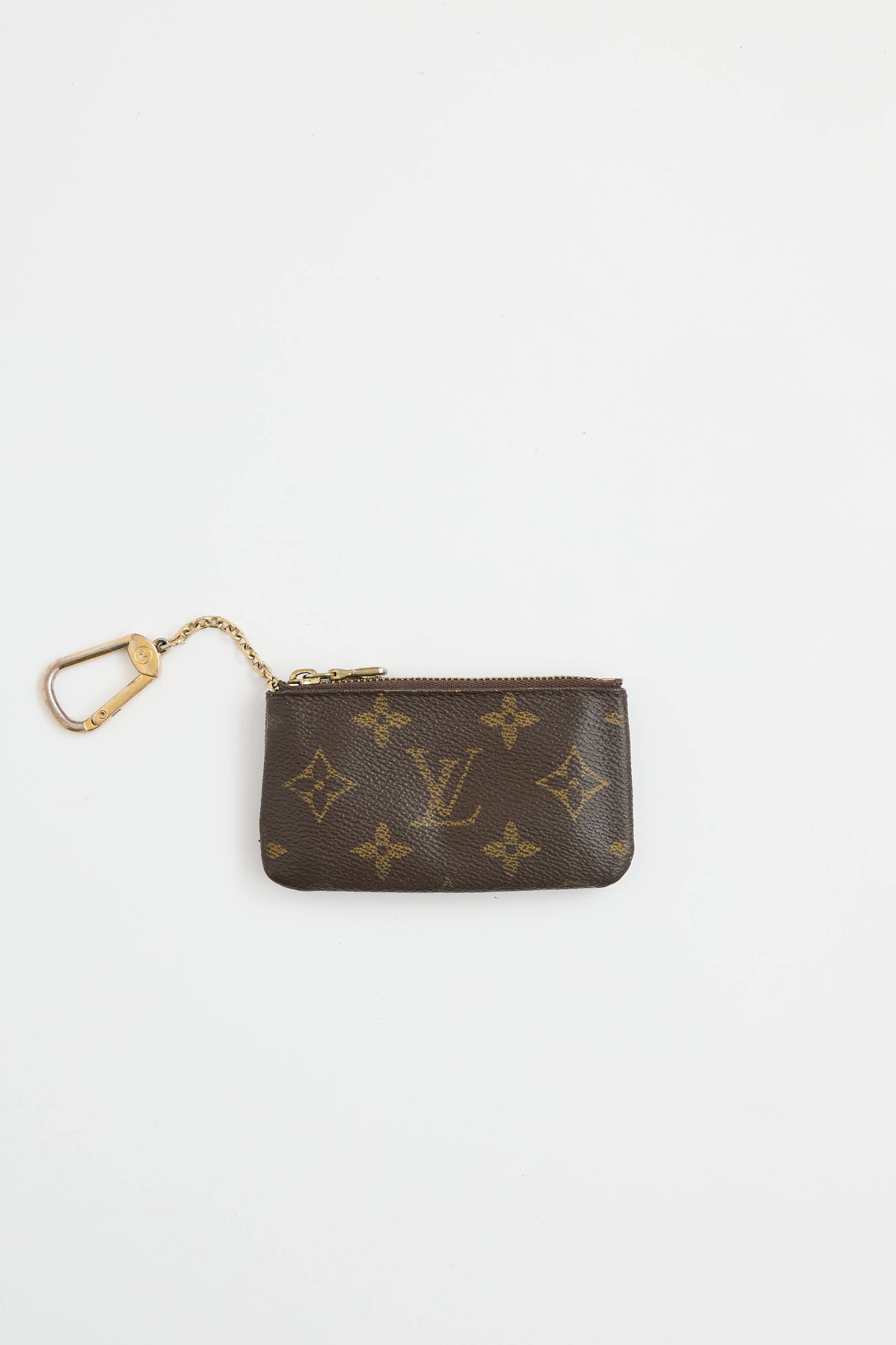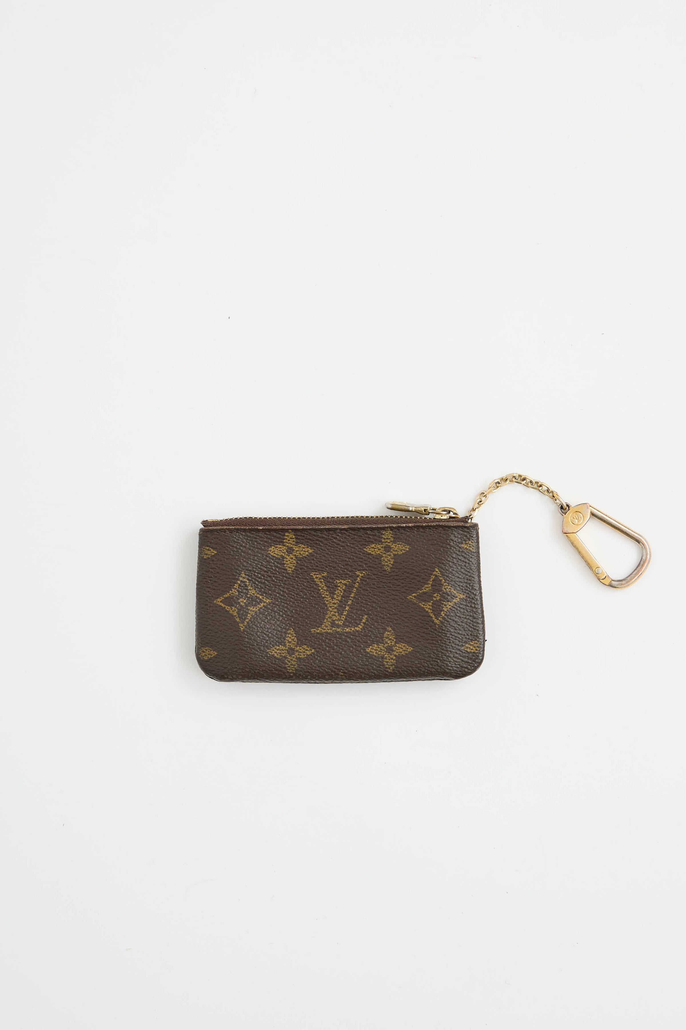 Pre-owned Louis Vuitton brown Key Pouch featuring monogram coated canvas, gold tone hardware, zip closure, key clasp, and one main compartment.