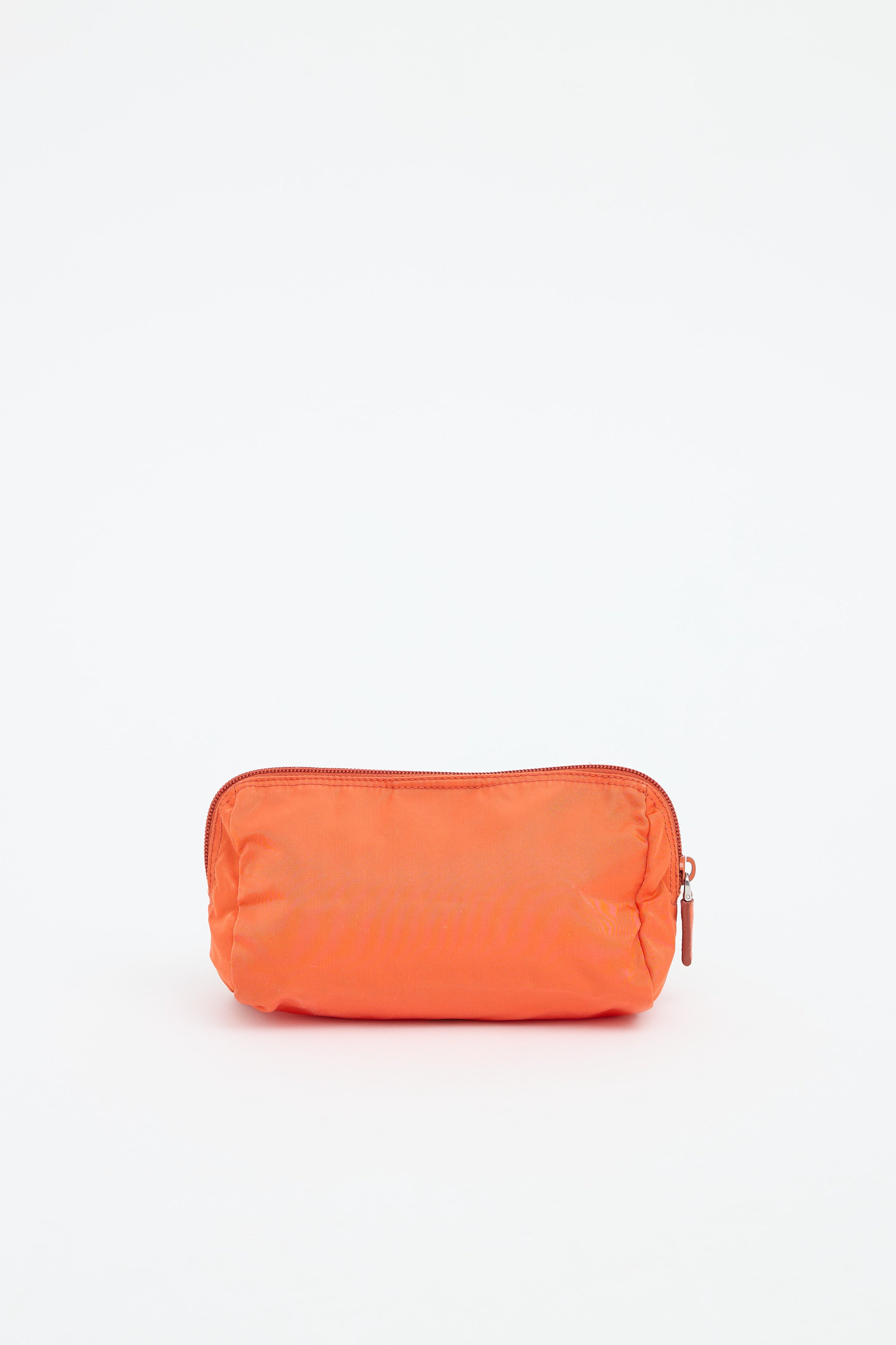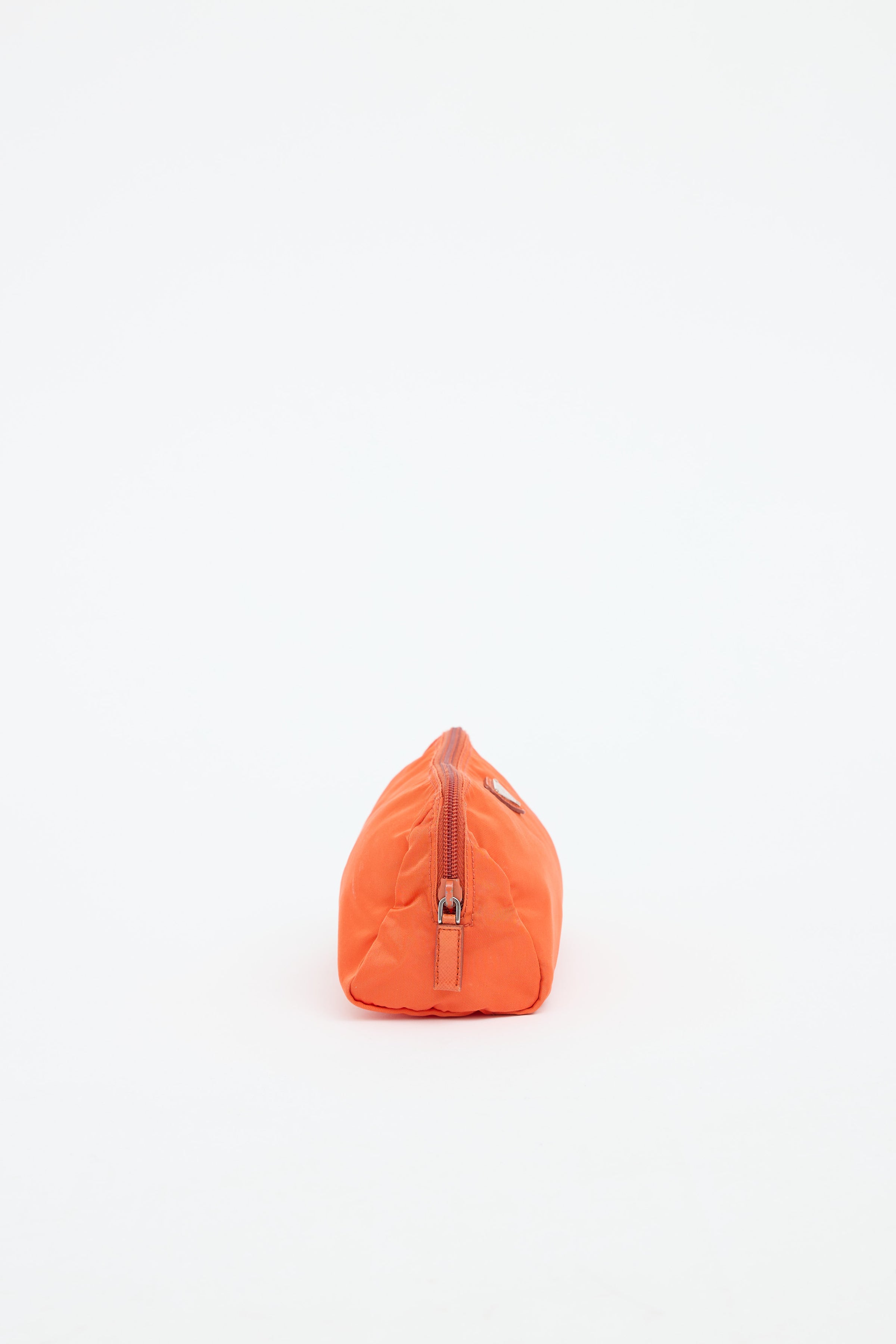 Pre-owned Prada cosmetic pouch featuring orange nylon exterior, signature Prada triangle plaque at front and top zip closure with Saffiano leather pull tab. Interior features one main compartment and one zip pocket.