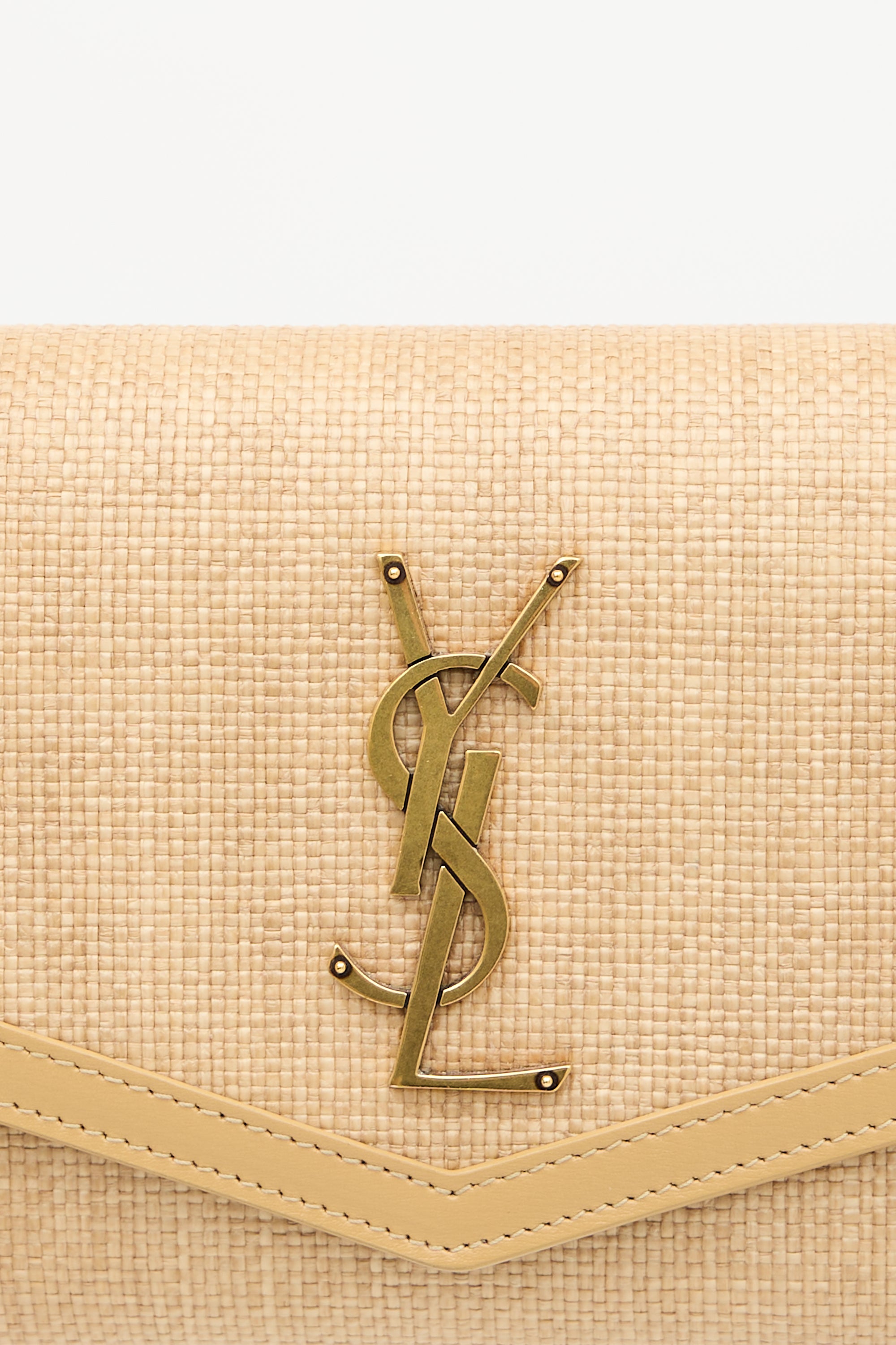 Pre-owned Saint Laurent beige micro raffia Uptown pouch featuring gold tone hardware, detachable chain shoulder strap, signature Cassandre logo at top flap, snap button closure, leather trims, and one lined main compartment with one slip pocket. Comes with original dust bag.