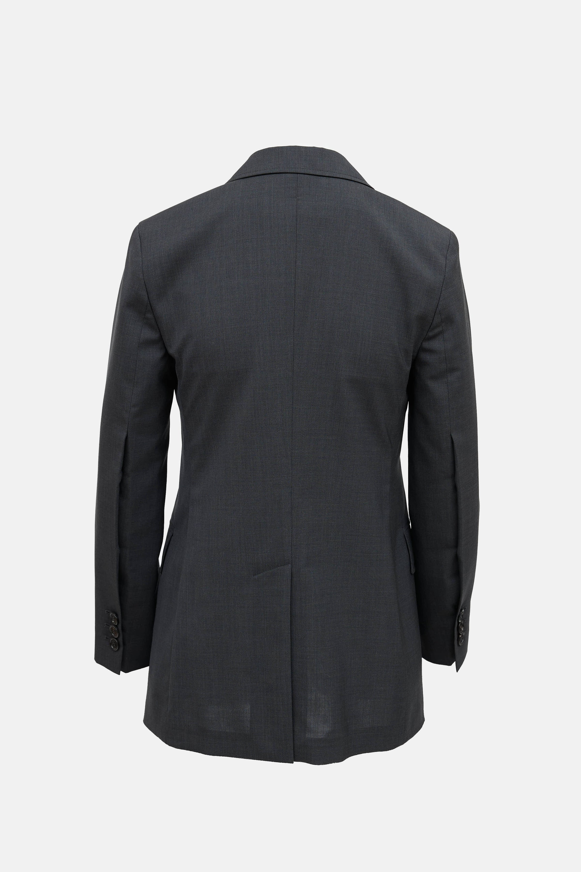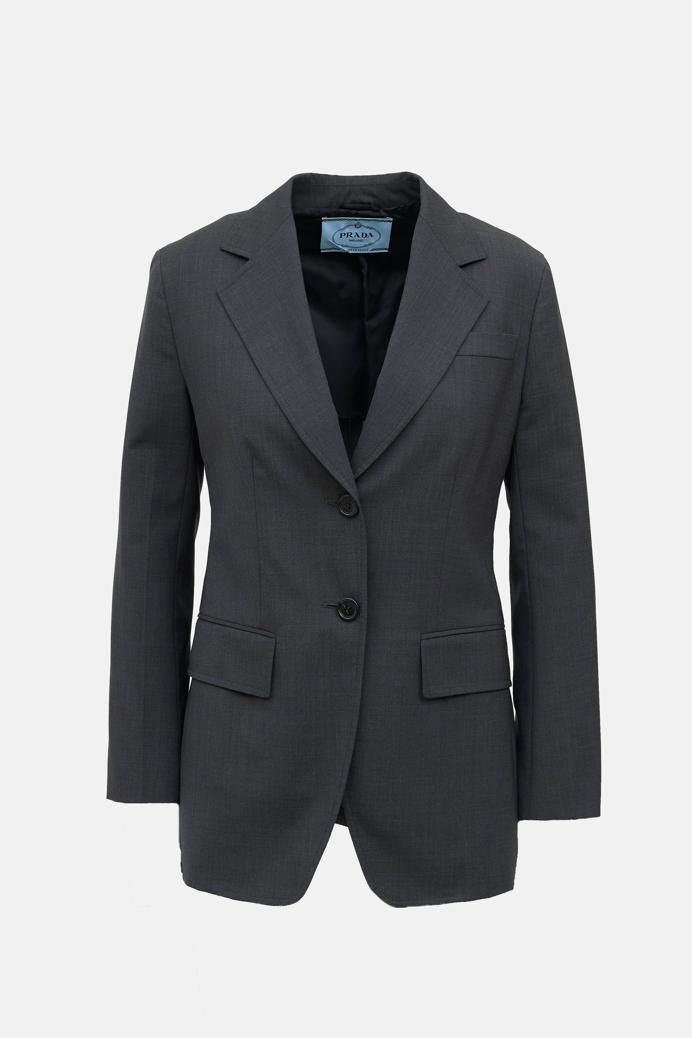 Pre-owned Prada black long sleeve blazer featuring notched lapel collar, welt pocket at chest, dual button closure, flap pockets at front, slit at back hemline, and buttoned cuffs.